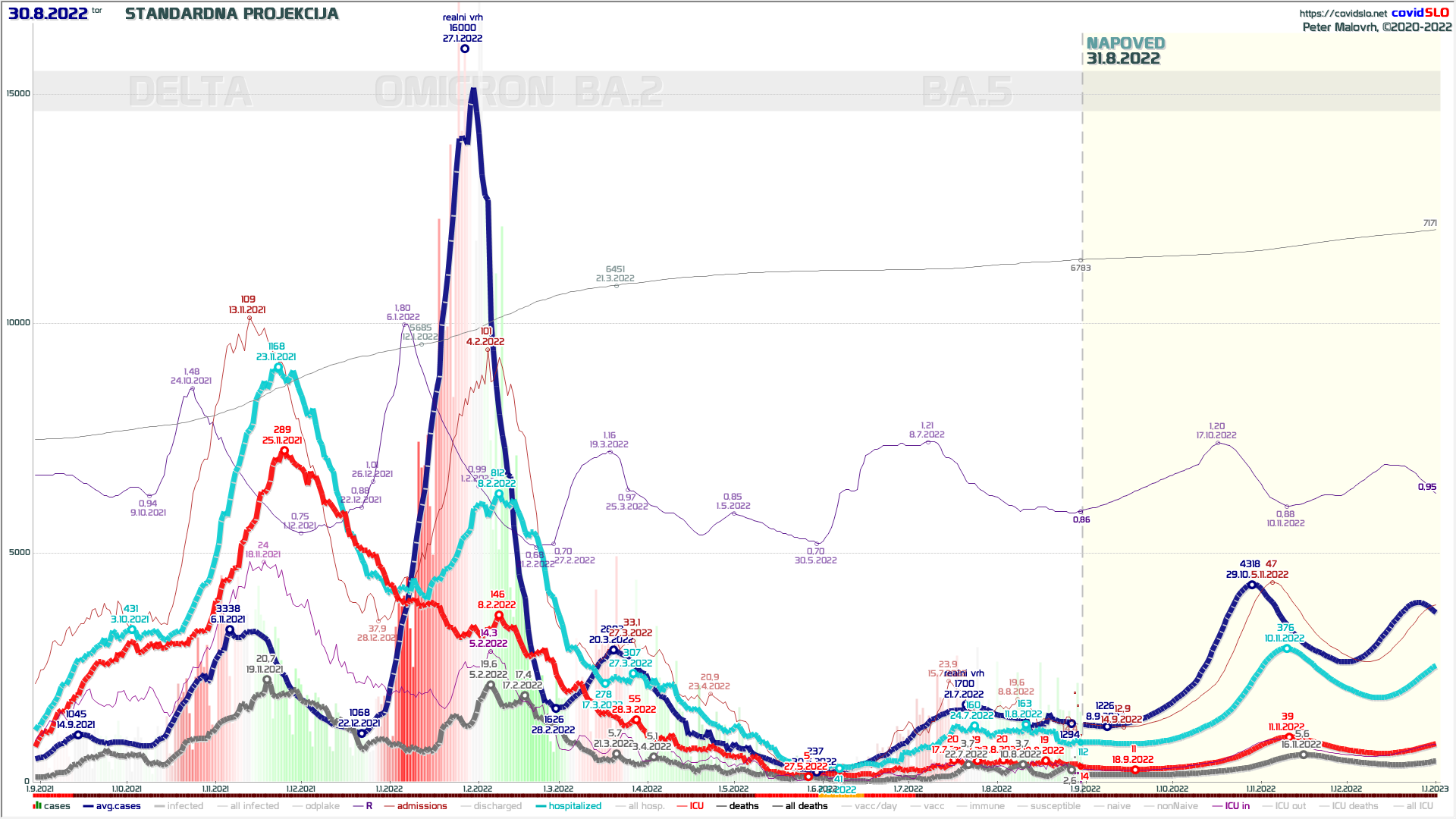 ICU: trenutno 16 (11 zaradi covid, 5 s covid), max je bilo 20 17.7. in 3.8., oziroma 19 25.7. sledi nivo 110-130 do sredine septembra, to je do resnega pričetka jesenskega vala v septembru