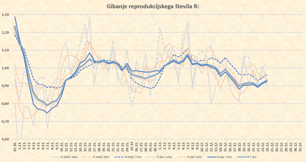 V Sloveniji je praktično nemogoče najti obdobje takih konstantnih razmer. Vedno se kaj spreminja. A obdobje od konca novembra do danes je vseeno soliden približek takih razmer. Ni bilo nobenih novih ukrepov ali sproščanj, in ljudje so že navajeni. Vemo, od danes (22.12.2020) naprej se pri nas začne izvajati množično testiranje in to bo v javljenih podatkih vneslo določeno stopnjo šuma. Vemo tudi, da se je s 1.12. med testi začelo pojavljati večje število verificiranih hitrih testov, kar je navidezno dvignilo delež pozitivnih. Pred tem pa smo od nekje 20.11.2020 že imeli nekako mirno obdobje rahlo padajočega R. Ocenjujem, da je 22.11.2020 (tZ) z RZ=1.0257 dokaj zanesljiva osnova za začetno točko intervala, v katerem bomo računali. Kot končna točka bo vzet 20.12.2020 (t2) z R2=0.9169.