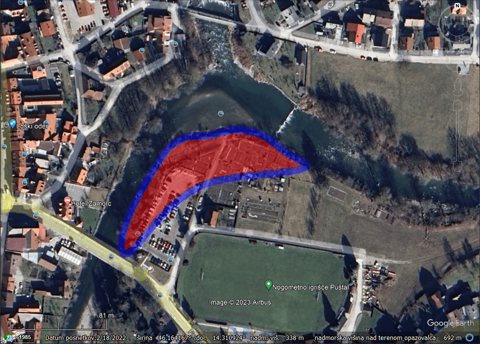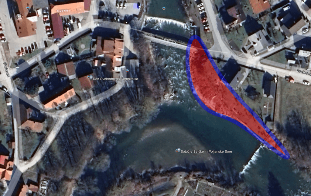 Parkirišče je voda avgusta 2023 poplavila, par avtomobilov je plavalo, enega je odneslo na rob parkirišča. Kot omenja gospod Anton Jamnik v svojem opisu, se je na tem mestu v preteklosti veliko nasipavalo in s tem ožalo strugo. Tu sotočje lahko pridobi veliko volumna, če brežino na približno označenem mestu postopno spustimo do nivoja struge. Nivo vode bi bil ob takih dogodkih potem bistveno nižji. Pri tem bo verjetno treba ustrezno poskrbeti za stabilnost Puštalskega mosta.