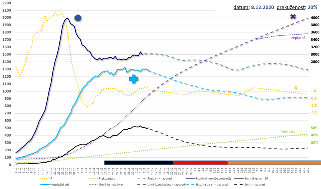 Vidimo, da prvi pogoj 1200 hospitaliziranih za prehod v rdečo fazo dosežemo okoli 16.12.2020. S ponedeljkom 21.12.2020 bi tako lahko uveljavili rdečo fazo. S tem pa se od tega datuma naprej stiki med ljudmi nekoliko povečajo. To pomeni, da nam je to sproščanje iz rdeče faze dvignilo reprodukcijski faktor za določen delež. Iz znanstvenih člankov in iz analize učinka dosedanjih naših ukrepov sem po najboljših močeh približno ocenil skupen učinek sproščanja iz določene barvne faze na naslednje relativno povečanje trenutnega reprodukcijskega števila R: rdeča +8%, oranžna +14%, rumena +12% in zelena +15% trenutne vrednosti. Ta učinek se ob prehodu v neko fazo vnese v model, nakar se ponovno pogleda pogoje za izpolnitev prehoda v naslednjo fazo … Še enkrat poudarjam – ta povečanja R v posamezni fazi so samo najboljša možna ocena v tem trenutku.
