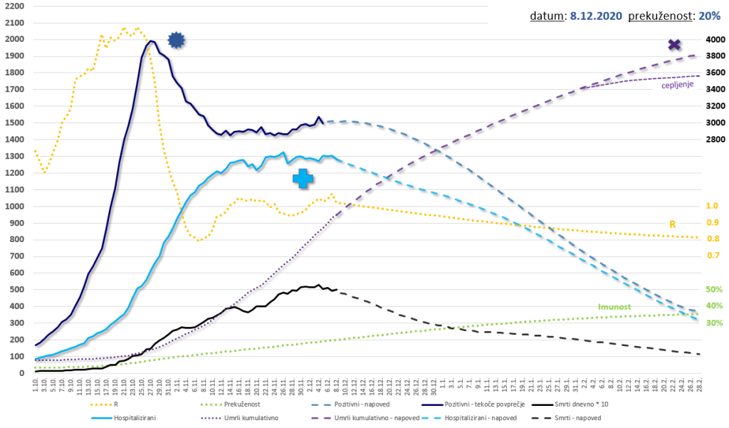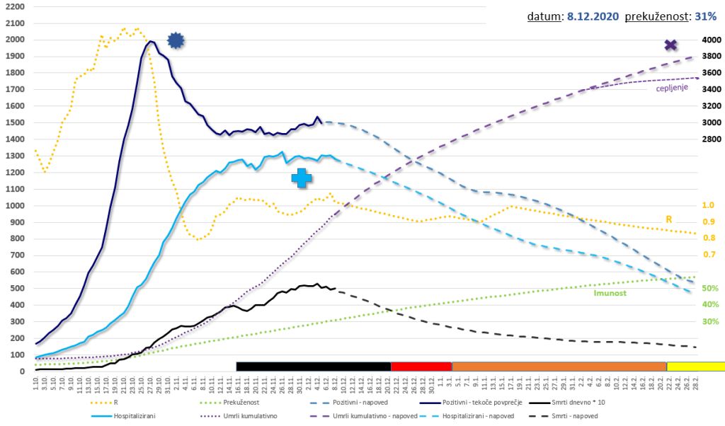 Pogledati moramo trenutno stanje naše epidemije in pogledati, kdaj izpolnimo kriterije za prehod v naslednjo barvno fazo programa sproščanja. Trenutno stanje in ocena razvoja sta približno taka, kot prikazuje graf. Krivulja novookuženih je v decembru nekaj višja zaradi večjega deleža s PCR metodo verificiranih hitrih antigenskih testov …