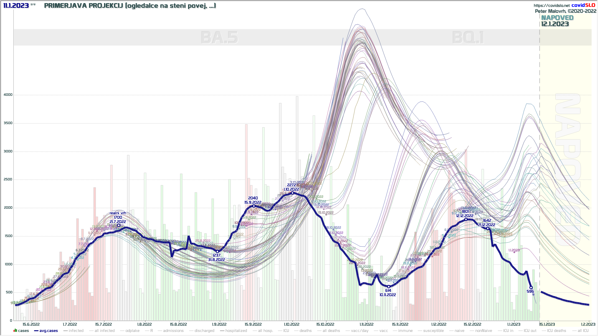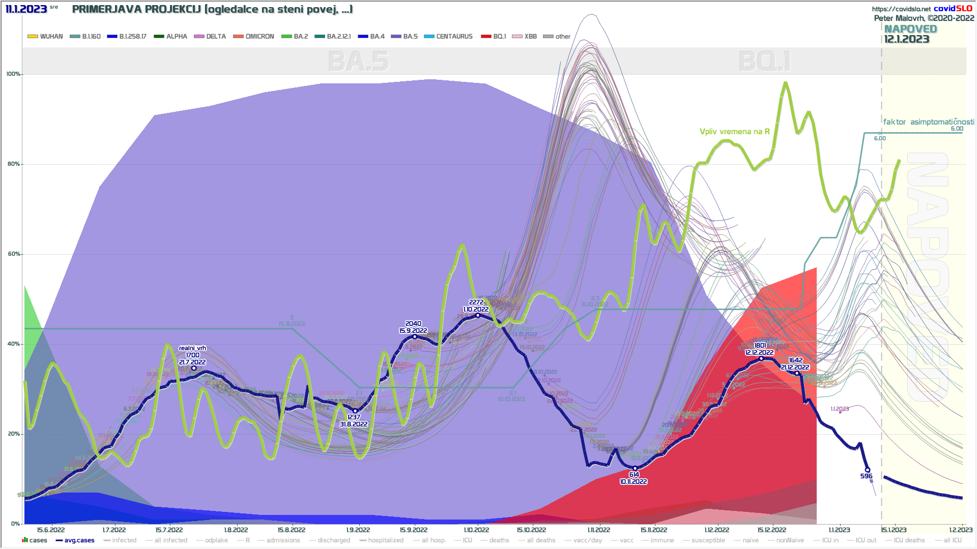 Na sliki je vidno, kako je varianta BA.5 ustvarila poletni val. Vreme in varianta BQ.1 sta ustvarila jesenski val po sredini novembra in preko novega leta, a ta iz neznanih razlogov ni presegel septembrskega vala.