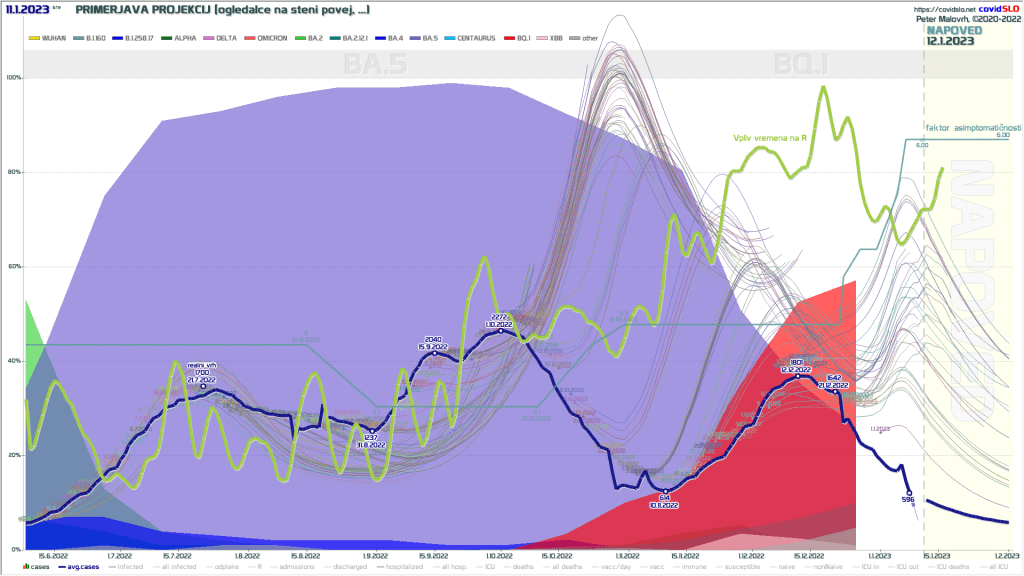 Sredi oktobra je bilo pričakovati znižanje temperatur in s tem boljše razmere za širjenje virusa, že samo zaradi fizike kapljic, kot tudi zaradi vseh posrednih efektov na obnašanje ljudi, ki so takrat potem več v zaprtih prostorih, sluznice delujejo slabše, … Jeseni 2021 smo takrat dobili zelo močan sunek navzgor. V 2022 pa kot prvo vreme ni hotelo iti po tej poti. Ko se je po prvem tednu novembra vreme odločilo, da je toplote bilo dovolj, se je krivulja zaznanih primerov iz padanja obrnila samo v blago rast, in to kljub temu, da se je sočasno pri nas že opazno širila nova različica BQ.1, nove različice pa zaradi svojih mutacij in iz tega več dovzetnih oseb tipično dvignejo R opazno navzgor. Postalo je jasno, da bo tisti pravi jesenski val šele v decembru. Glede na izkušnje je bilo pričakovati, da bo ta val zaradi zimskih razmer opazno višji od septembrskega, a se je rast ustavila že sredi decembra. To kljub temu, da so nove variante (BQ.1, Centaurus, XBB) takrat dosegale šele okoli 60% delež in je še bilo nekaj prostora za dvig R. Res je, da smo se med julijem in oktobrom z BA.5 kar dobro prekužili, ampak vseeno ni bilo pričakovati, da bi že samo to lahko ustavilo rast v sredini decembra. Moralo je biti še kaj drugega.