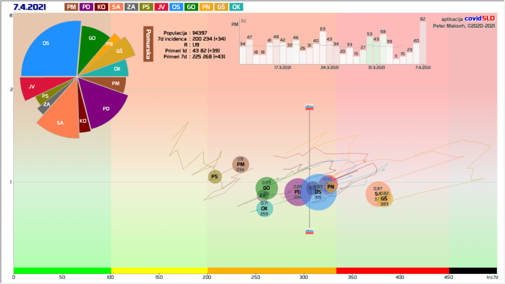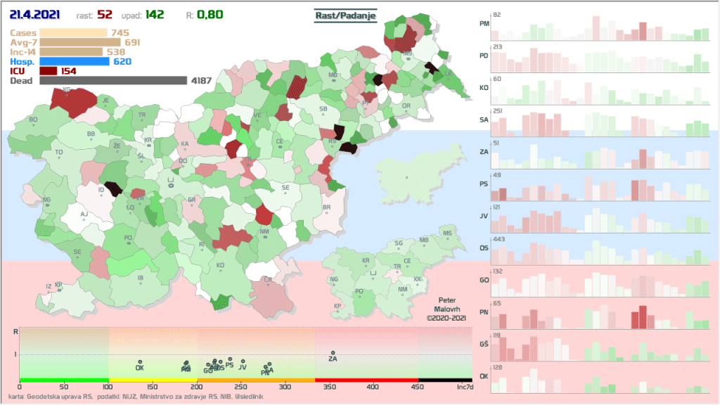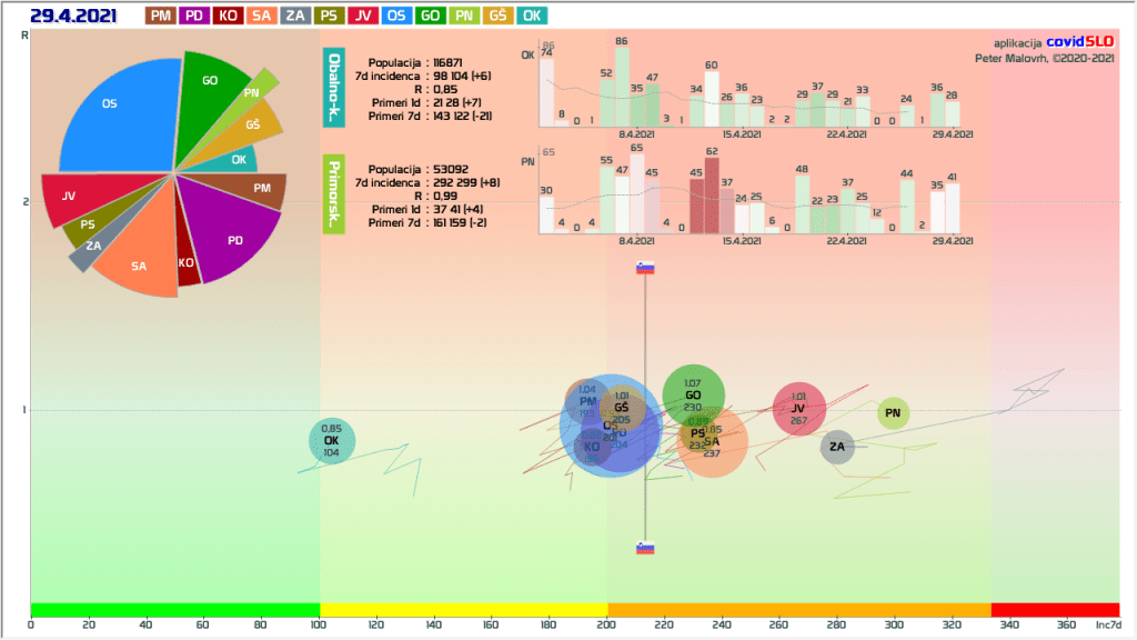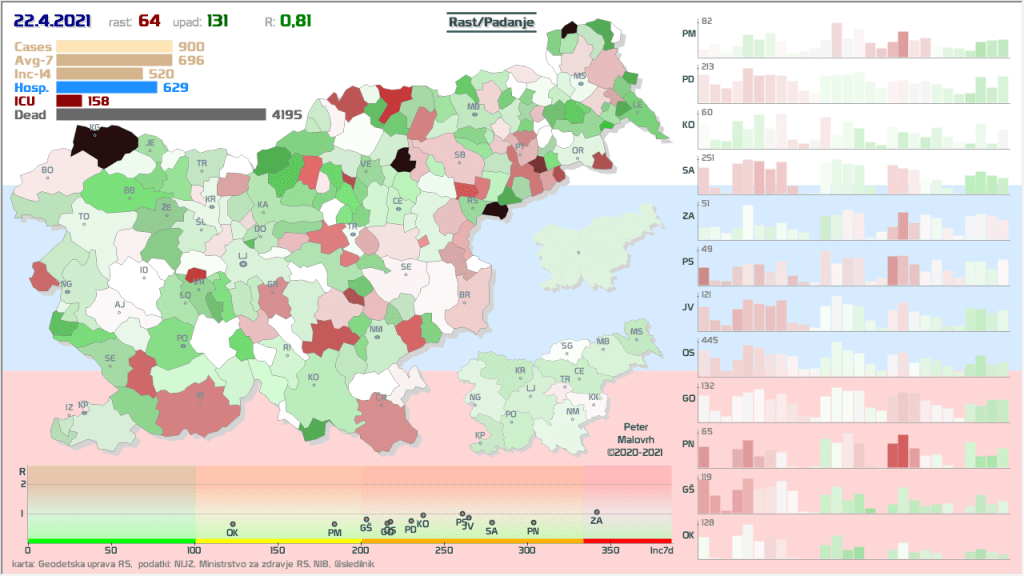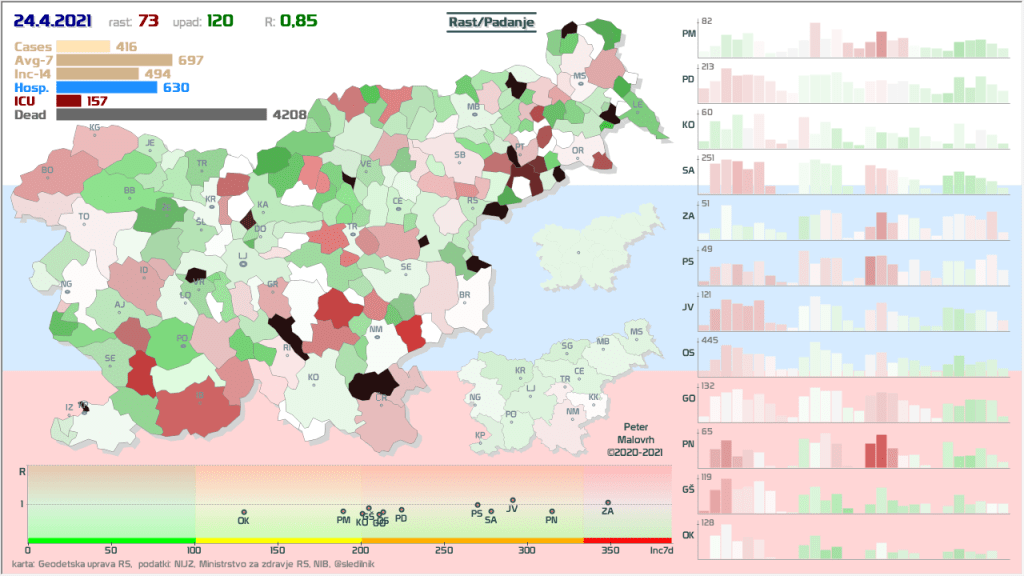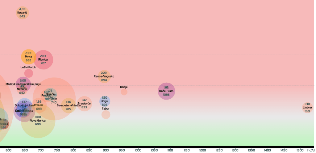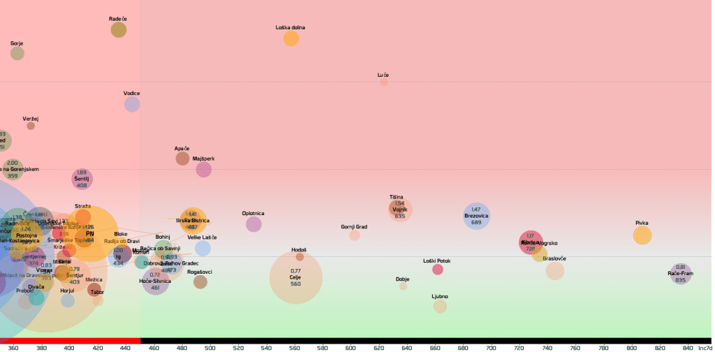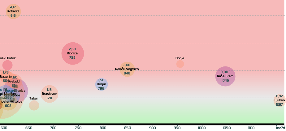 Trenutno najslabša je Goriška s katastrofo v Novi Gorici (7d incidenca /100k 762) in Šempetru (673), kjer pa je Idrija celo v zelenem območju (incidenca 85). Vipava se je precej popravila.