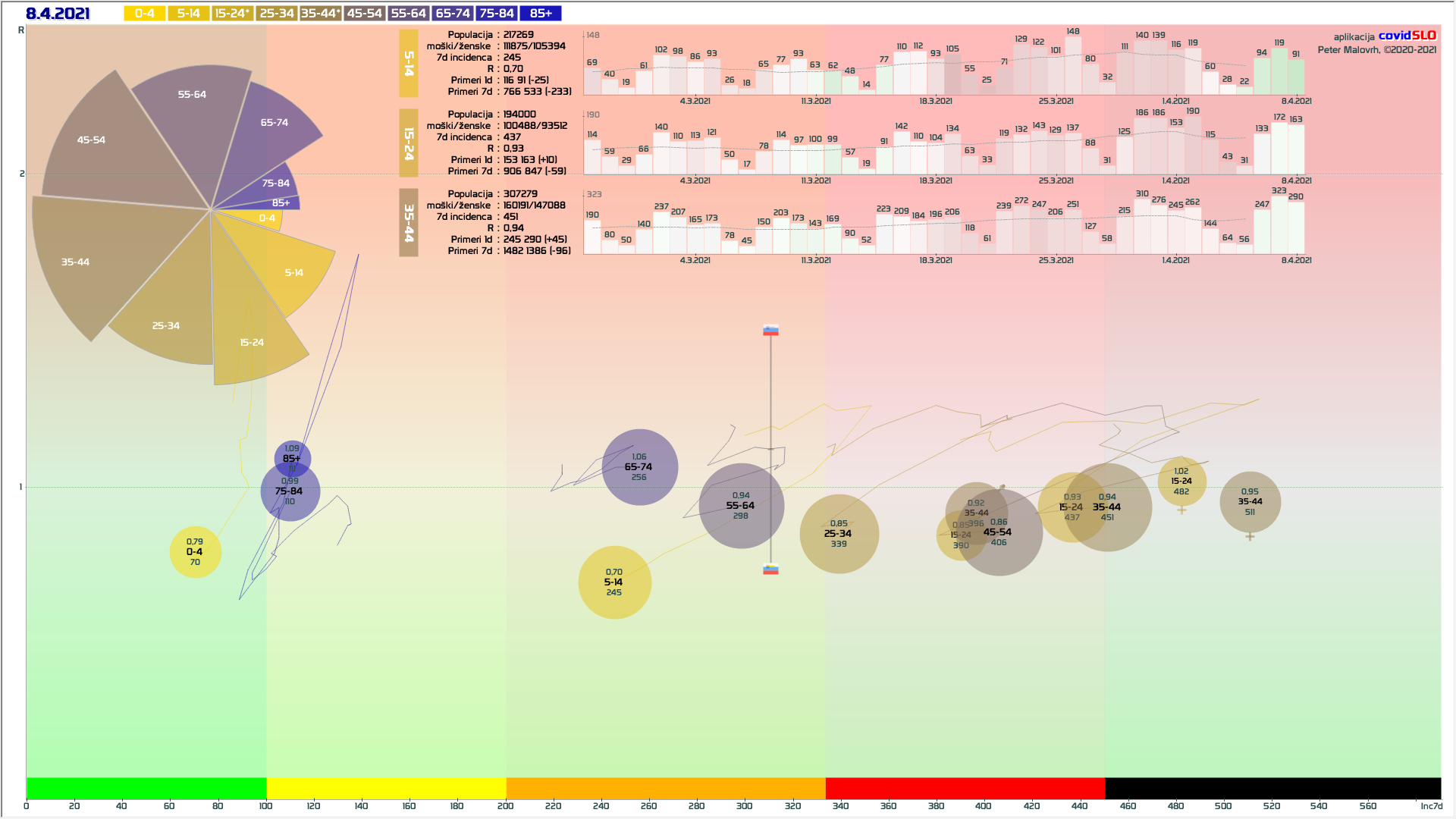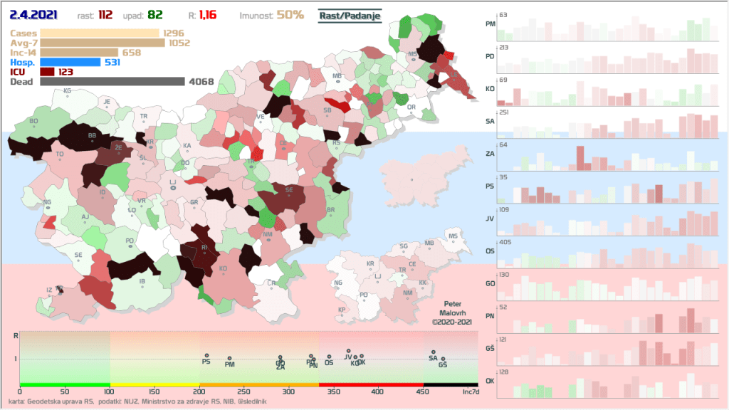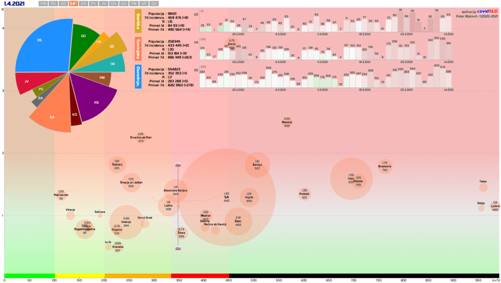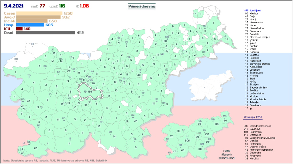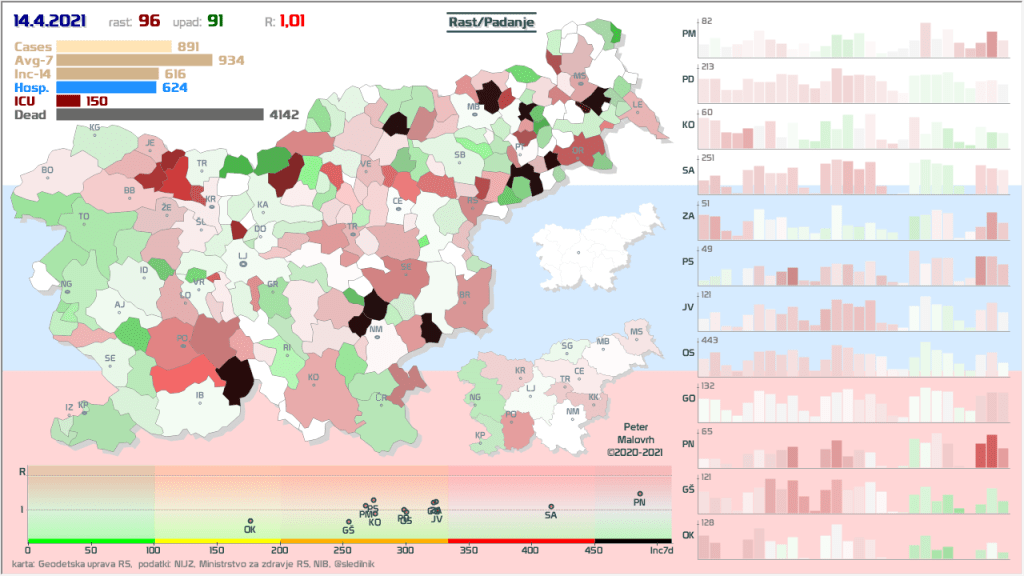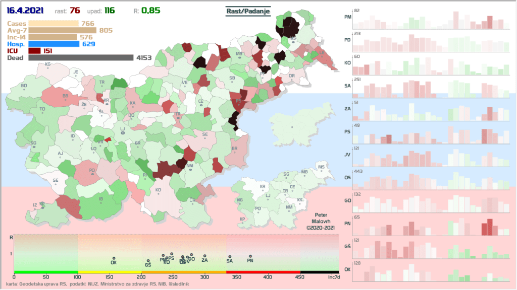 Trenutno najslabša je Goriška s katastrofo v Novi Gorici (7d incidenca /100k 762) in Šempetru (673), kjer pa je Idrija celo v zelenem območju (incidenca 85). Vipava se je precej popravila.