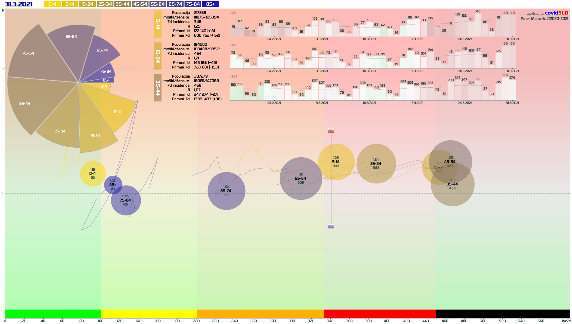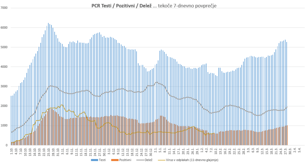 Dobili smo zaostritve ukrepov, in sicer 11-dnevni lockdown med vključno 1.4. in 11.4. Gospodarstvo bo delalo, šolanje bo na daljavo, regije zaprte, maske na javnih mestih. Vreme bo lepo in ljudje se bodo najprej par dni drenjali po trgovinah in pri frizerjih, na praznik 5.4. bodo obiski po celi Sloveniji, ostalo pa pomladansko uživanje. Ljudje so v vse večji meri naveličani in neodzivni. Bojim se skratka, da neke velike koristi ne more biti, bo le nekaj dodatne gospodarske škode in dodatna škoda pri šolajoči mladini. K sreči so razmere že sedaj kot kaže kar ugodne (v smislu nepovečevanja deleža B.1.1.7) in bi se kot trenutno kaže že samo zaradi tega in zunanjih pogojev morale pričele kmalu izboljševati.