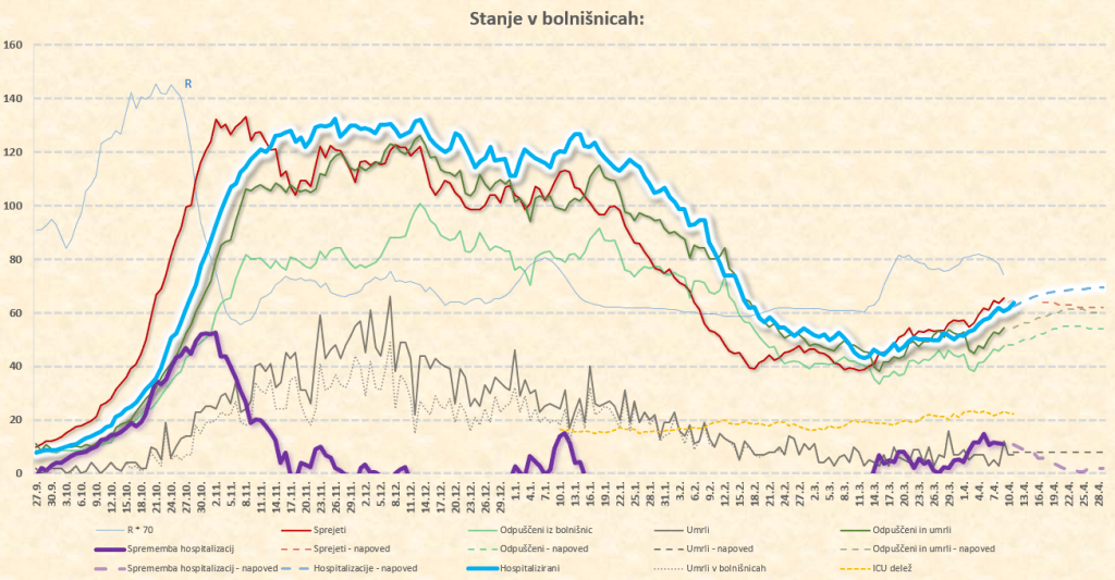 Sprejemi so lepo padali in so bili že pod povprečnim nivojem 40/dan. Zdaj se je ta trend obrnil in sprejemi so naraščali, trenutno so povprečno okoli 55/dan. V tem in v začetku naslednjega meseca se nakazuje še rahlo povečanje, potem pa spet padanje, če drži teorija o doseženem platoju B.1.1.7 in pomembnem vplivu zunanjih pogojev na širjenje virusa. 7 dni sprejemi niso več nič naraščali, od 1.4. porast.