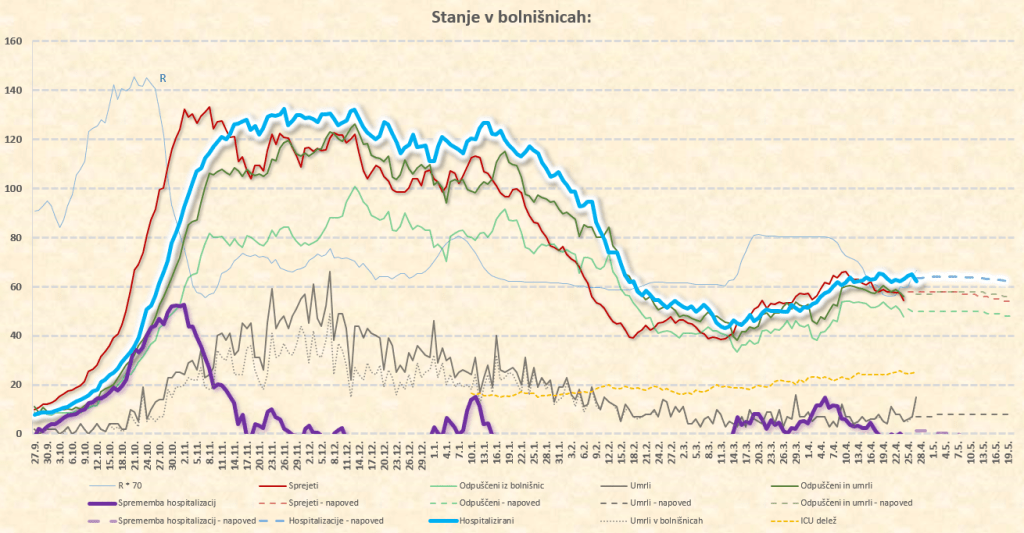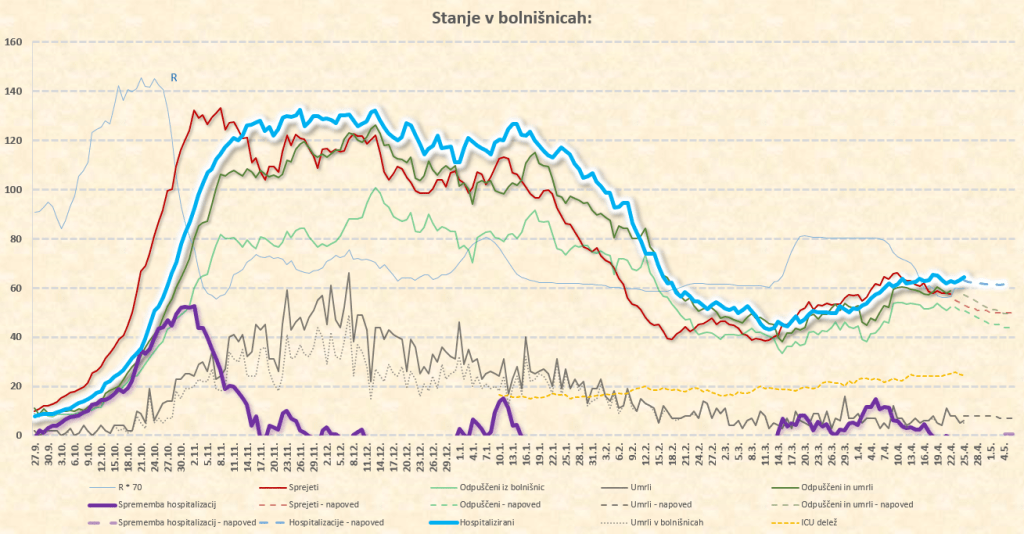 18.4. smo verjetno dosegli vrh hospitaliziranih v tretjem valu pri 652. Kot kaže, se bomo tik pod tem nivojem vrteli še kar nekaj časa, kakšen dan gremo morda tudi čez. Je pa zdaj zaradi praznika 27.4. težko ocenjevati, ker bolnišnice imajo svojo dinamiko.