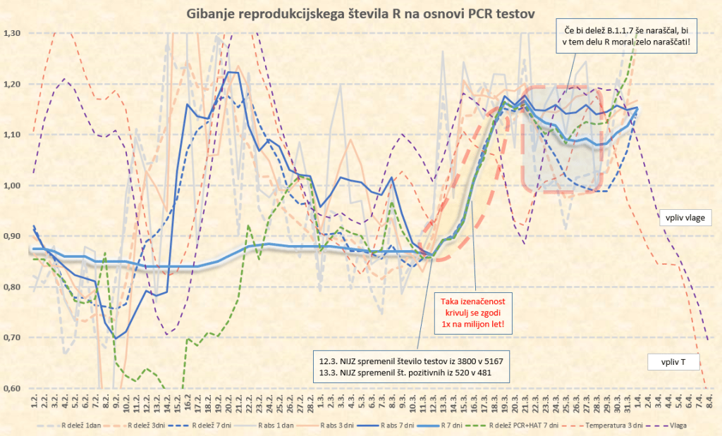 Par dni toplejšega vremena okoli 13.3. nam je ustavilo naraščanje krivulje R, a potem je bila spet ohladitev in napovedi s tega vidika niso bile optimistične – ob sočasnem problemu B.1.1.7 bi nam lahko R do 30.3. zlezel tudi na 1.25, kar bi od torka 23.3. do petka 26.3. pomenilo okoli 1400 dnevno pozitivnih! Opažamo pa, da se to ni zgodilo, kar pa lahko pomeni, da je njegov delež dosegel nek plato (recimo 70%), od kjer se ne povečuje več preveč hitro. Podatki za masivne dni 23.-26.3. so s tega vidika bili zelo vzpodbudni. Je delež B.1.1.7 v resnici že presegel 60% in se je rast tega deleža že pomembno ustavila?? Že kar nekaj dni vse bolj kaže, da da.