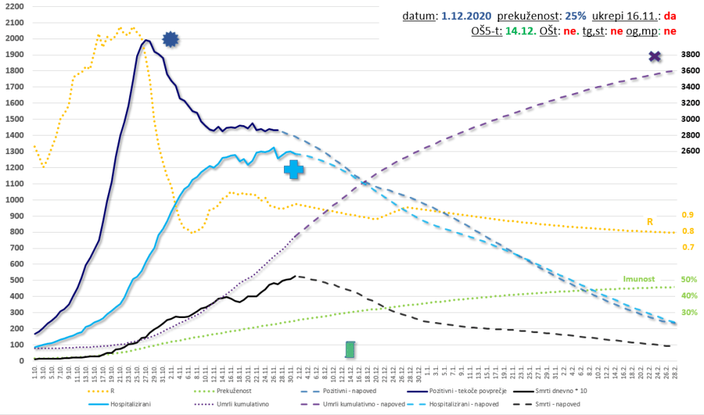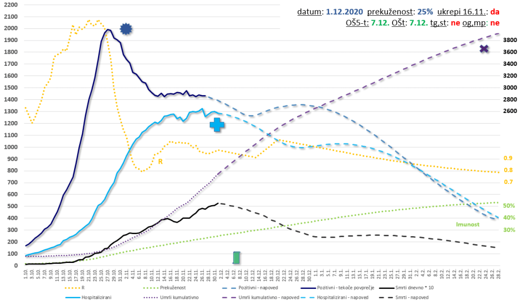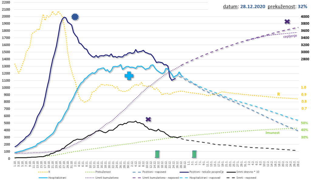 Ocena skupnega števila umrlih: 3400, do novega leta 2600. To je ocena za trenutno prekuženost 28% – če je ta višja, bo število umrlih nekaj nižje. Če je prekuženost nižja, bo številka še nekaj višja. Ker pa bo nedvomno tudi nekaj sproščanja ukrepov, bi skupno število preseglo 3400. Upajmo, da to znižamo pod 3400 s cepljenjem najbolj ranljivih že v januarju.