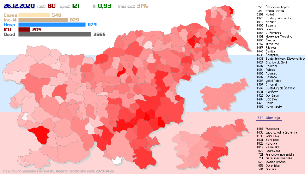 R (izračunan za en teden nazaj) je 0.92. Tu nekje je bilo že precej nazaj predvideno, da se ustali do Božiča, in tako se je zgodilo. Po Božiču se bo zaradi delnega sproščanja ukrepov in praznikov verjetno dvignil nazaj proti 1. Danes so že prvi indici v to smer – primerov nekaj več kot prejšnjo sredo, število potrebnih PCR testov ne pada več, število občin z rastjo se povečuje že tretji dan …