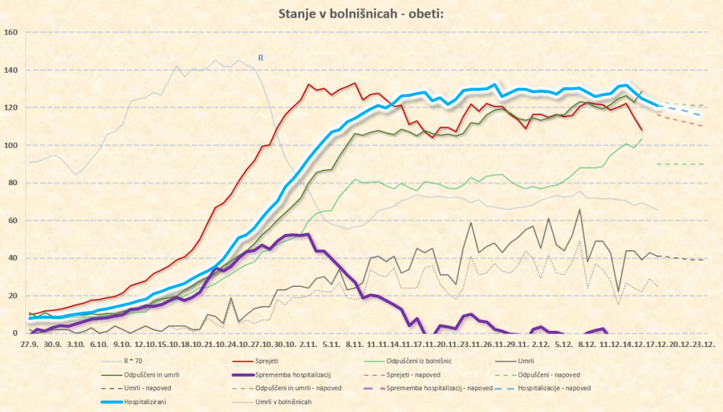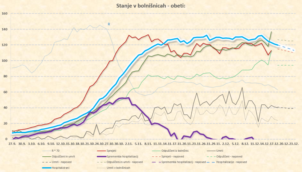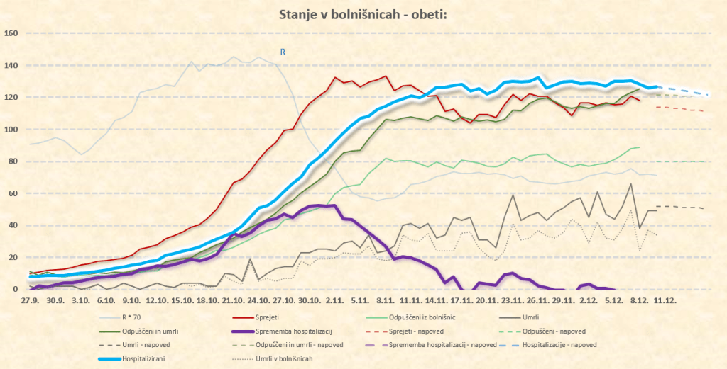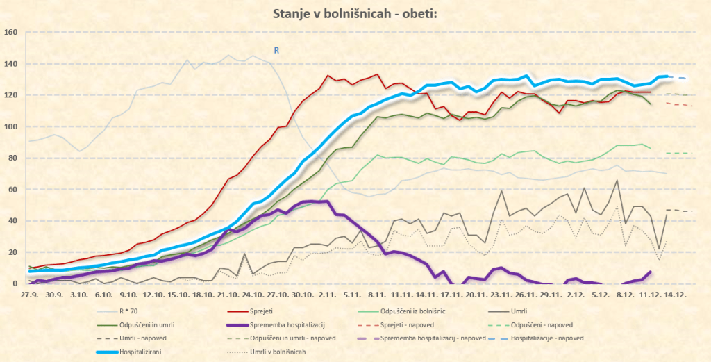 Maksimum števila hospitaliziranih: med 26.11. in 4.12.2020 pri 1300. Vrh se je vlekel zaradi vse več bolnikov iz višjih starostnih skupin (zato podaljšan čas hospitalizacije), padanje števila hospitaliziranih se je zato upočasnjevalo in zamikalo. Najkasneje konec tega tedna bi končno morali opažati jasno tendenco počasnega padanja števila hospitaliziranih.