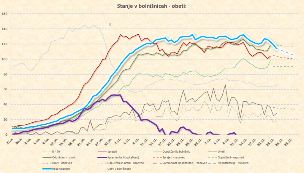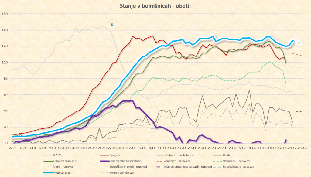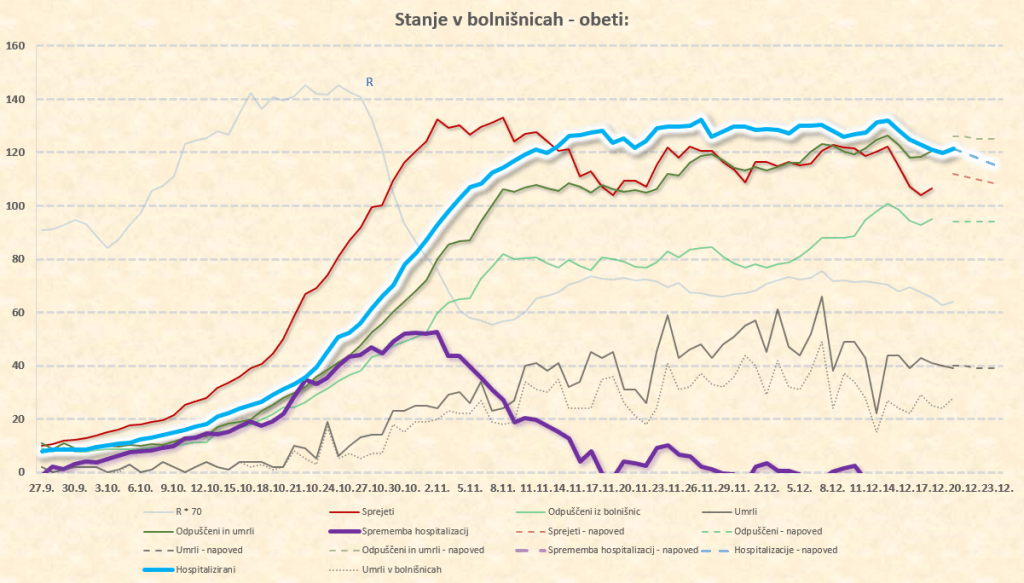 Maksimum števila hospitaliziranih: med 22.11. in 14.12.2020 pri okoli 1300. Vrh se je vlekel zaradi vse več bolnikov iz višjih starostnih skupin (zato podaljšan čas hospitalizacije), padanje števila hospitaliziranih se je zato upočasnjevalo in zamikalo. Pričakovati je še par dni padanja, potem pa se bo to padanje res zelo upočasnilo.