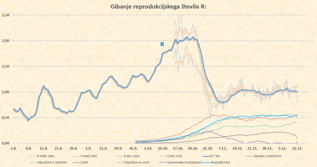 Delno sproščanje ukrepov v veljavi s 15.12. in naprej se že rahlo odraža na številkah, ki ne padajo več. R bo verjetno zdaj zlezel nazaj v smeri proti 1. Predvideno odpiranje šol 4.1. nam sredi januarja R predvidoma spet dvigne nazaj v okolico 1, lahko tudi malce čez.