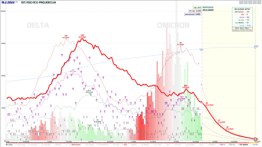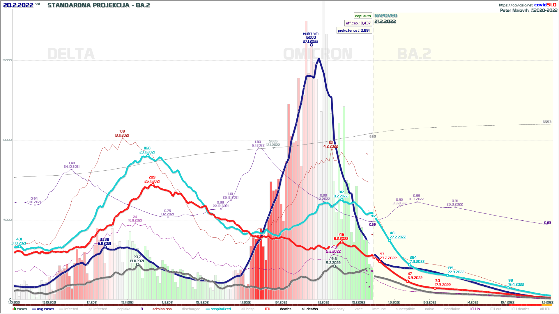 napoved hospitaliziranih: delta vrh 1168 23.11., min po delta valu 514 14.1.2022, predviden omikron vrh okoli 900-1100 9.2.2022 (razen če je vrh zaradi BA.2 podcenjen, potem bo več in kasneje)