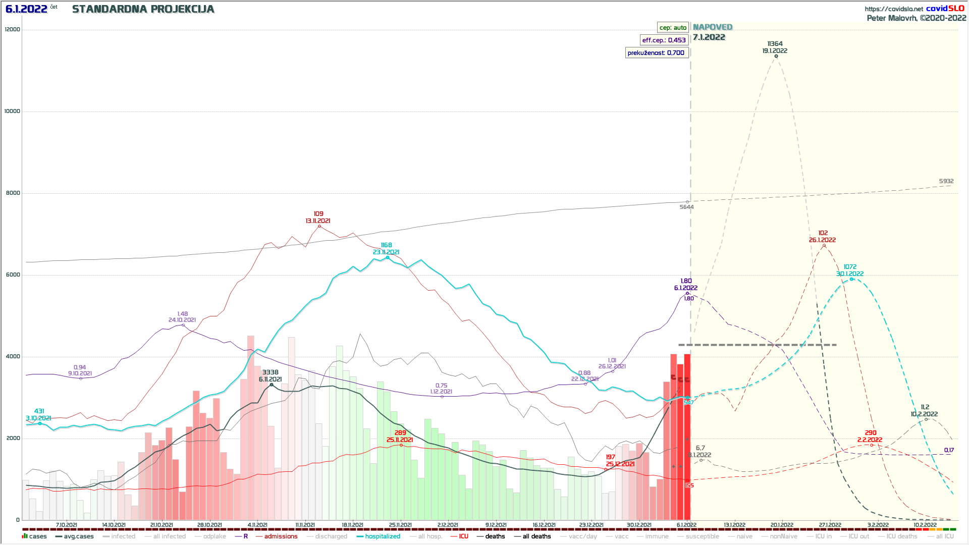 Z epidemiološkim modelom v aplikaciji covidSLO modeliram novoletni porast R za 0.22 in potem še njegov padec nazaj za 0.17. Štartam s trenutno izmerjenim R, upoštevana trenutna povprečna učinkovitost cepiva (učinkovitost zaščite posameznega cepljenja s časom upada) je iz 50% v sredini novembra do decembra zaradi 3. odmerkov narasla na preko 60%. Opozorilo: zaradi prihajajoče variante omikron bo krivulja primerov v januarju verjetno povsem drugačna. Trenutno je še ni možno ne da kvalitetno izrisati.