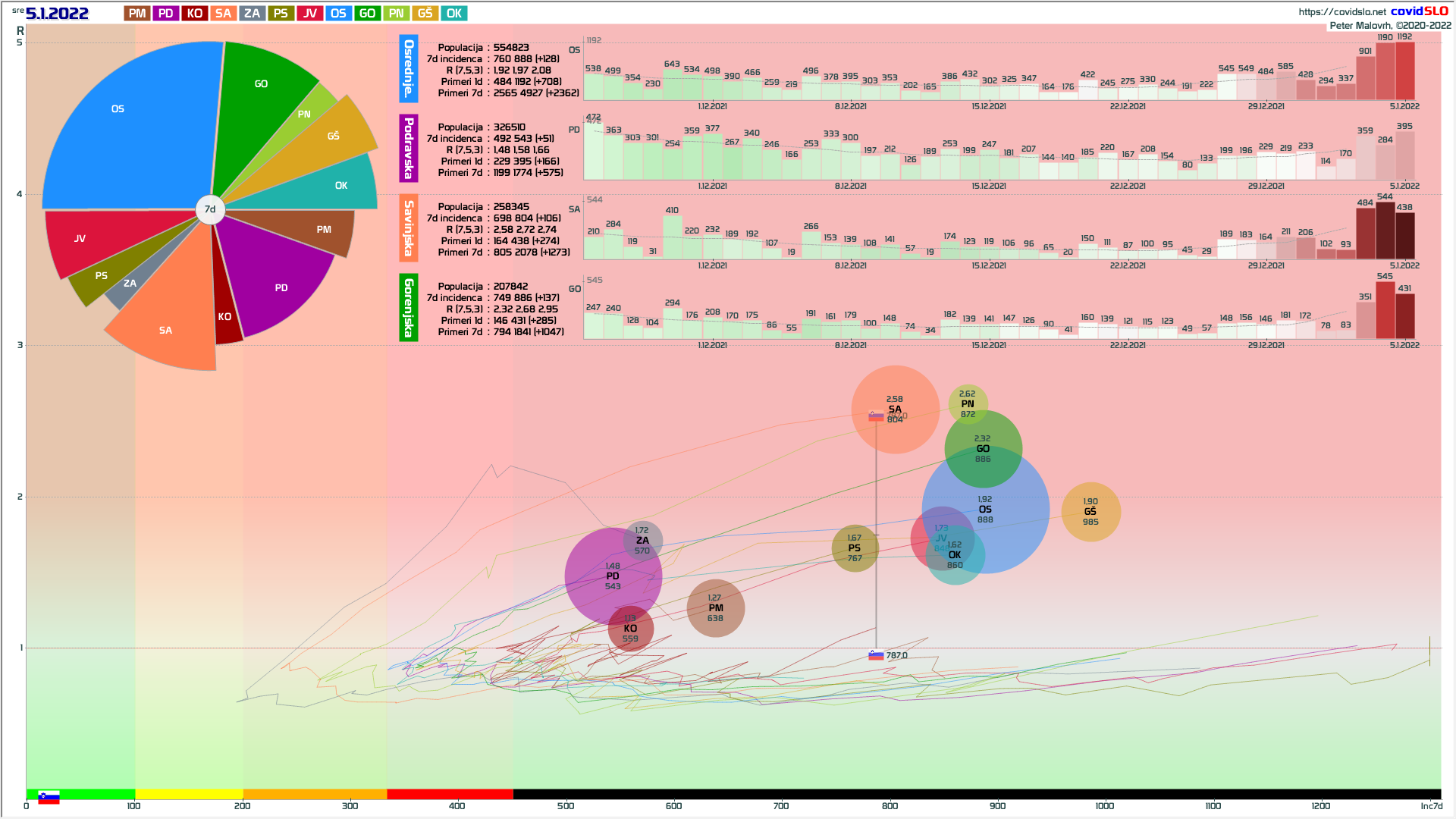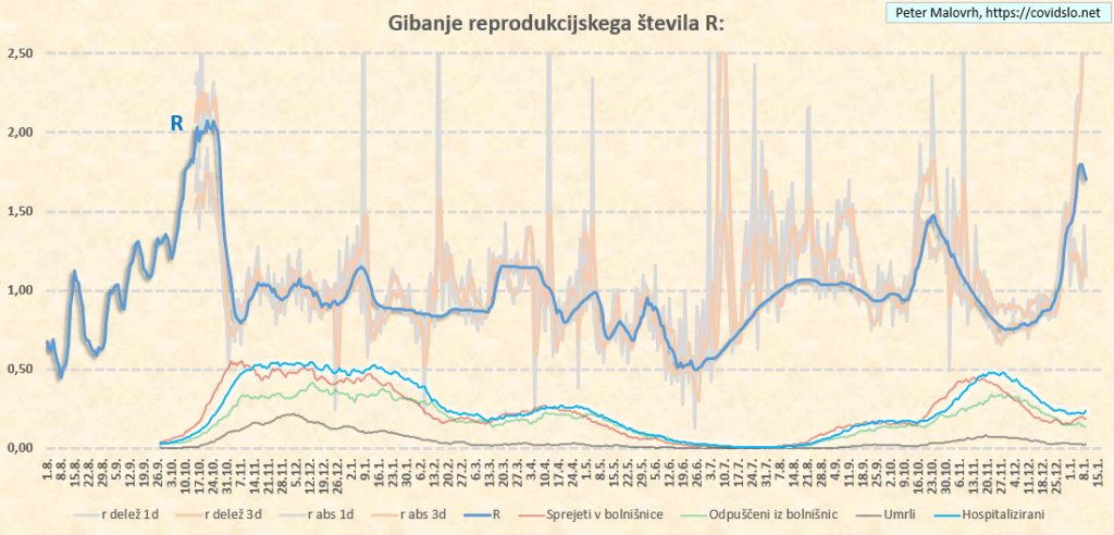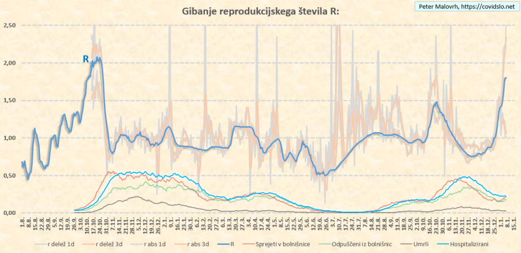 v zadnjih dneh (še) ni predvidenega padanja R proti 0.75, razlog je lahko podcenjevanje veselega decembra z moje strani, lahko pa omikron, ki od 14.12.2021 uradno je pri nas