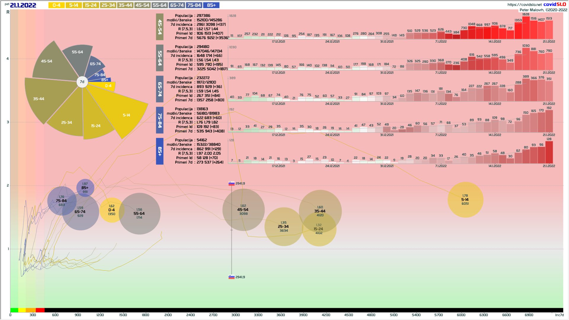 Dnevno število smrti je proti sedanjemu vrhu postopoma naraščalo. Zdaj smo že čez vrh, ki je bil pri povprečnem nivoju okoli 19/dan. Rizične skupine so zdaj res dobro imunizirane, popušča pa zaščita po cepljenju tistim prvim cepljenim v prvih letošnjih mesecih – teh je baje zato zdaj že kar nekaj v bolnišnicah, čeprav pogled okužb po starostnih skupinah pokaže, da recimo skupina 85+ ni nič kaj “podivjala”. Kar nekaj je tudi imunsko oslabljenih bolnikov.