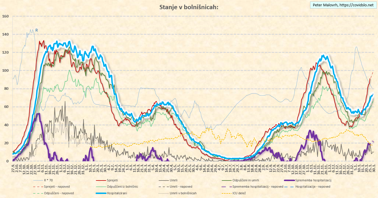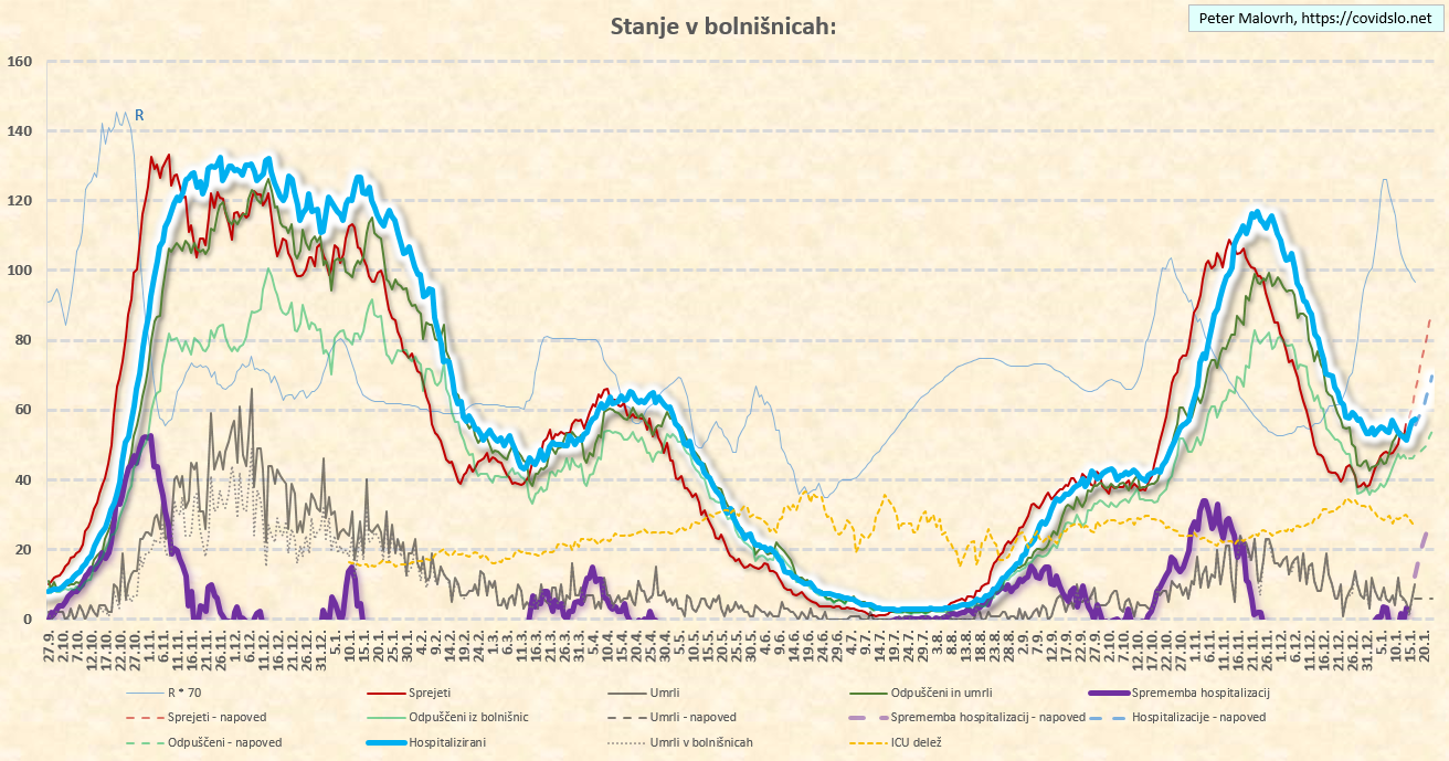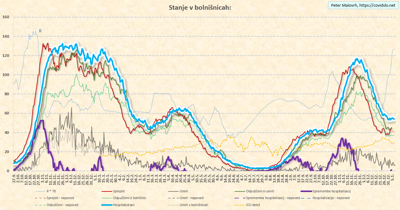 število novih sprejemov v bolnišnice je imelo vrh 109 13.11., potem padlo do 31.12. na 38, zdaj nekje na nivoju 115/dan, po 10.1. se je pričel porast sprejemov zaradi omikrona