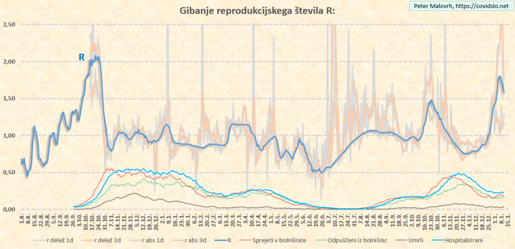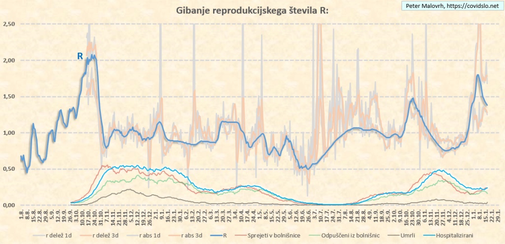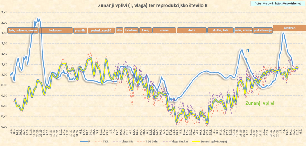 Prekuževanje še vedno poteka hitro. R se bo zelo težko kaj bistveno dvignil. Prešli smo v najhladnejši del leta in več delcev z virusi ostaja v zraku, a nekega dodatnega velikega dviga R to ni prineslo. Nekaj ga nedvomno je, saj zaradi tega naš R ni padal še hitreje. Omeniti je treba še to, da se zaradi trenutne situacije tudi ljudje sami obnašajo nekoliko bolj zaščitno, to pa spet znižuje R.