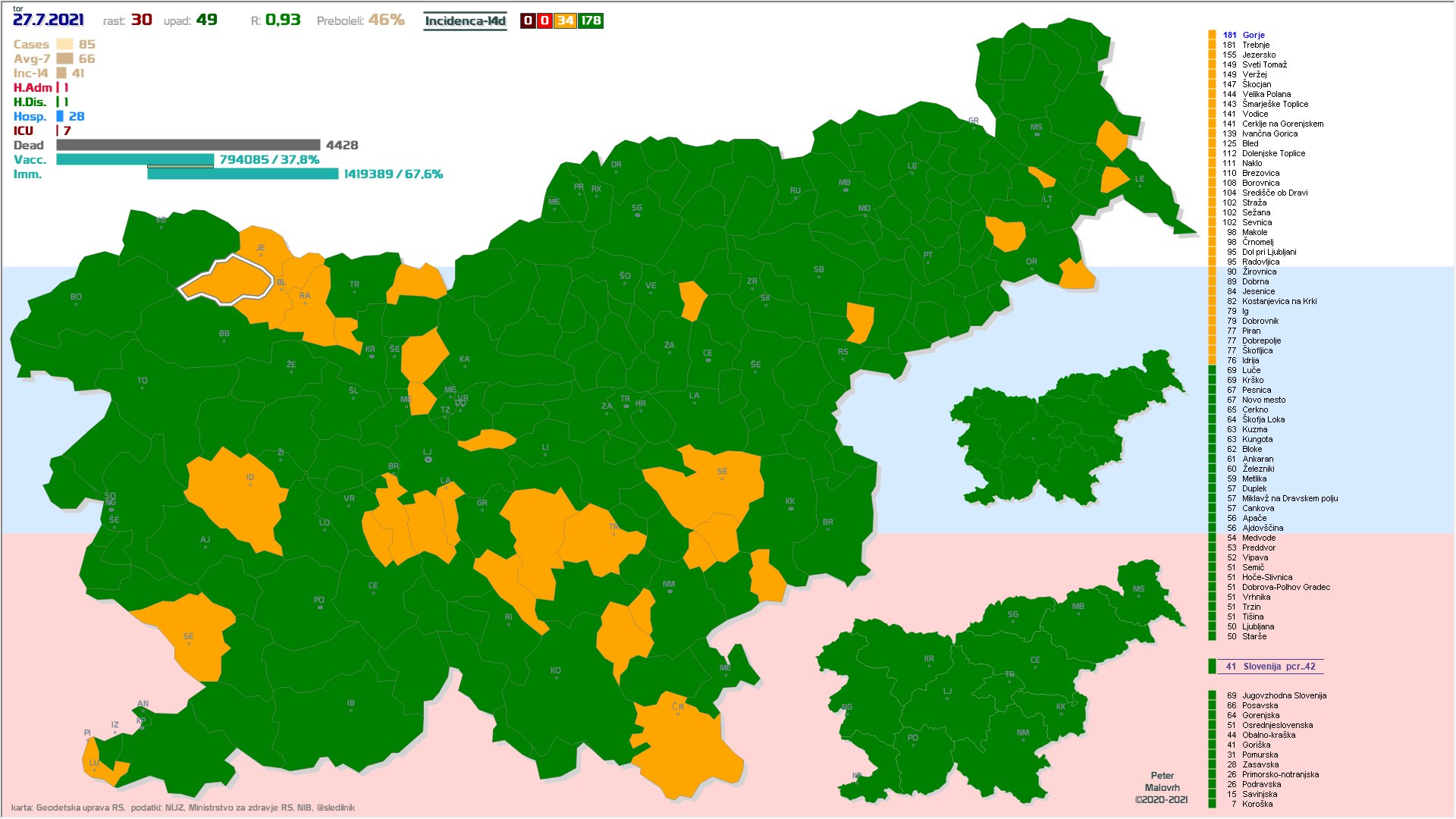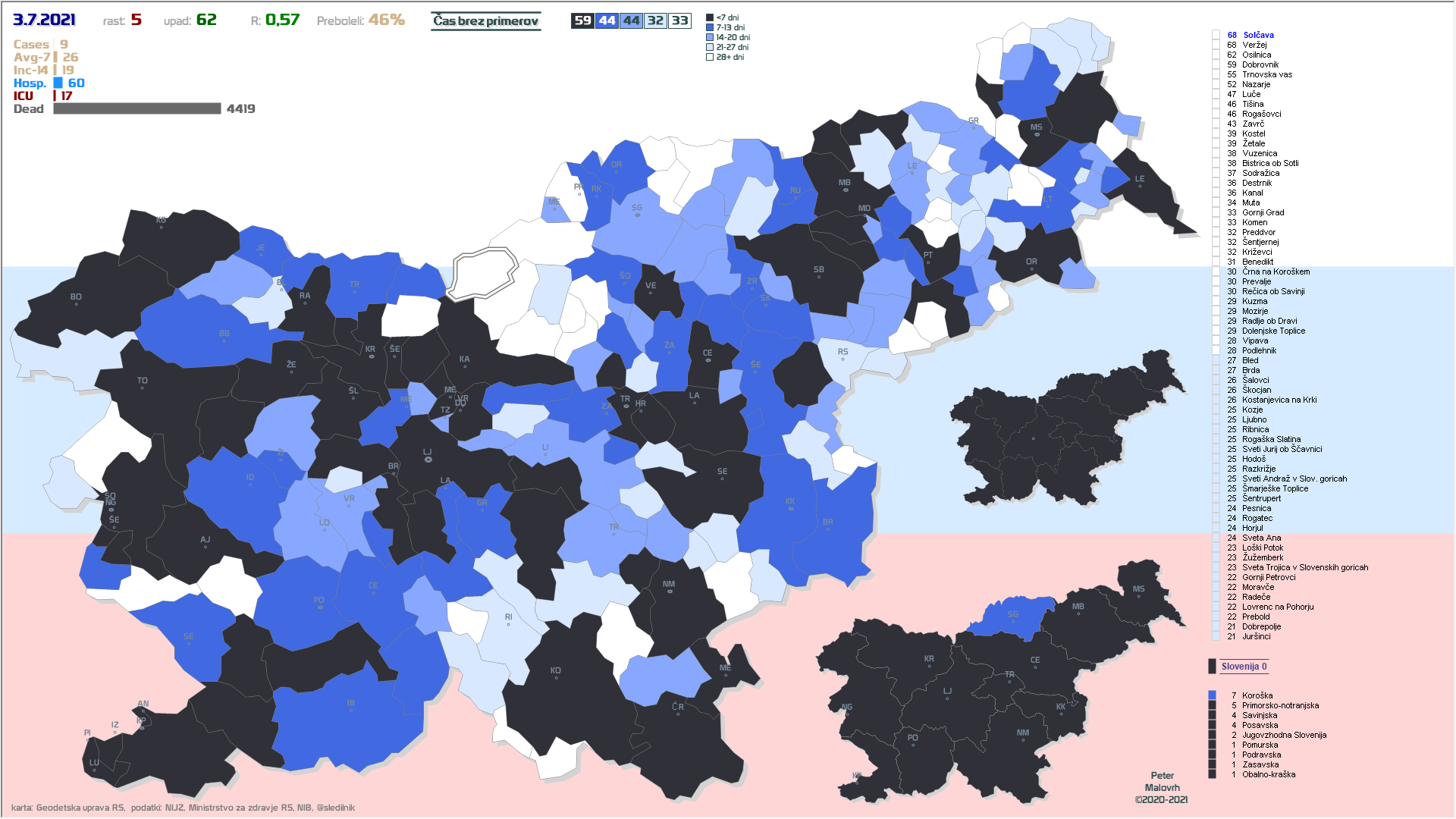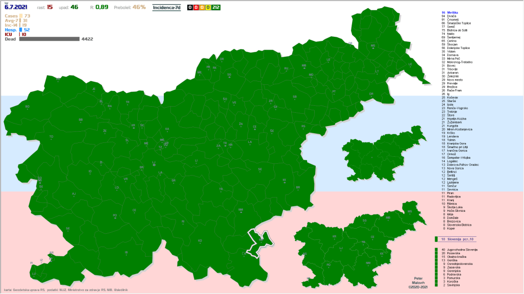 78 občin brez primerov že vsaj en teden, 32 občin že vsaj 2 tedna, 42 EU-zelenih občin