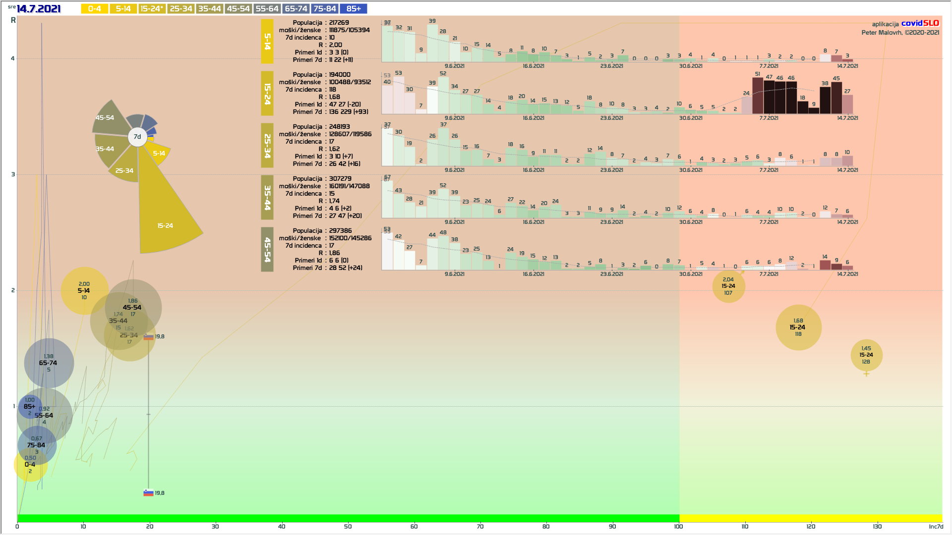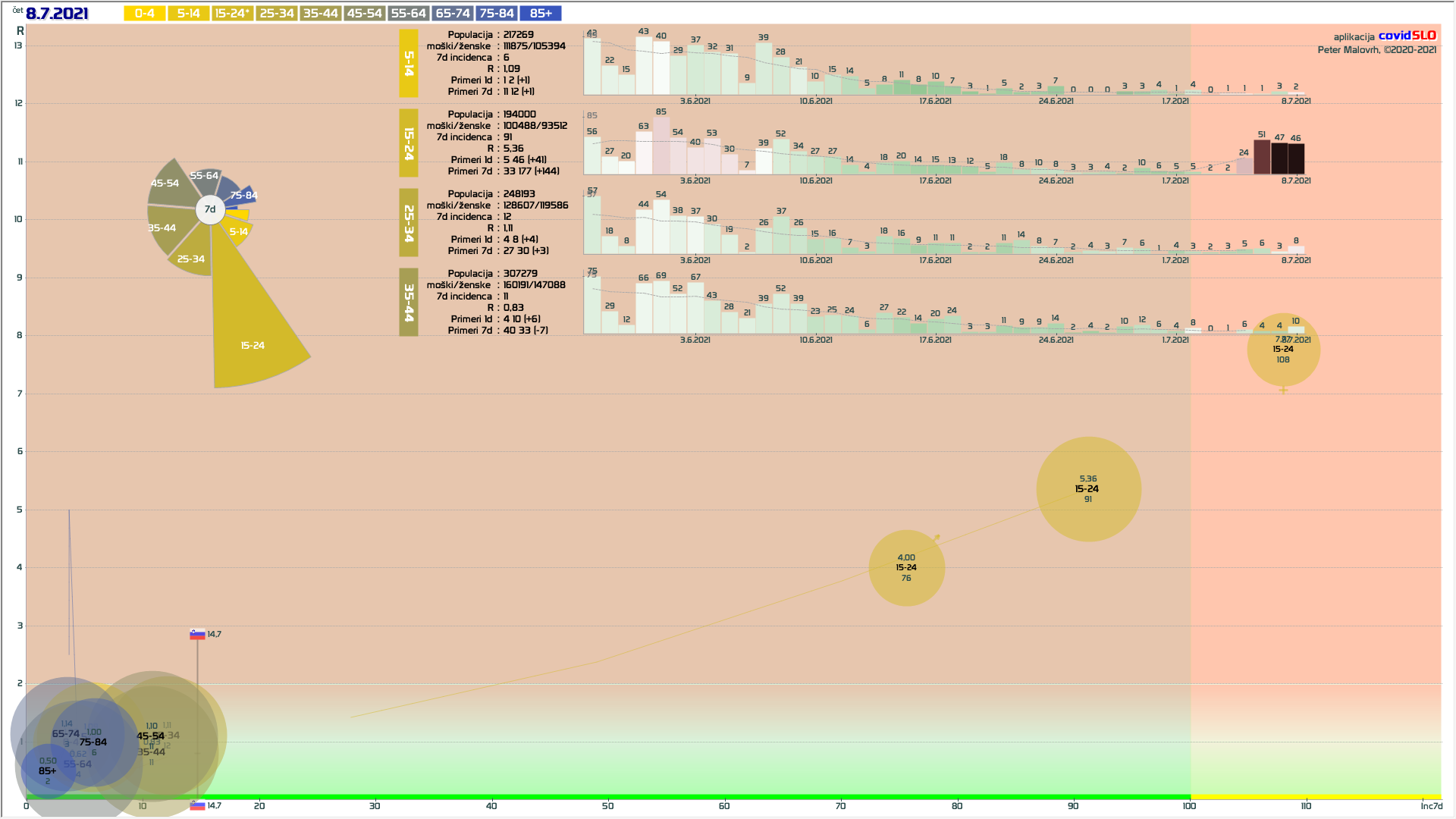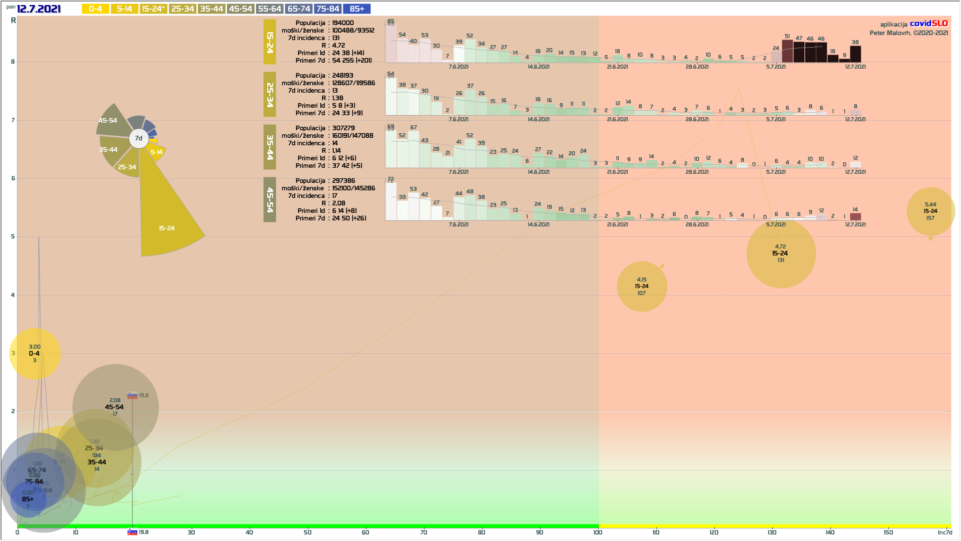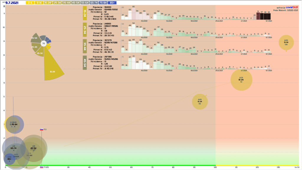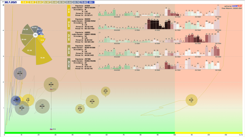 pozor: 5.7.-13.7. skupaj okoli 200 importiranih primerov, velika večina v JV/PS/GO regijah v starostni skupini 15-24 let! V tednu 19.-26.7. 1/6 primerov uvoženih, še precej pa neznanega izvora in povezanih z uvoženimi!