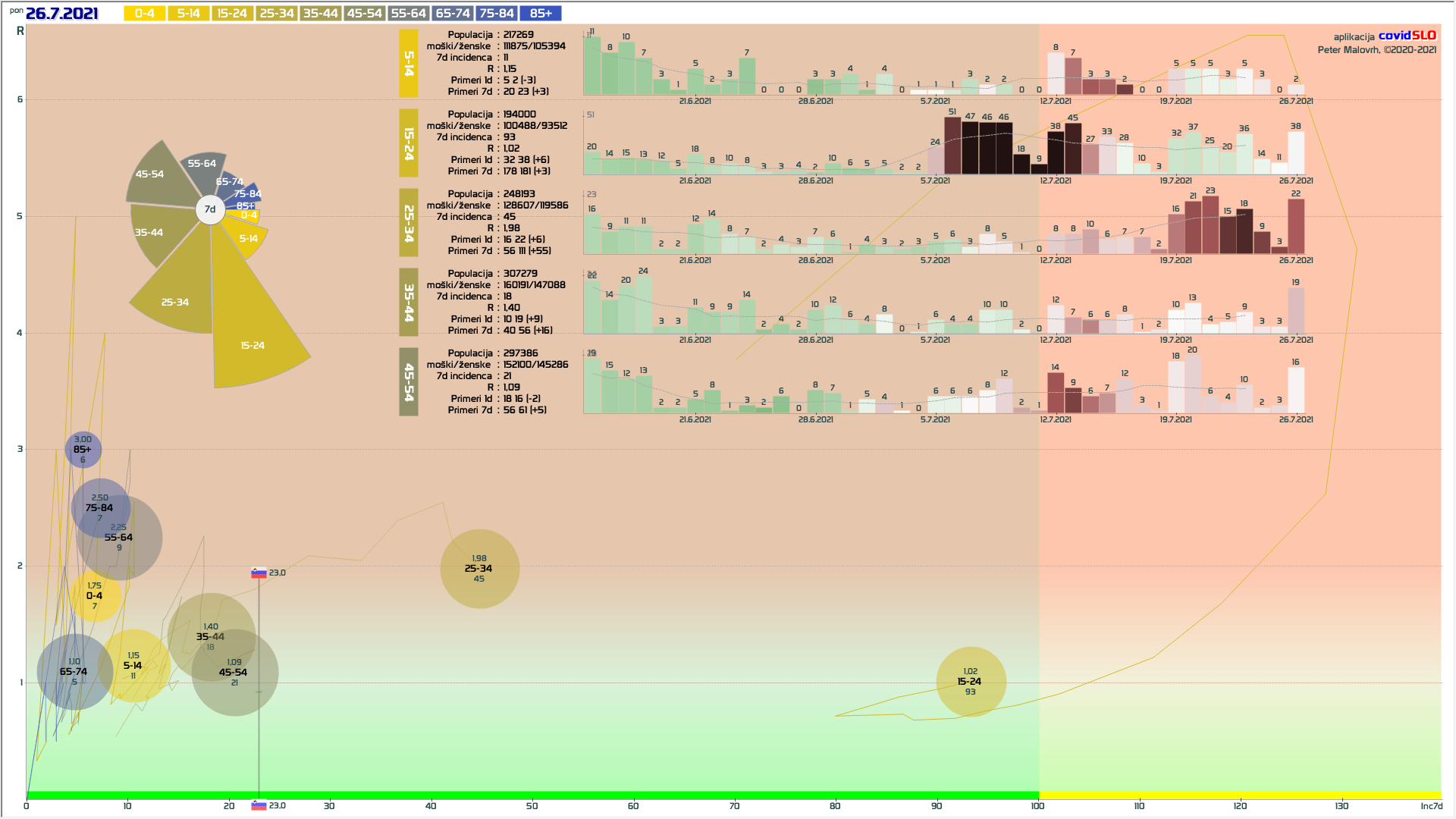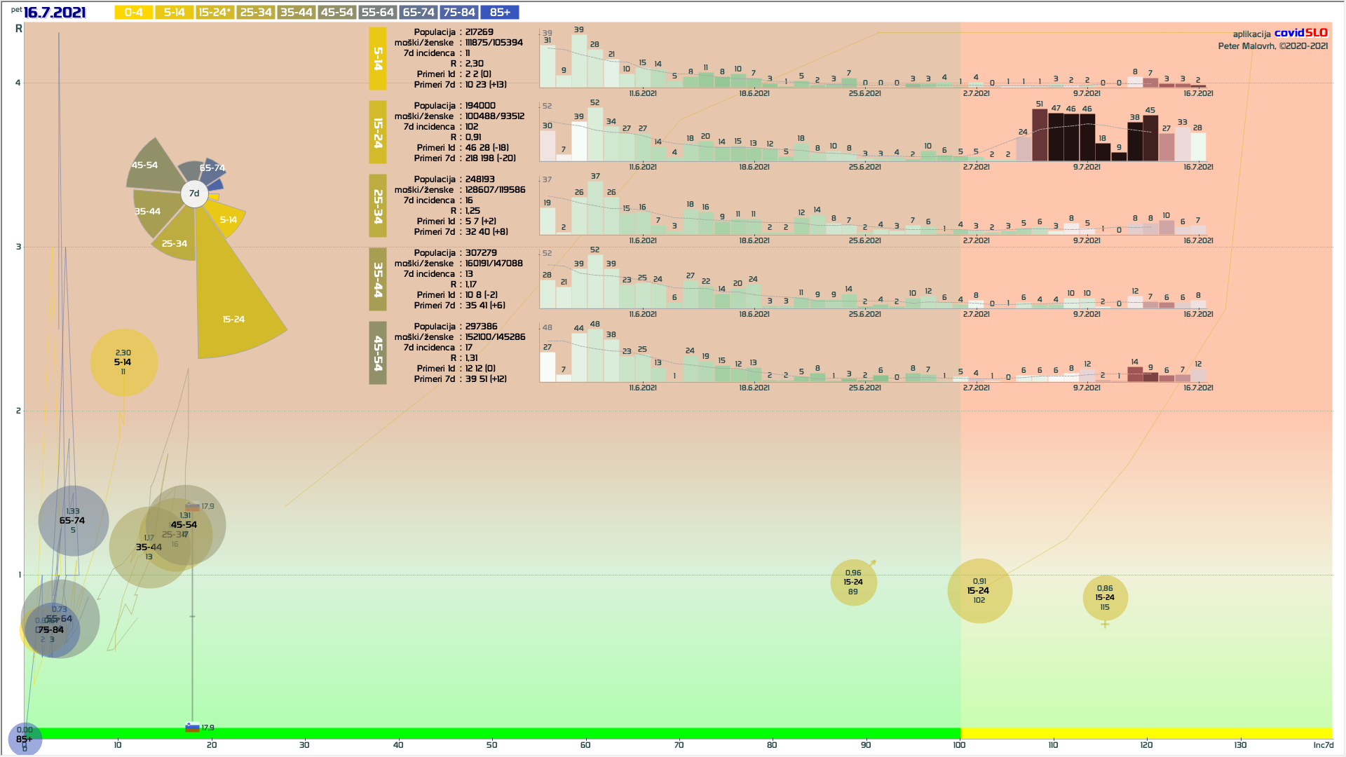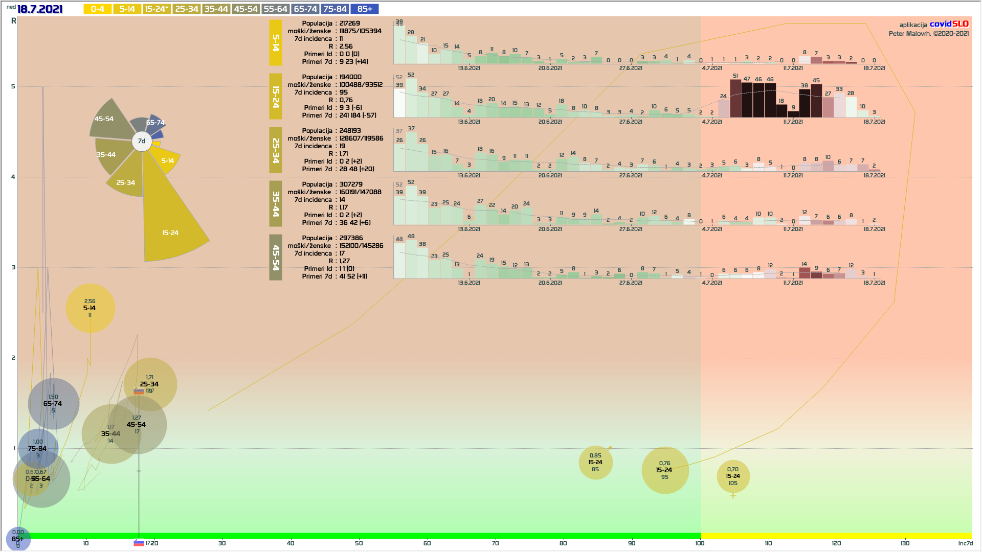 pozor: 5.7.-13.7. skupaj okoli 200 importiranih primerov, velika večina v JV/PS/GO regijah v starostni skupini 15-24 let! V tednu 19.-26.7. 1/6 primerov uvoženih, še precej pa neznanega izvora in povezanih z uvoženimi!