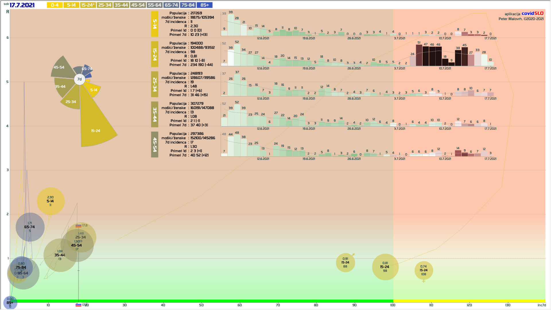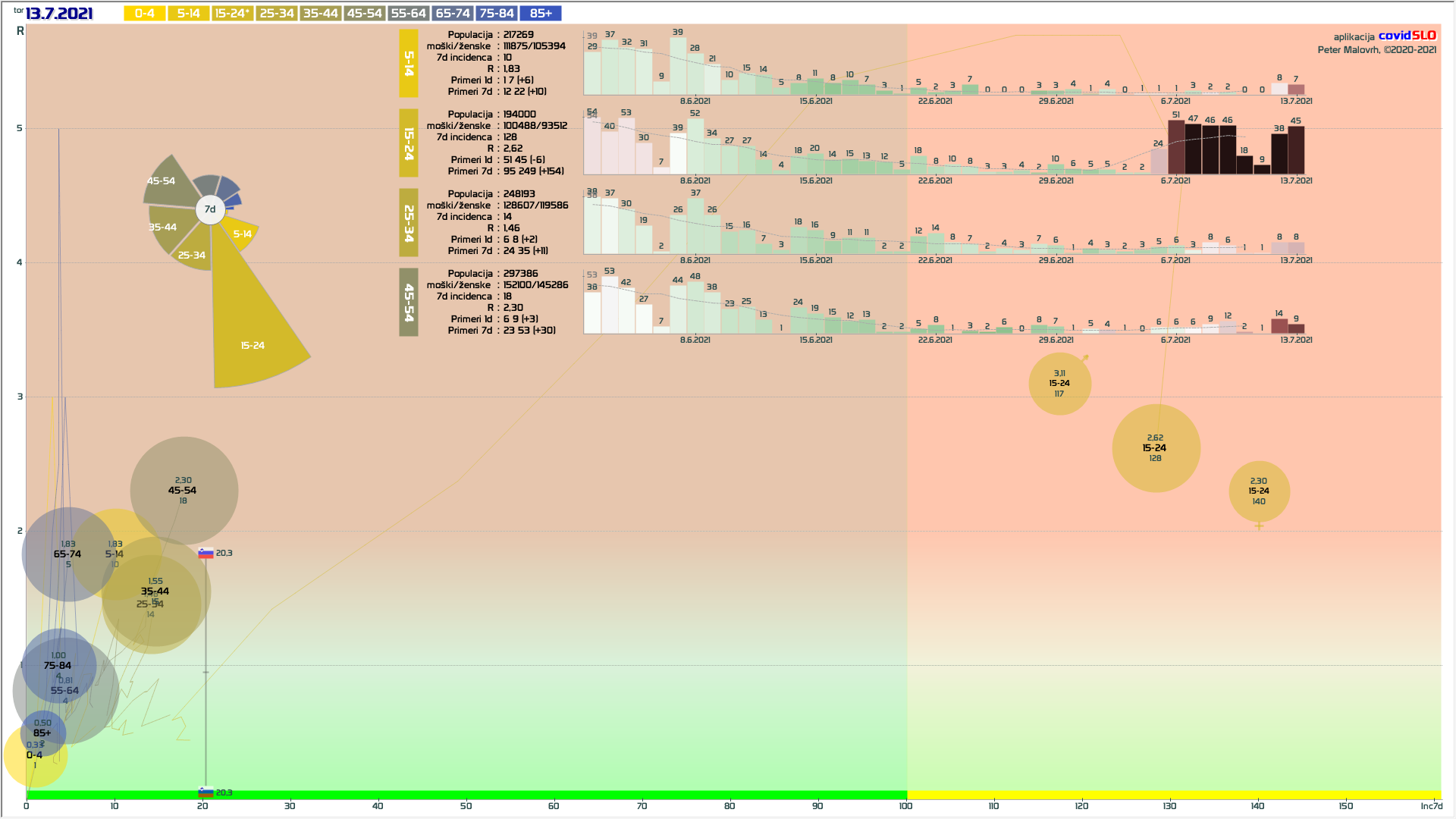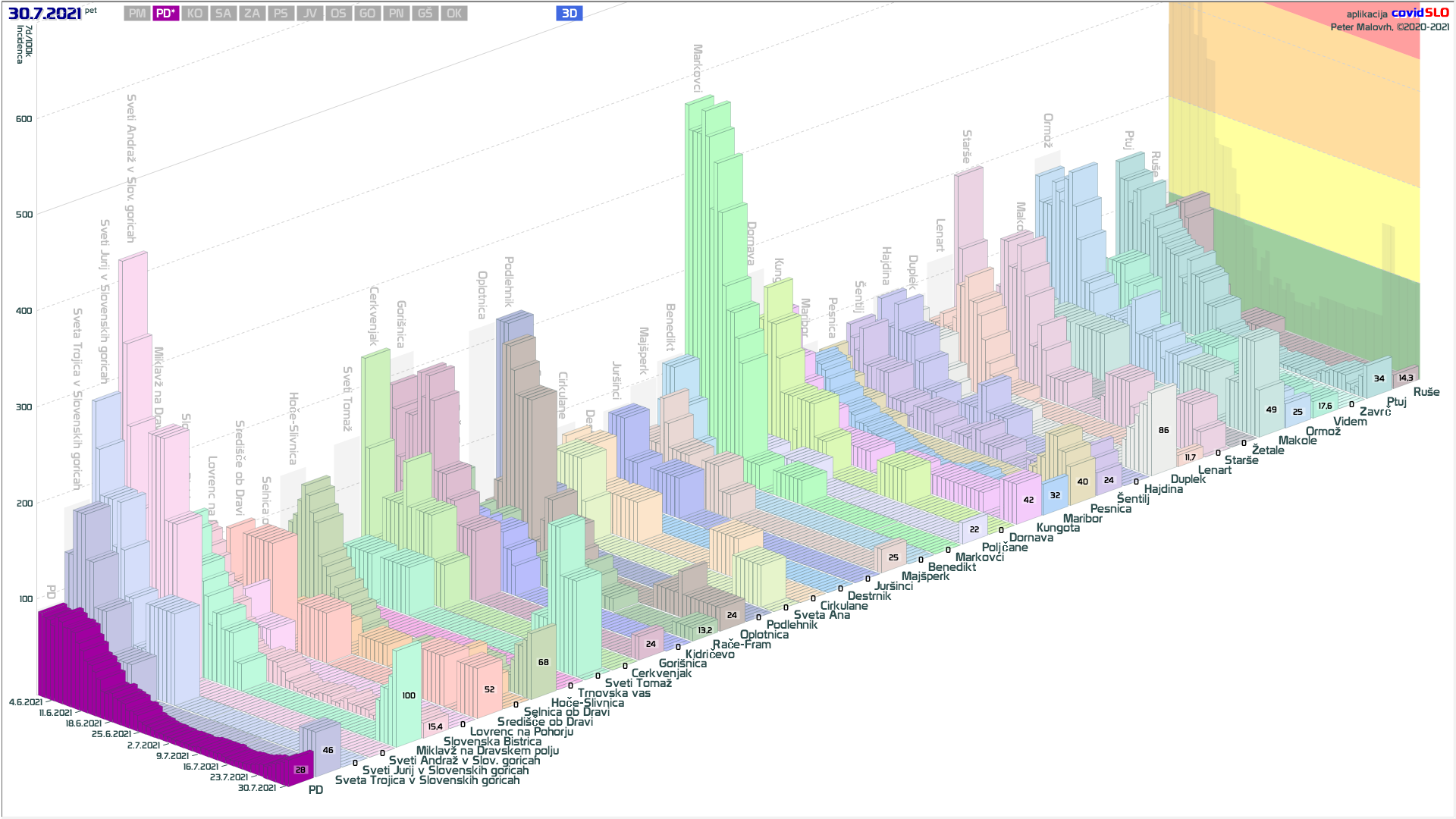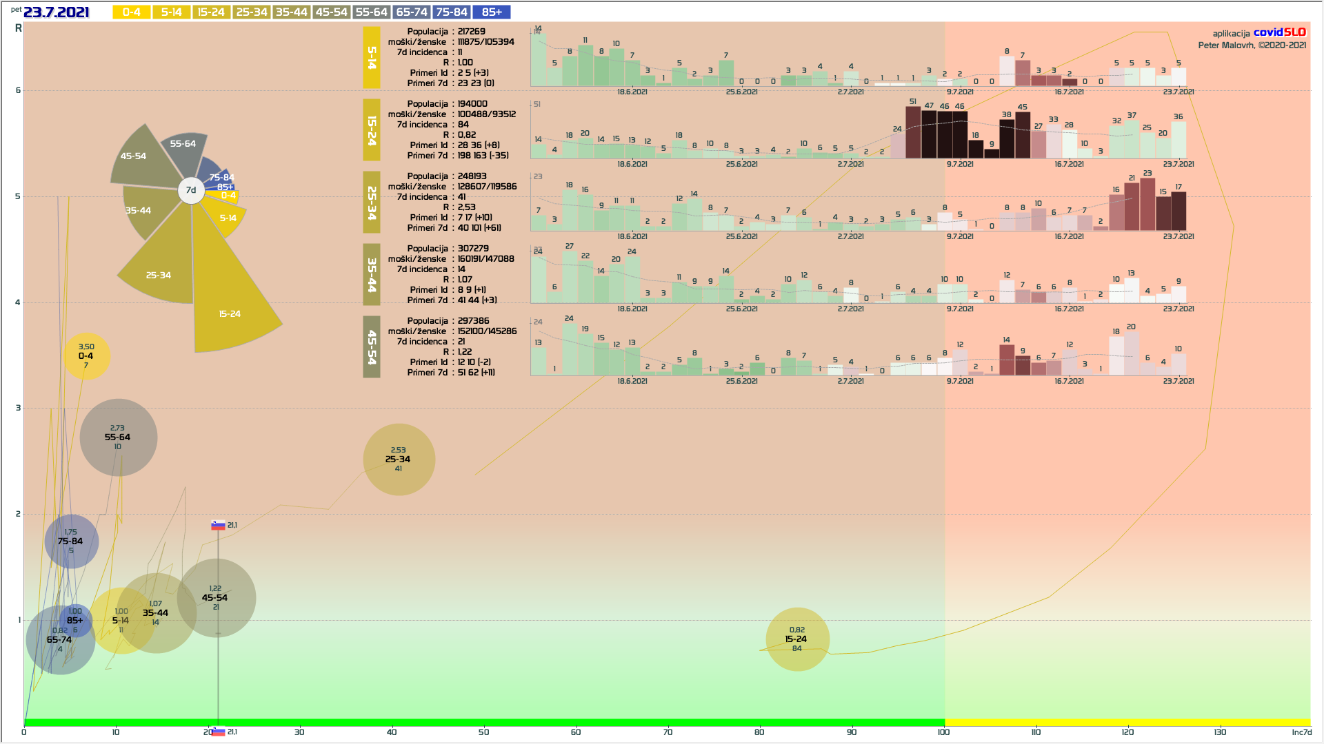 pozor: 5.7.-13.7. skupaj okoli 200 importiranih primerov, velika večina v JV/PS/GO regijah v starostni skupini 15-24 let! V tednu 19.-26.7. 1/6 primerov uvoženih, še precej pa neznanega izvora in povezanih z uvoženimi!