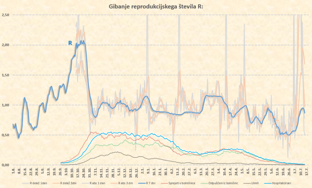 Zaradi nizkega števila primerov in povečevanja deleža importiranih primerov ter primerov neznanega izvora je izračunani R sedaj precej neregularen. Ocena stopnje lokalnega širjenja je sedaj vse bolj nezanesljiva. Vrednost našega klasičnega R iz medtedenskih primerjav števila primerov je neregularno narasla. Prispeva tudi delta. Koliko prispeva eno in koliko drugo, je še težko oceniti, definitivno pa trenutno največ prispevajo importirani primeri.