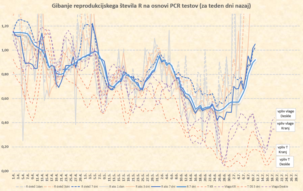 Zaradi nizkega števila primerov in povečevanja deleža importiranih primerov ter primerov neznanega izvora je izračunani R sedaj precej neregularen. Ocena stopnje lokalnega širjenja je sedaj precej nezanesljiva. Vrednost našega klasičnega R iz medtedenskih primerjav števila primerov je neregularno narasla. Prispevala je tudi delta. Koliko prispeva eno in koliko drugo, je še težko oceniti, definitivno pa trenutno največ prispevajo importirani primeri.
