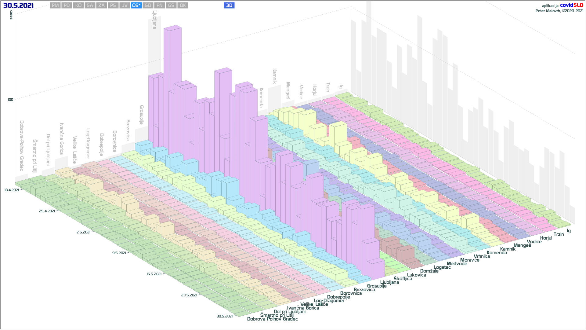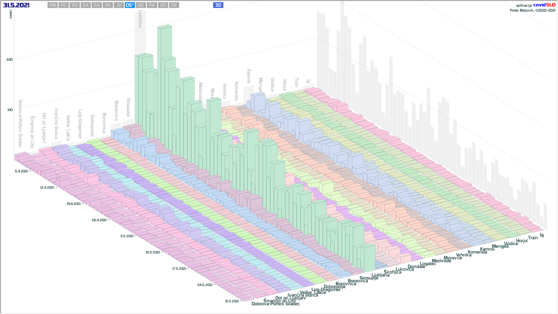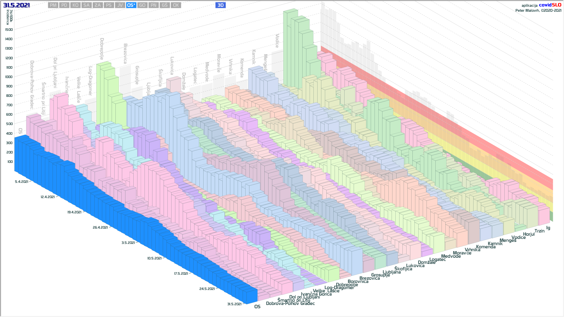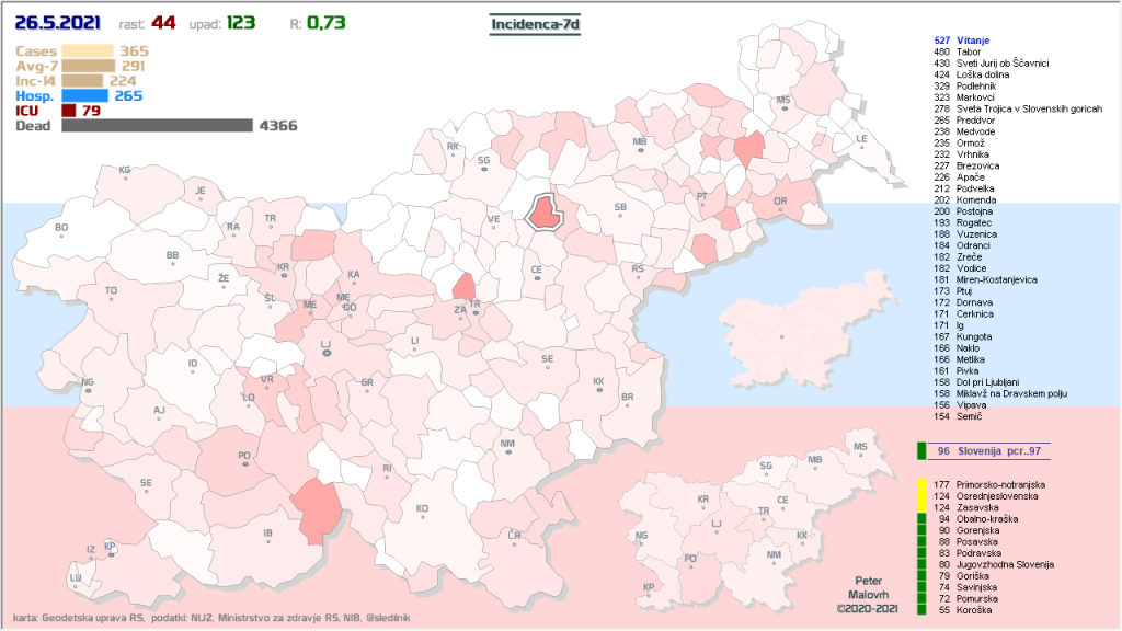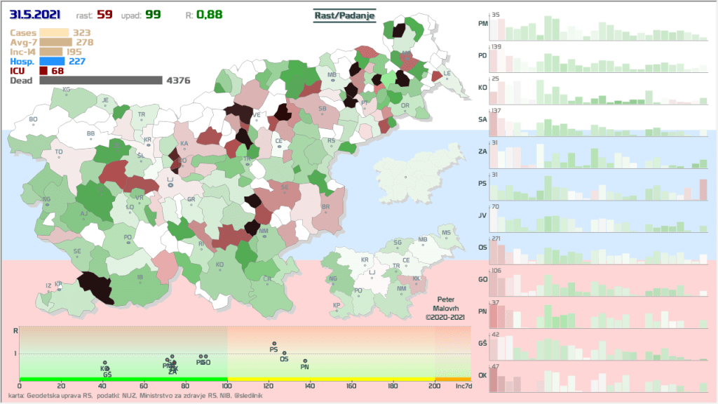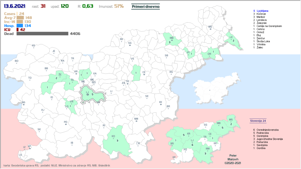 Občine (38, prejšnje dni 37, 38, 41, 40, 42, 37, 29, 26, 27, 27, 25, 26, 24, 20, 17, 12, 10, 9, 12, 11, 10, 10, …), ki so že 7 ali več dni brez odkritih primerov: Občine z 0 primeri zadnjih 7 dni na dan 31.5.2021, Beltinci, Bovec, Tišina, Črna na Koroškem, Gornji Petrovci, Šalovci, Idrija, Kozje, Kuzma, Luče, Mežica, Nazarje, Osilnica, Podvelka, Rogašovci, Rogatec, Škocjan, Velike Lašče, Zavrč, Železniki, Cankova, Dobje, Dobrovnik, Dolenjske Toplice, Hodoš, Jezersko, Lovrenc na Pohorju, Prebold, Ribnica na Pohorju, Selnica ob Dravi, Solčava, Sveta Ana, Trnovska vas, Veržej, Žirovnica, Kostanjevica na Krki, Sveti Tomaž in Log-Dragomer.