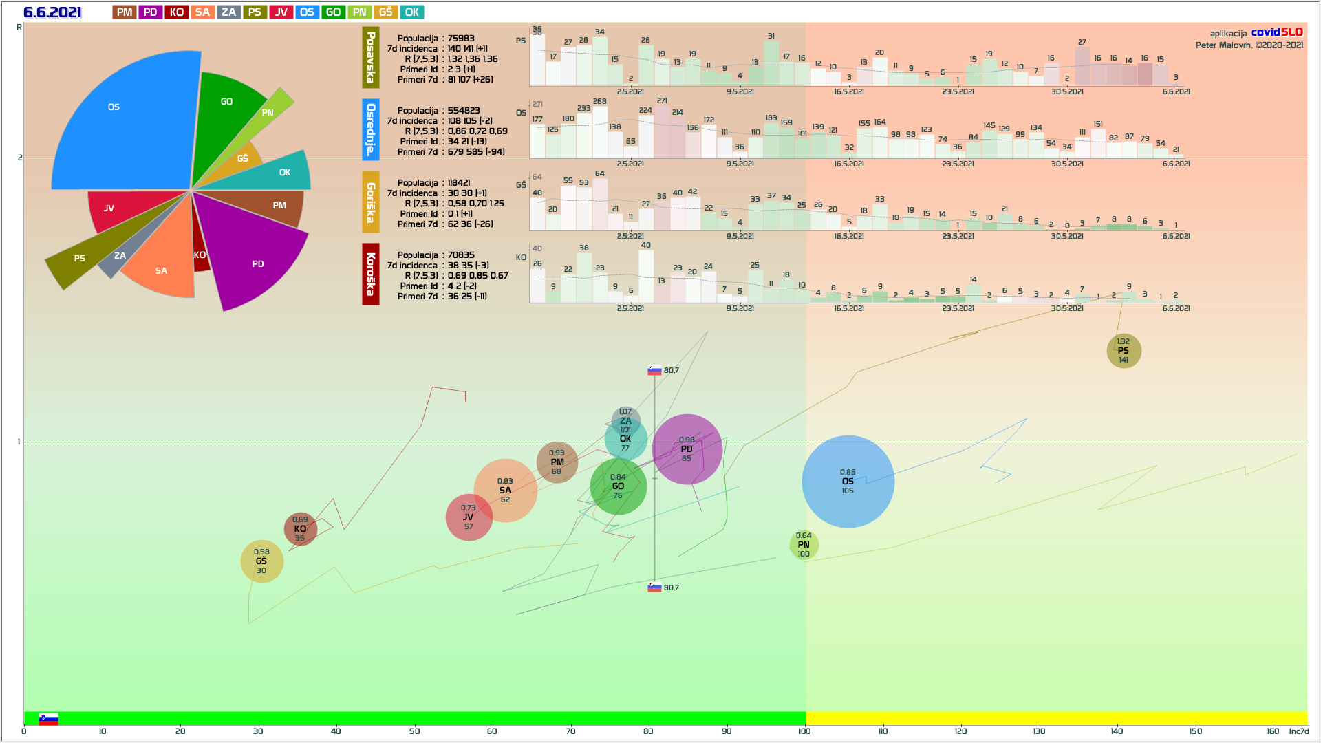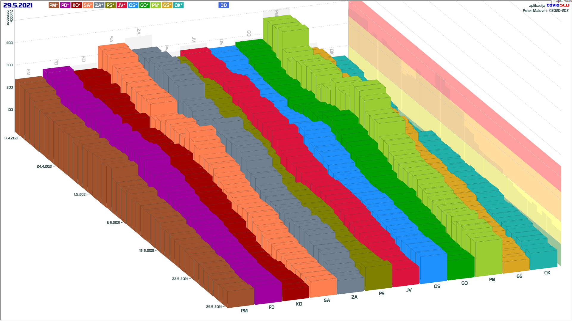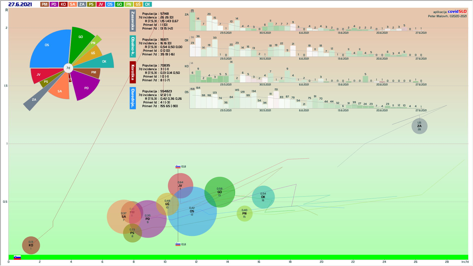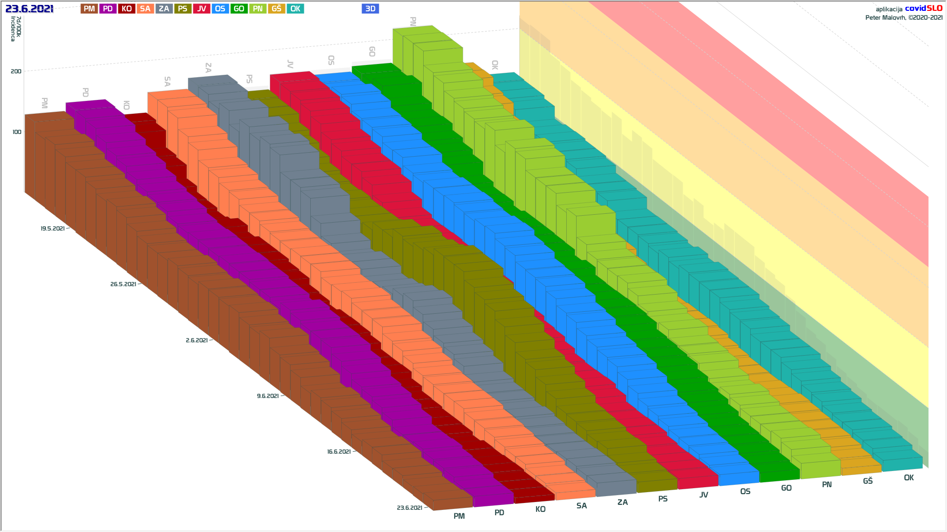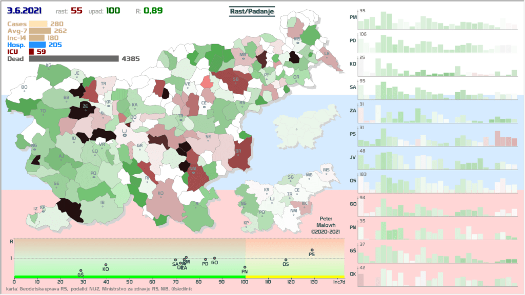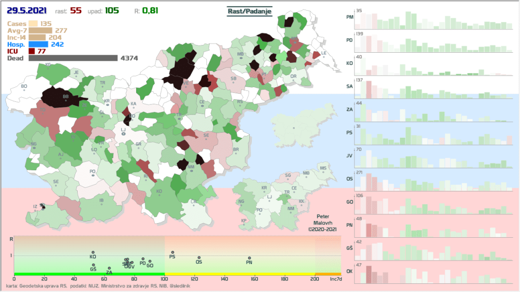 10 zelenih regij (KO, SA, PM, PS, GŠ, PD, GO, OK, JV, od danes ZA), 2 rumeni regiji (OS, PN)