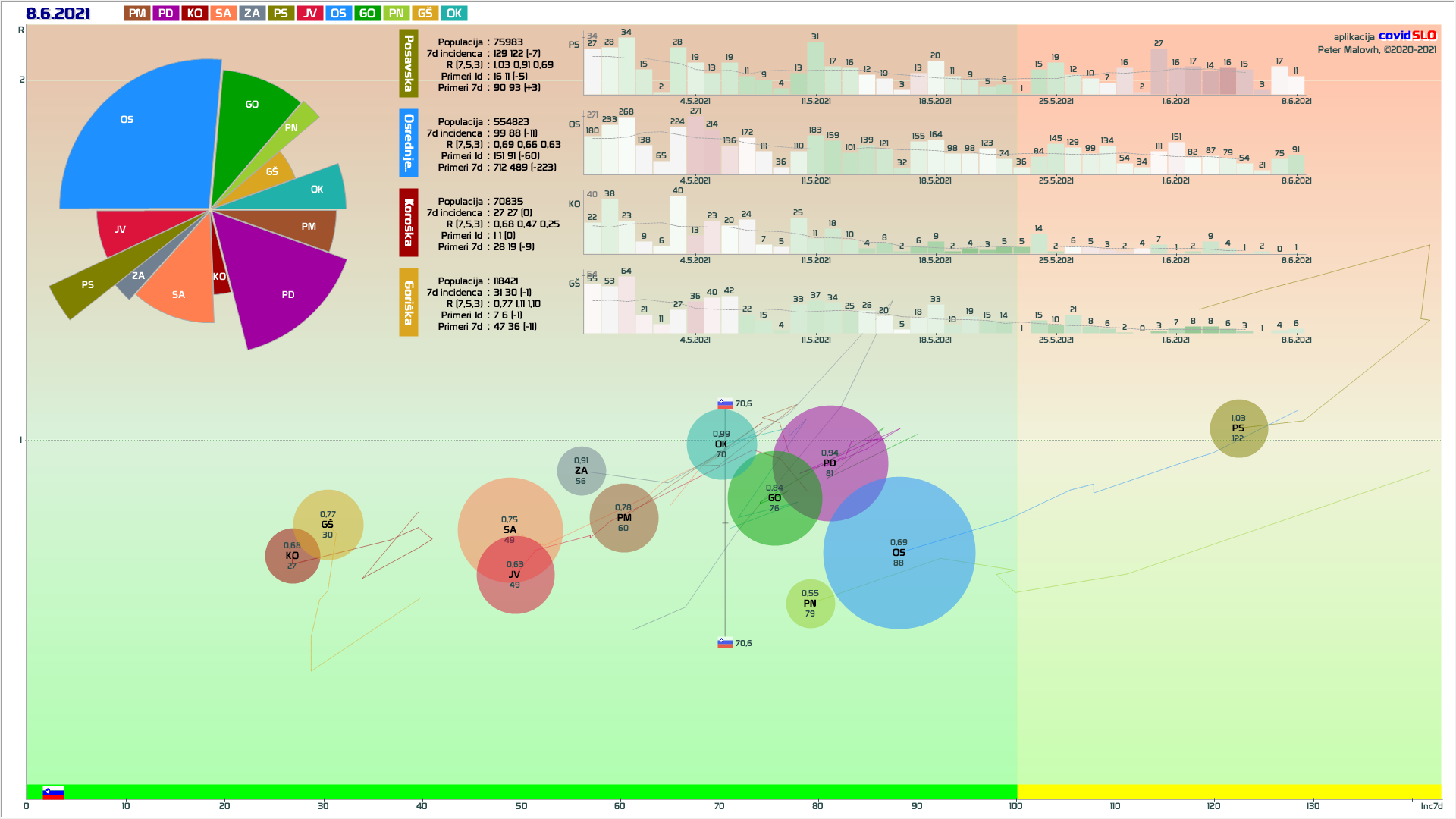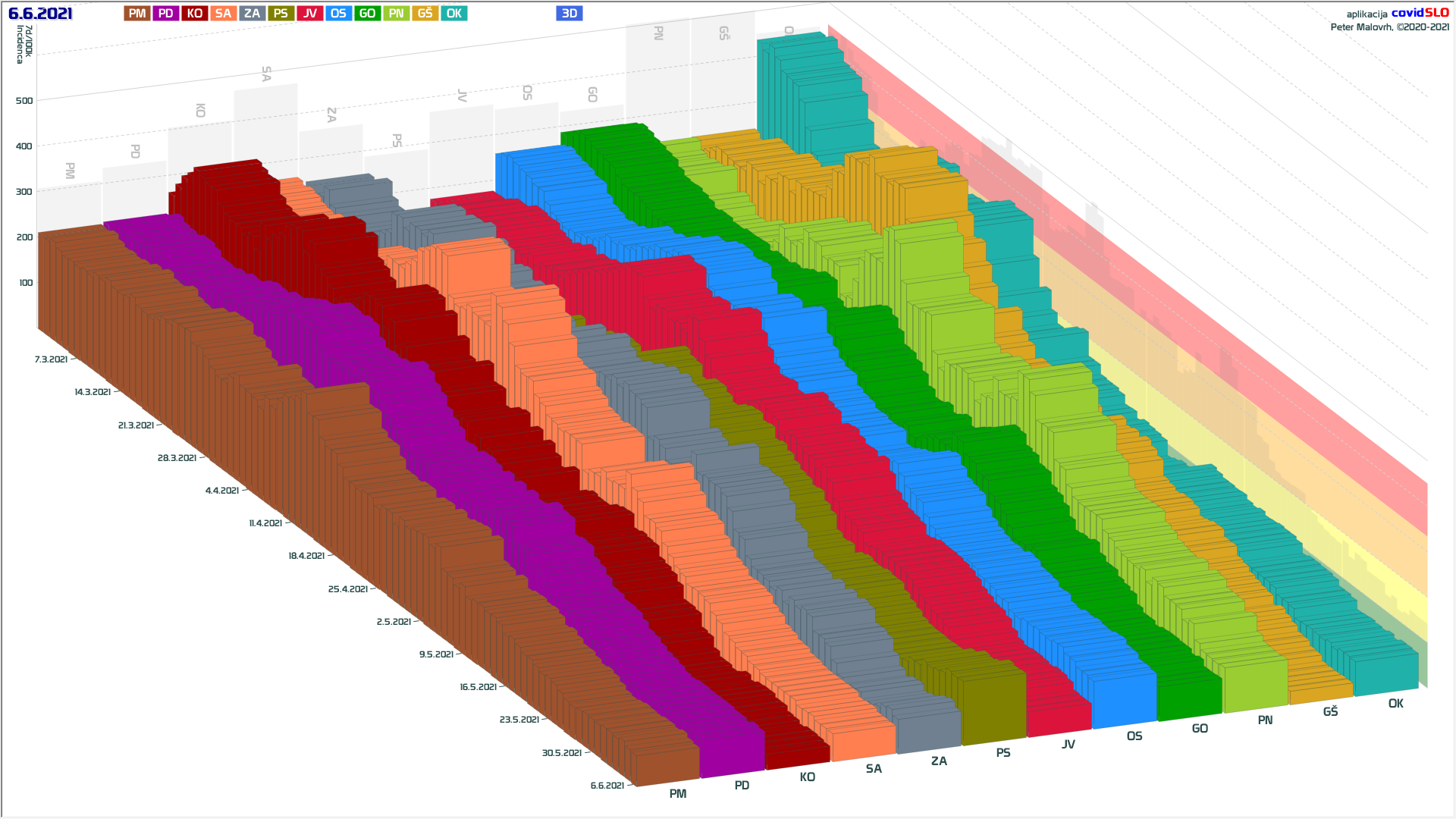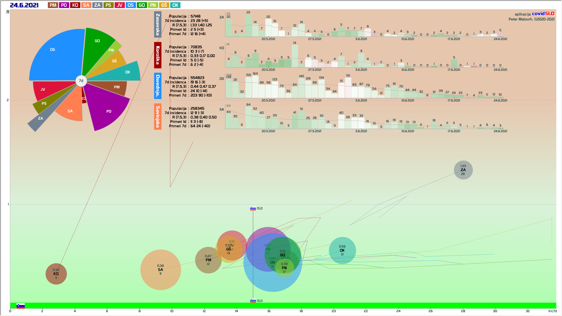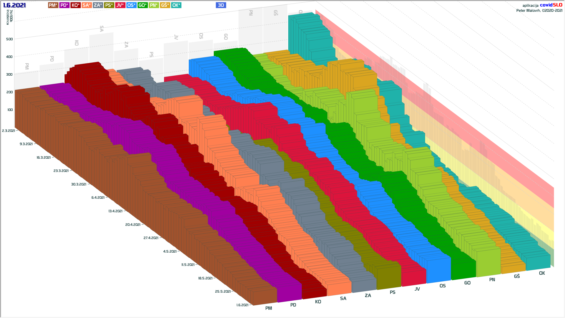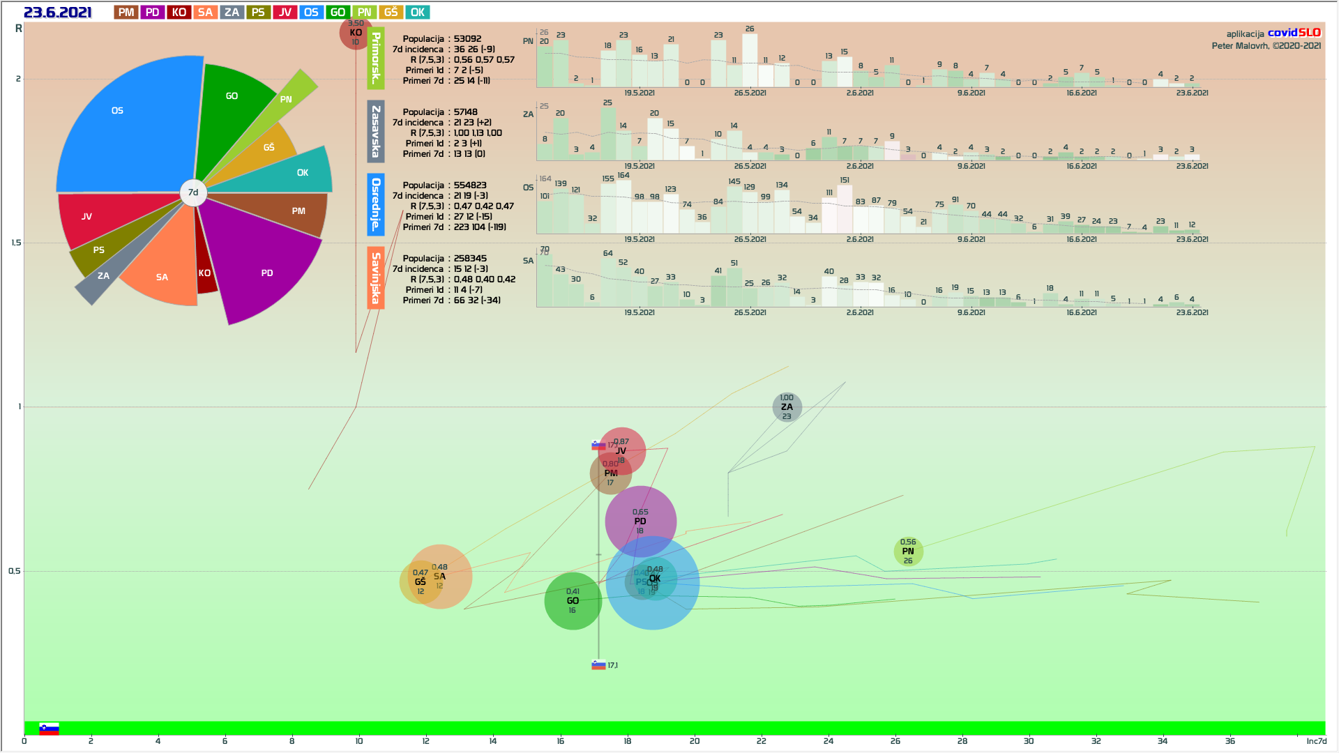 10 zelenih regij (KO, SA, PM, PS, GŠ, PD, GO, OK, JV, od danes ZA), 2 rumeni regiji (OS, PN)