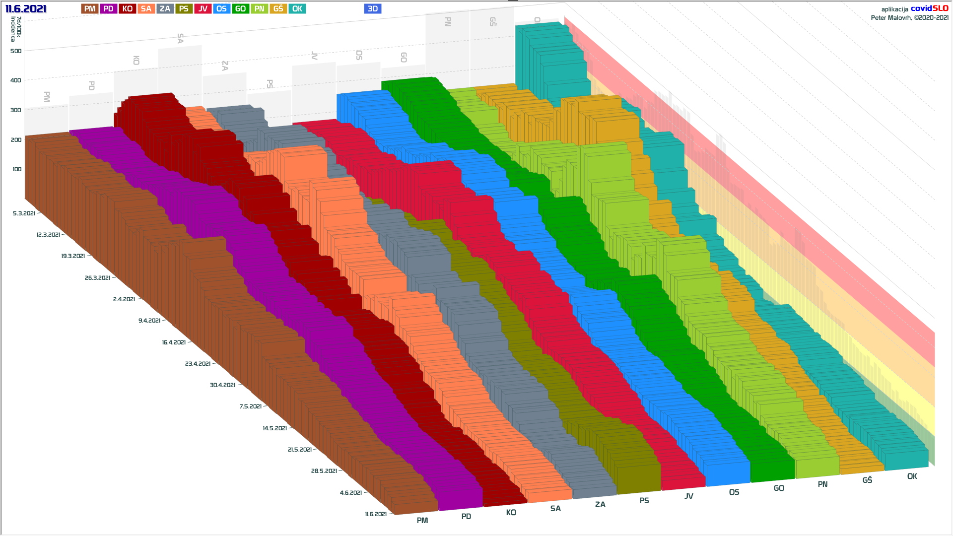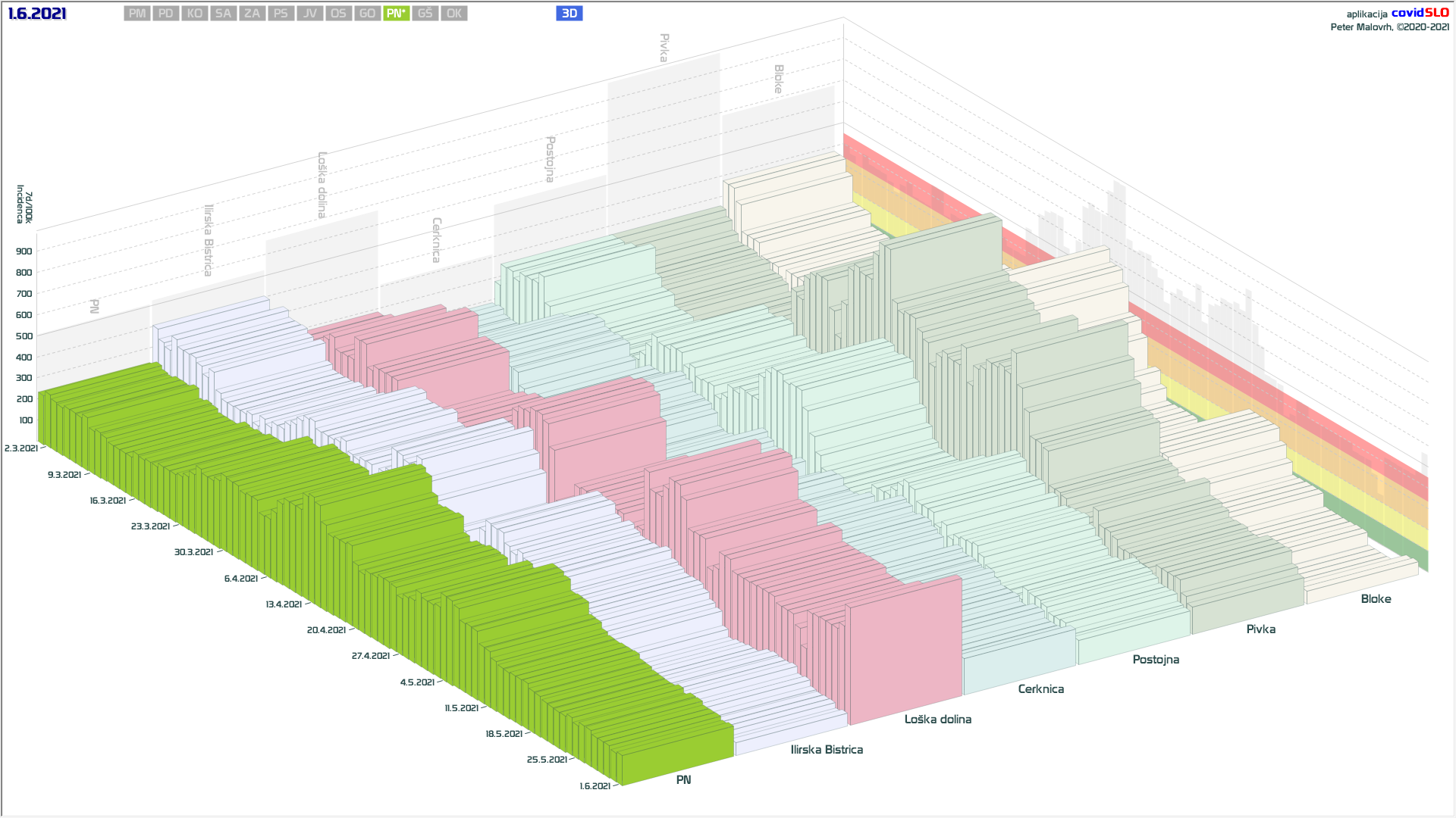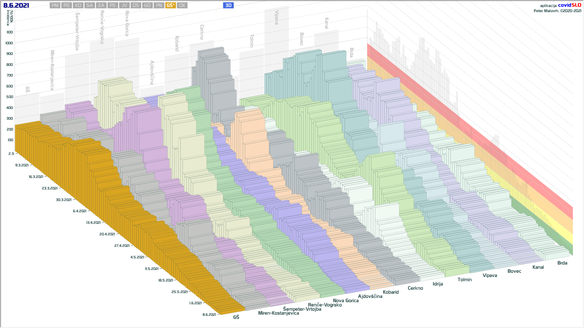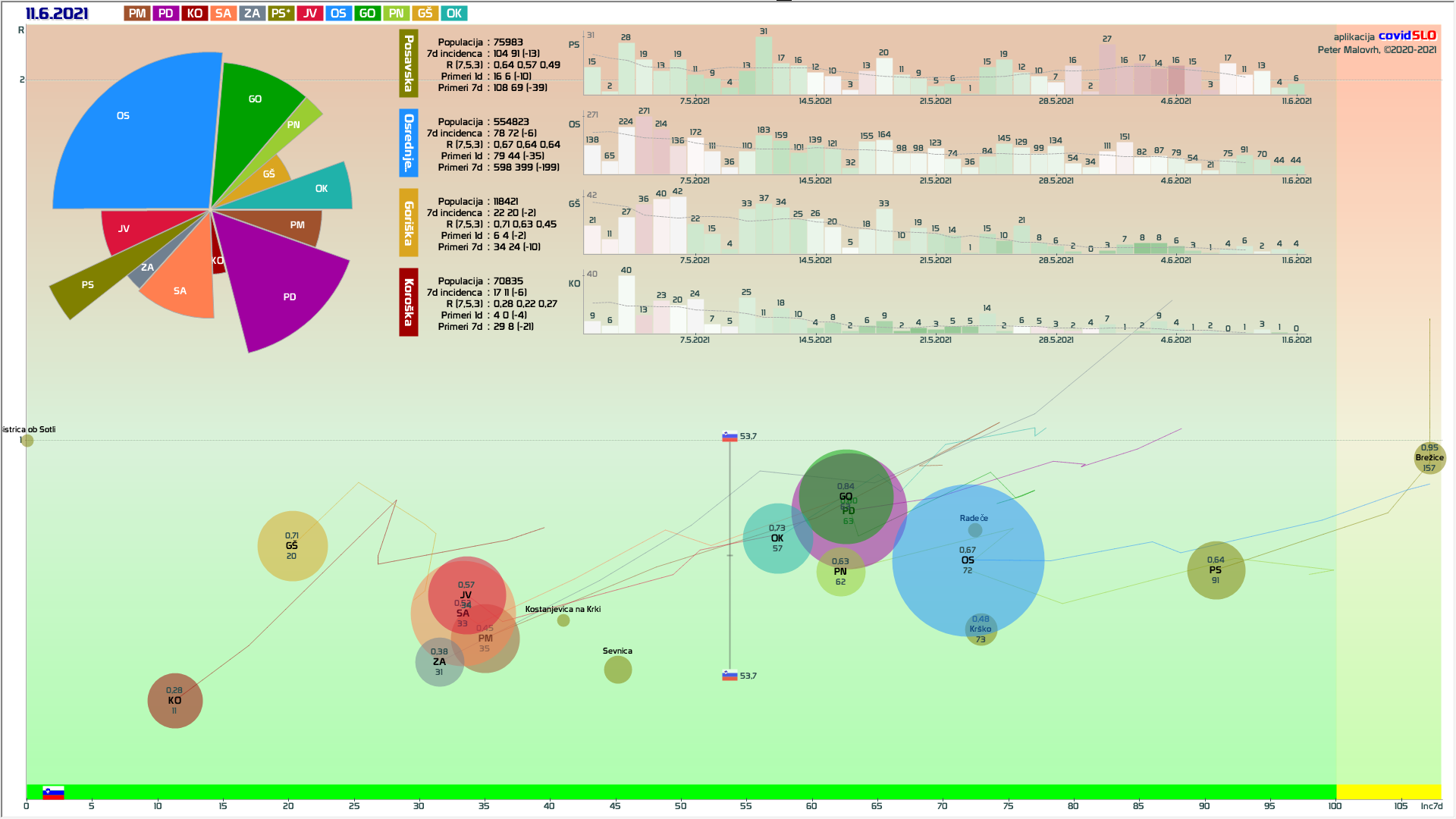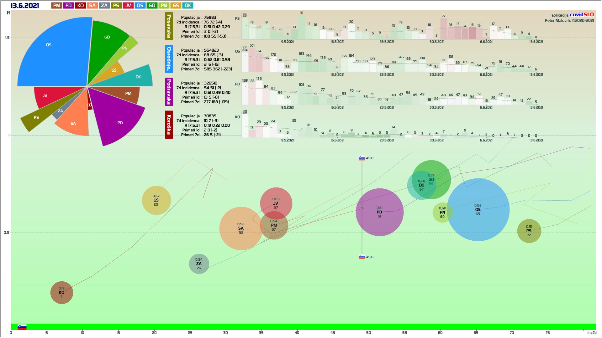 10 zelenih regij (KO, SA, PM, PS, GŠ, PD, GO, OK, JV, od danes ZA), 2 rumeni regiji (OS, PN)