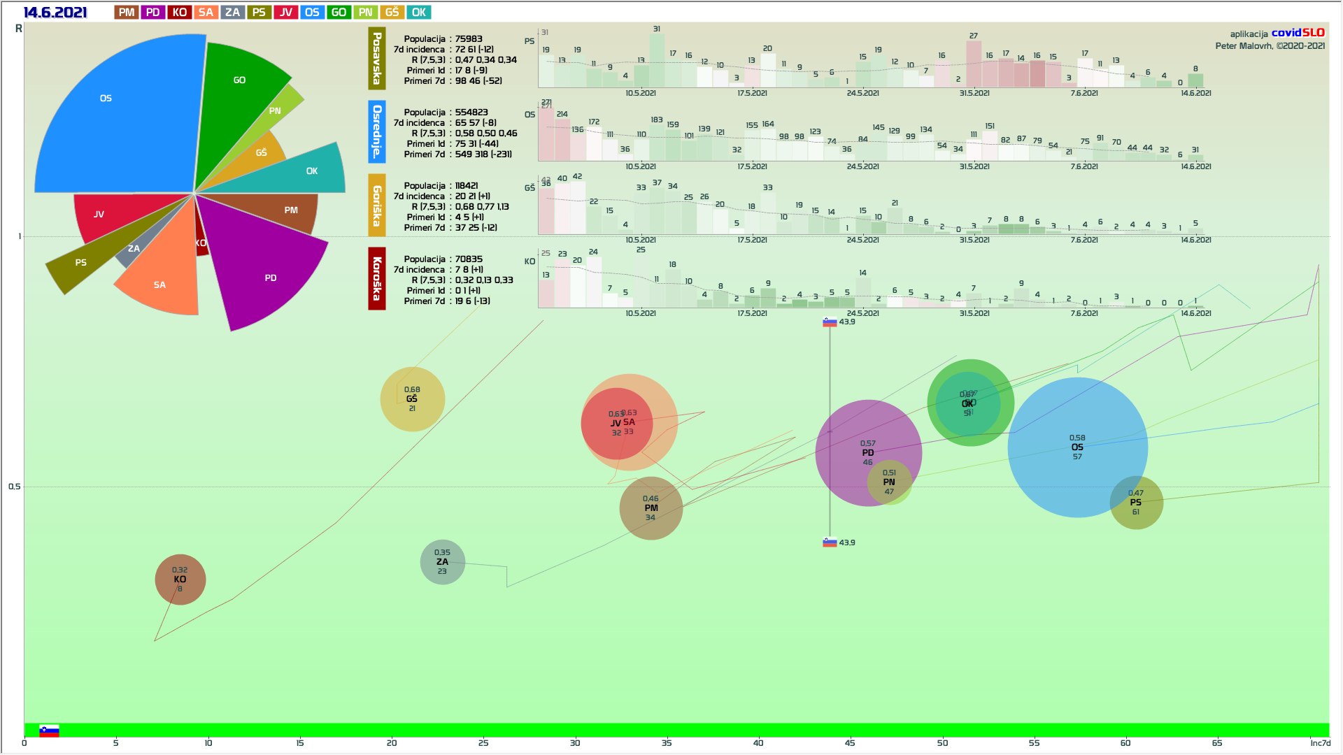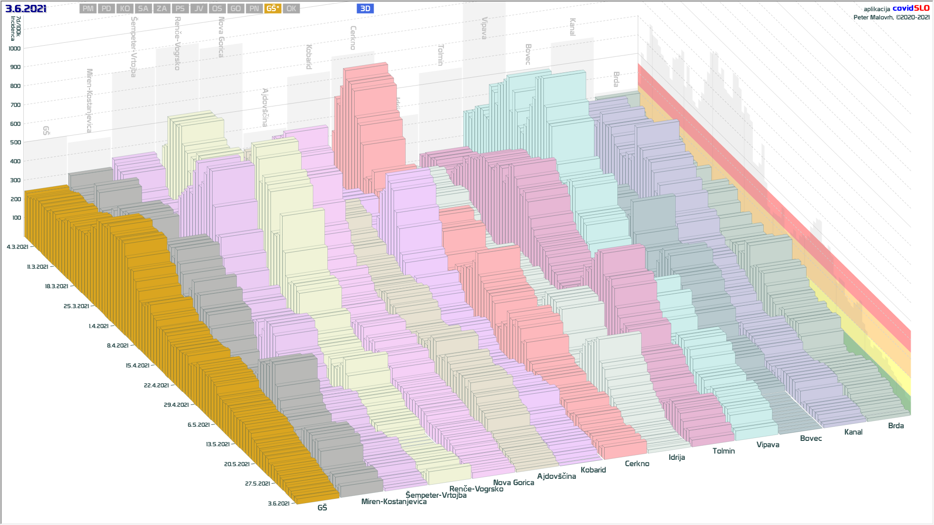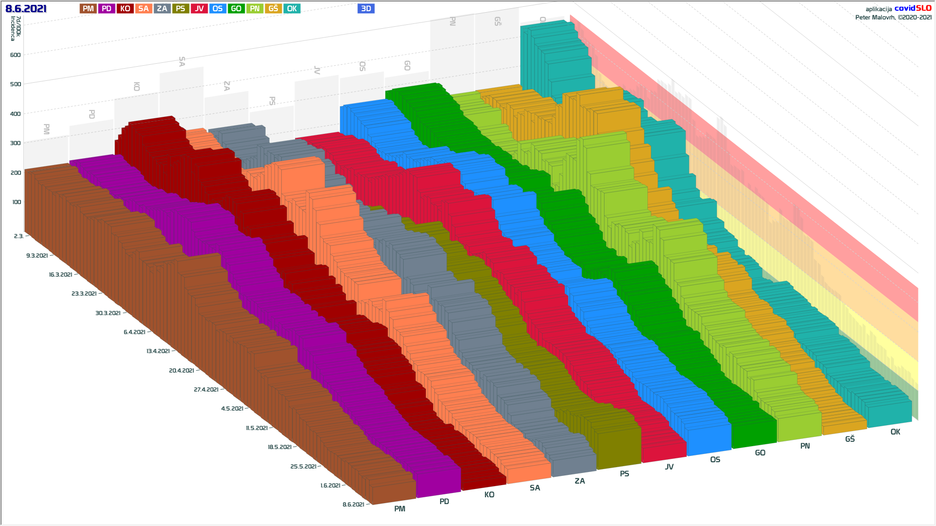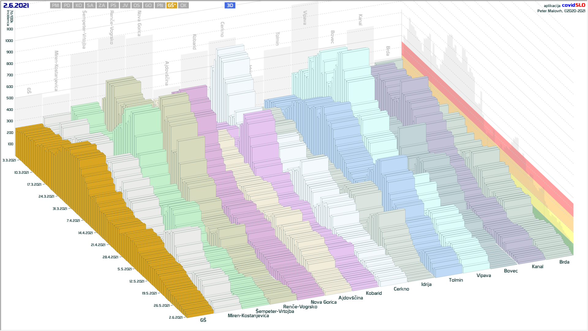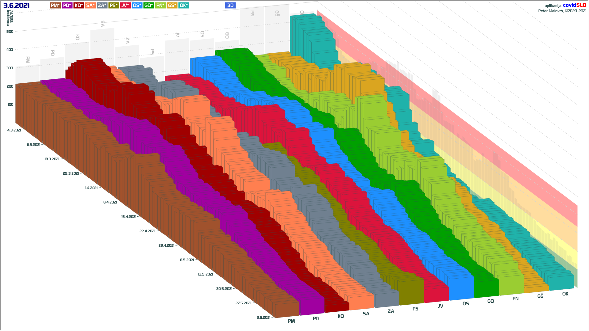 10 zelenih regij (KO, SA, PM, PS, GŠ, PD, GO, OK, JV, od danes ZA), 2 rumeni regiji (OS, PN)