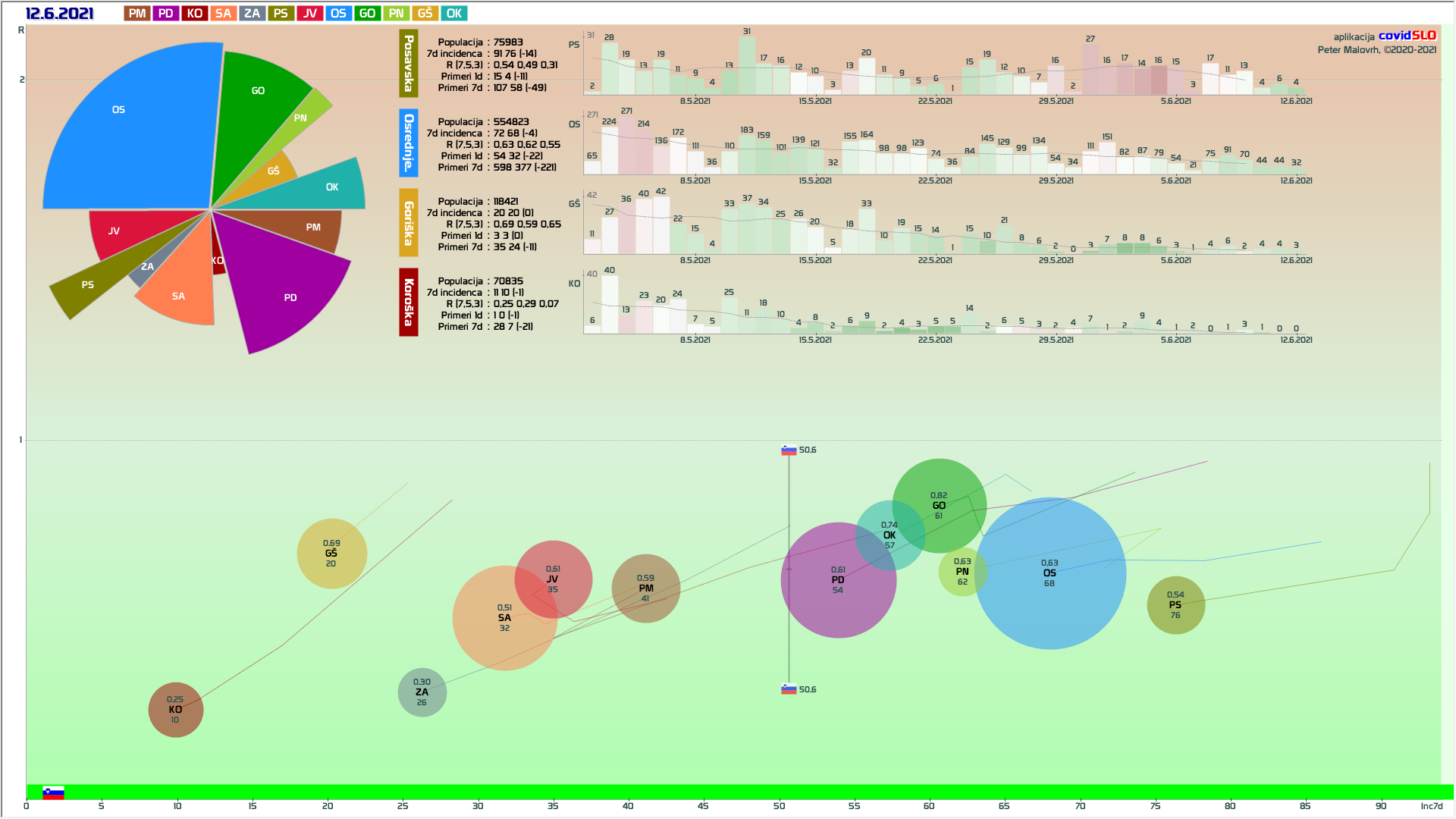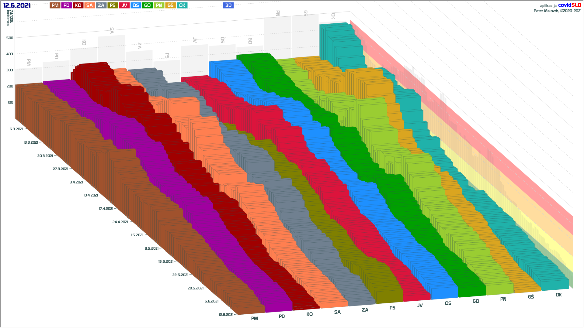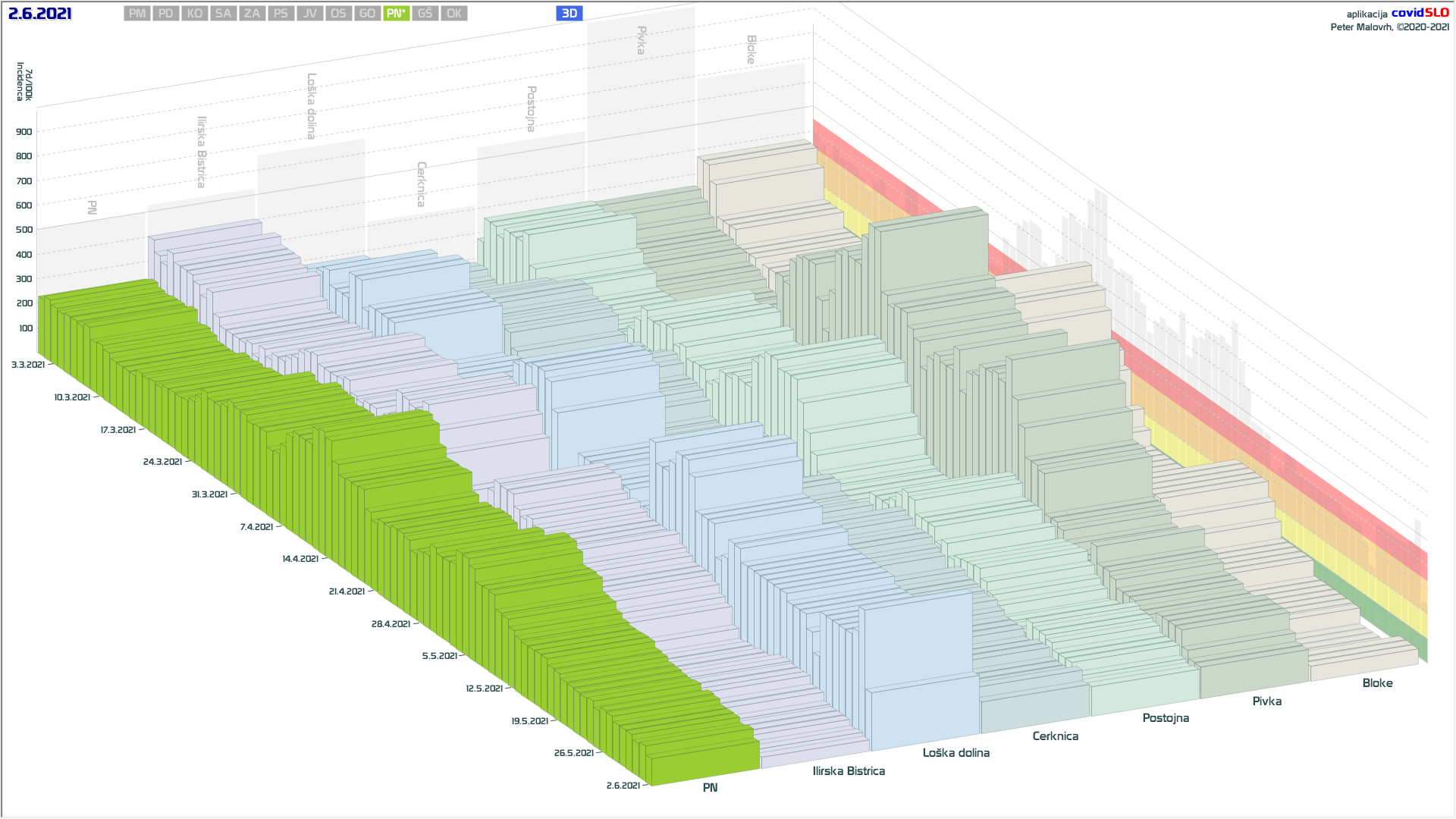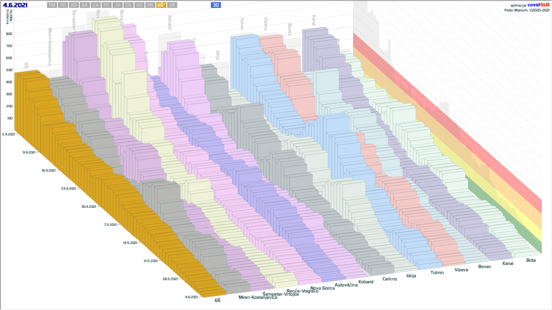 10 zelenih regij (KO, SA, PM, PS, GŠ, PD, GO, OK, JV, od danes ZA), 2 rumeni regiji (OS, PN)