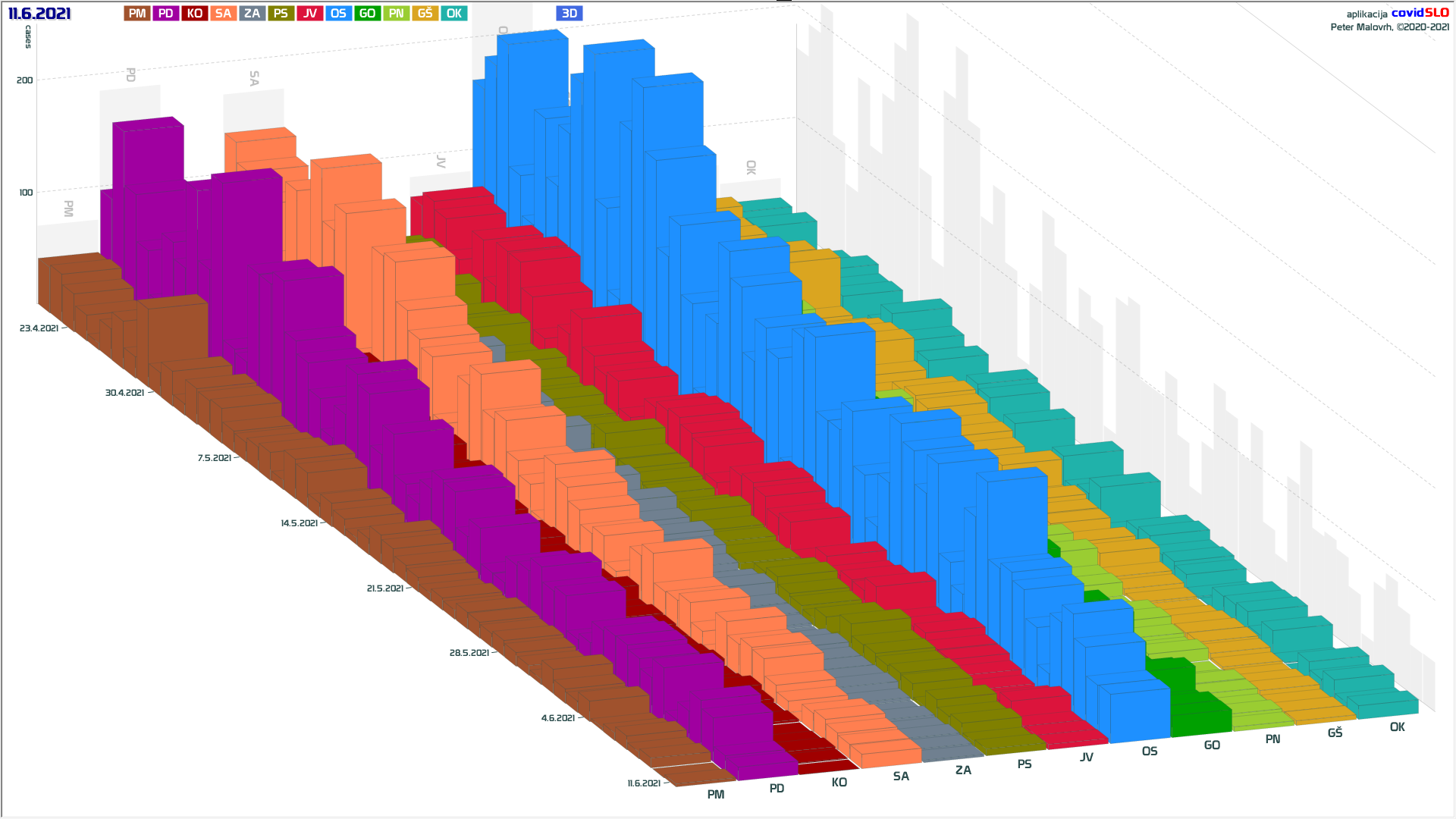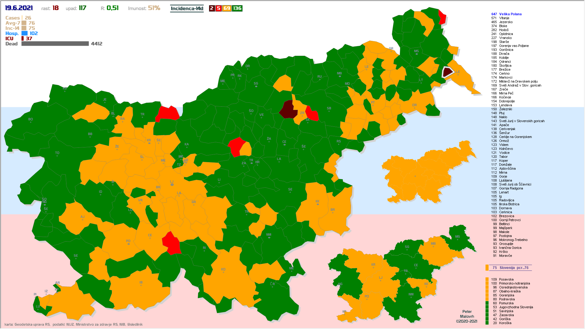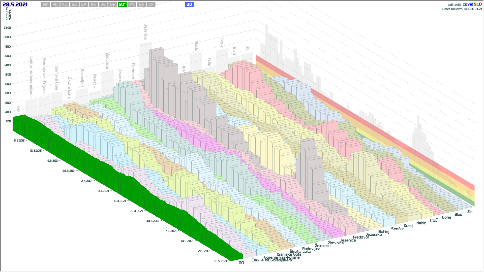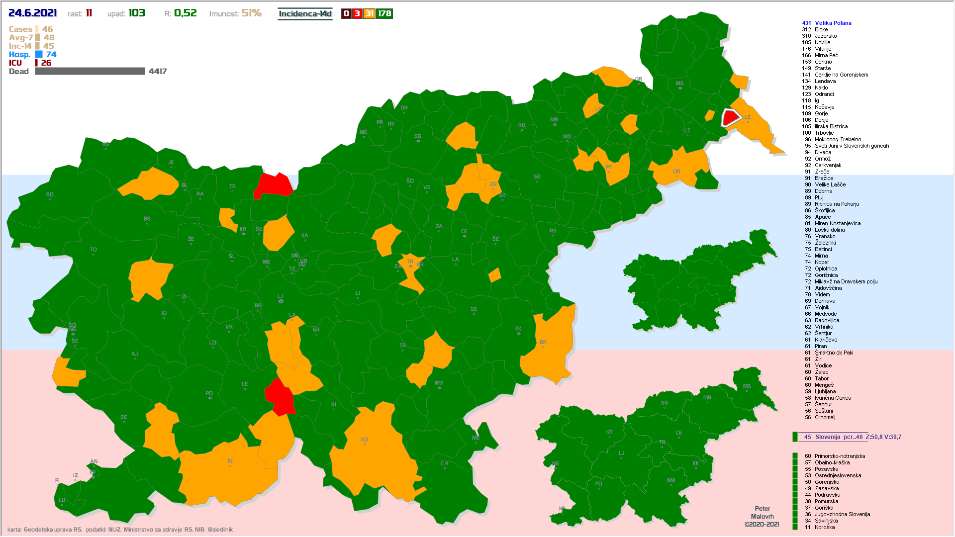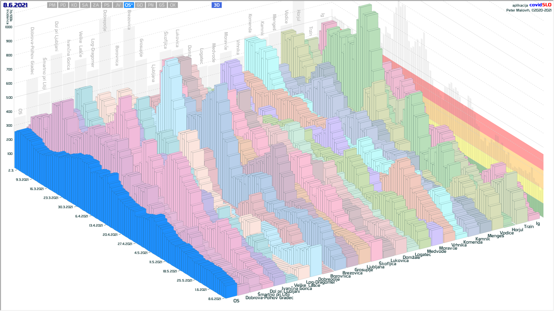 10 zelenih regij (KO, SA, PM, PS, GŠ, PD, GO, OK, JV, od danes ZA), 2 rumeni regiji (OS, PN)