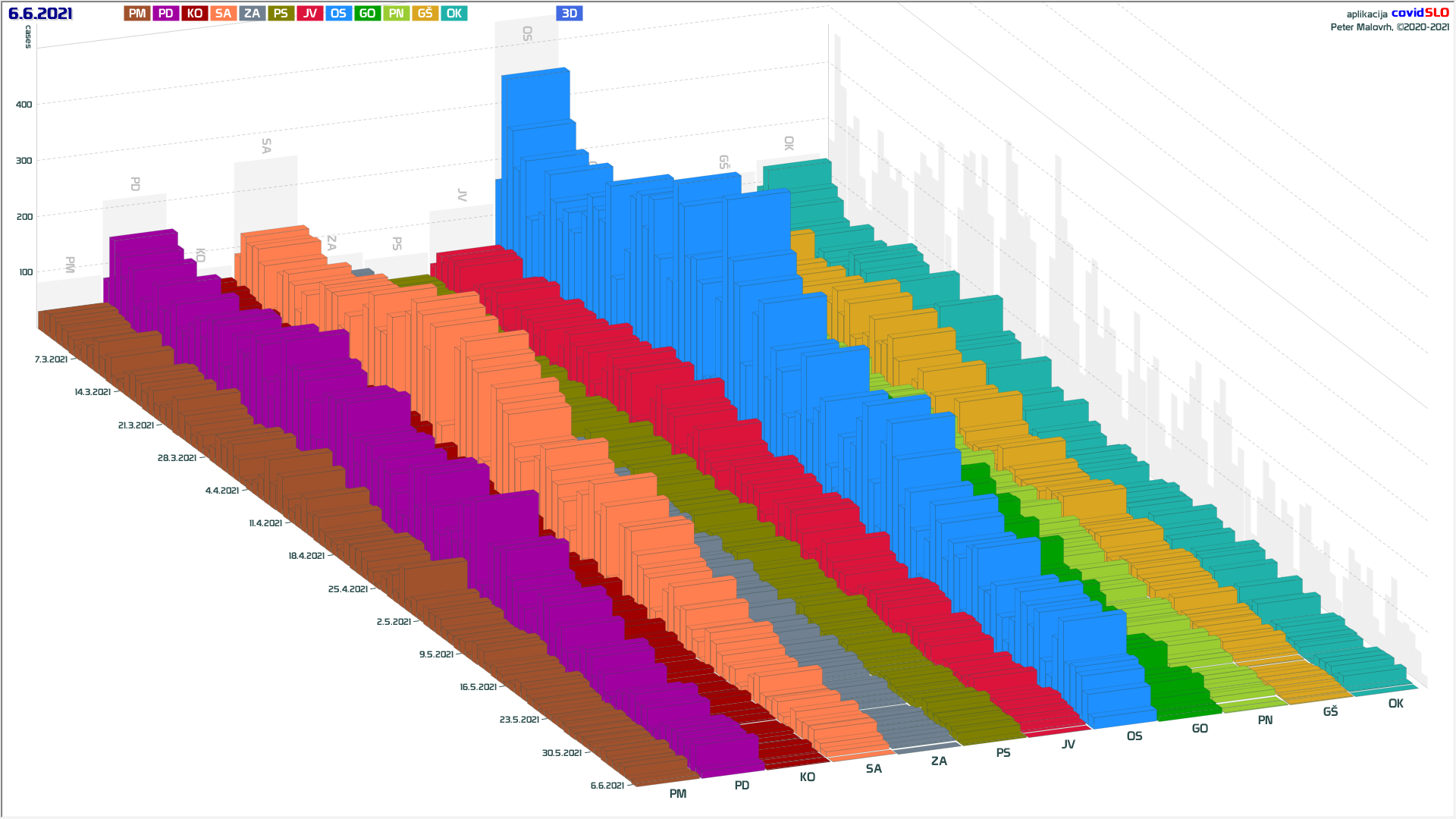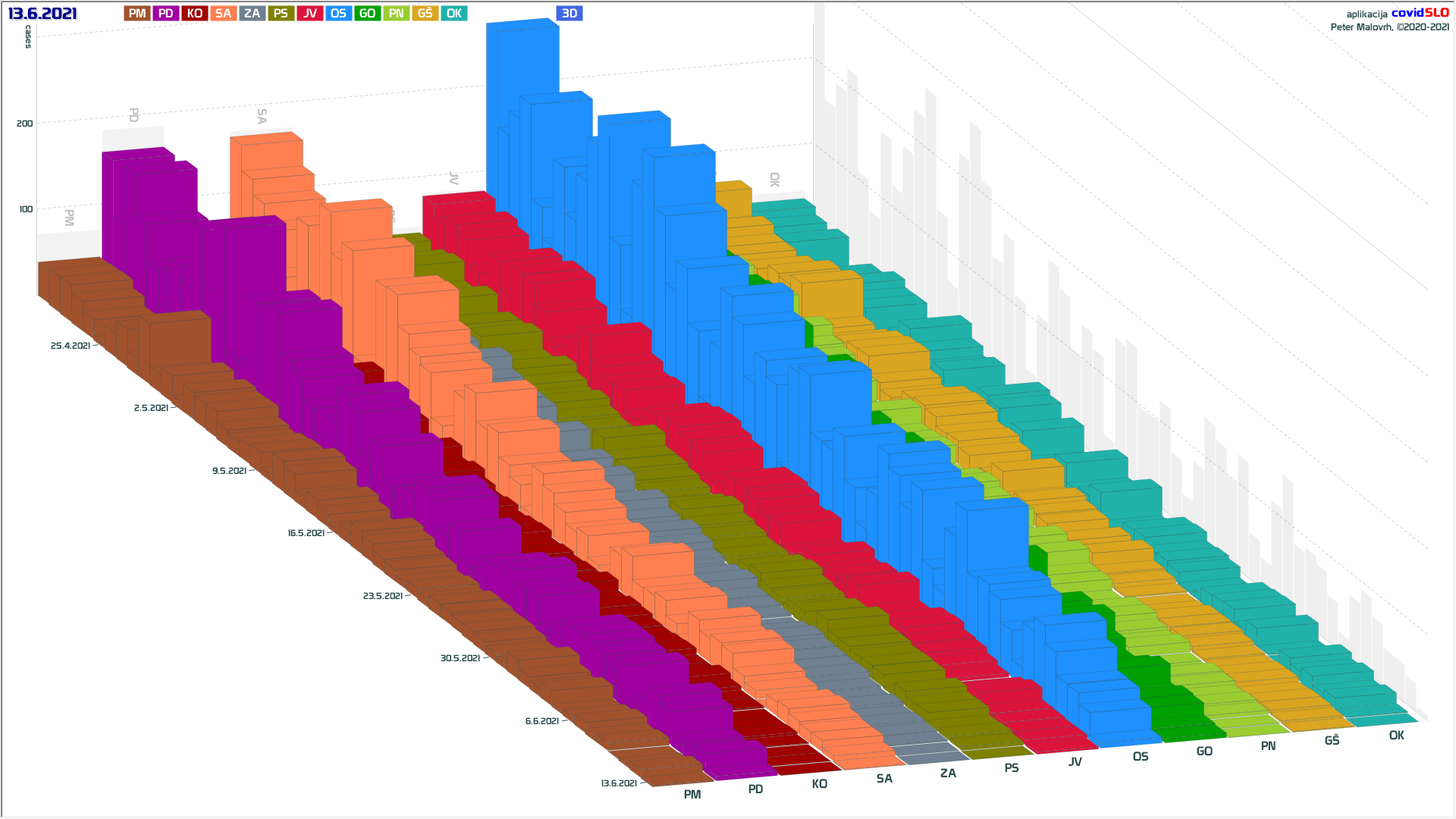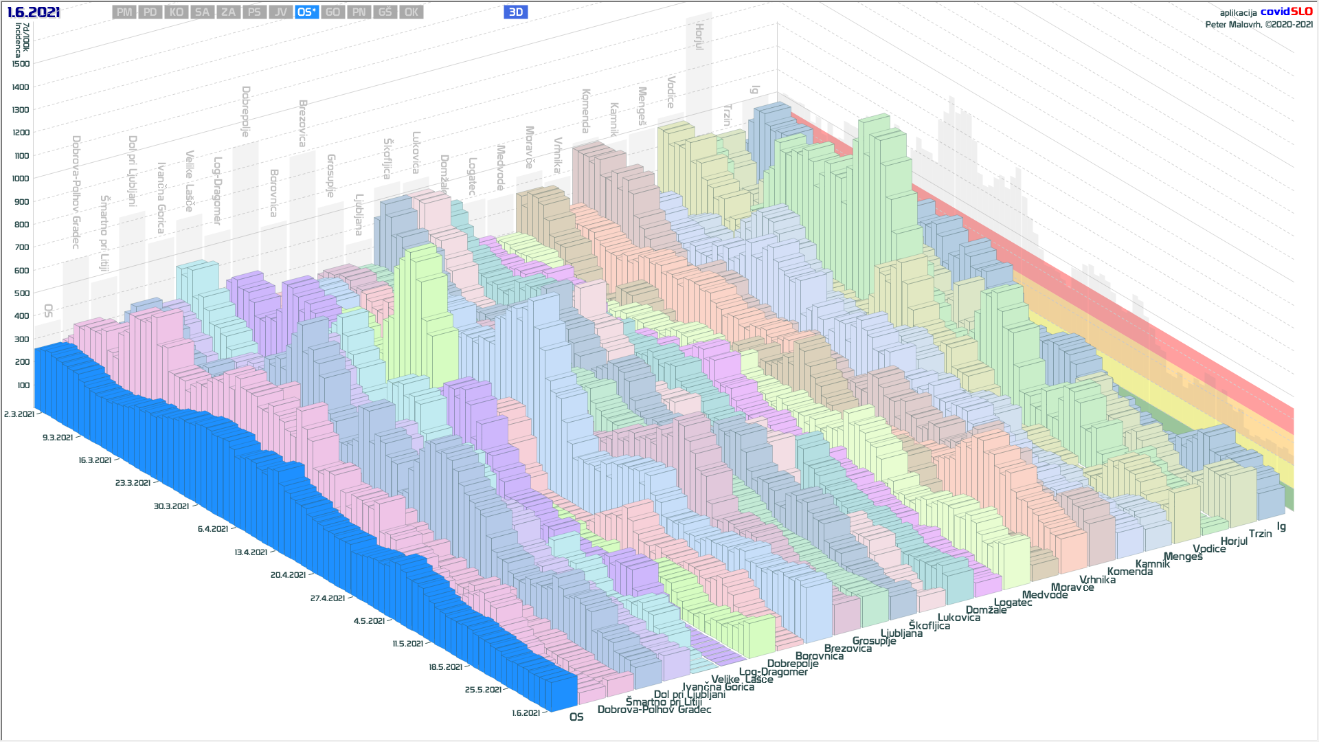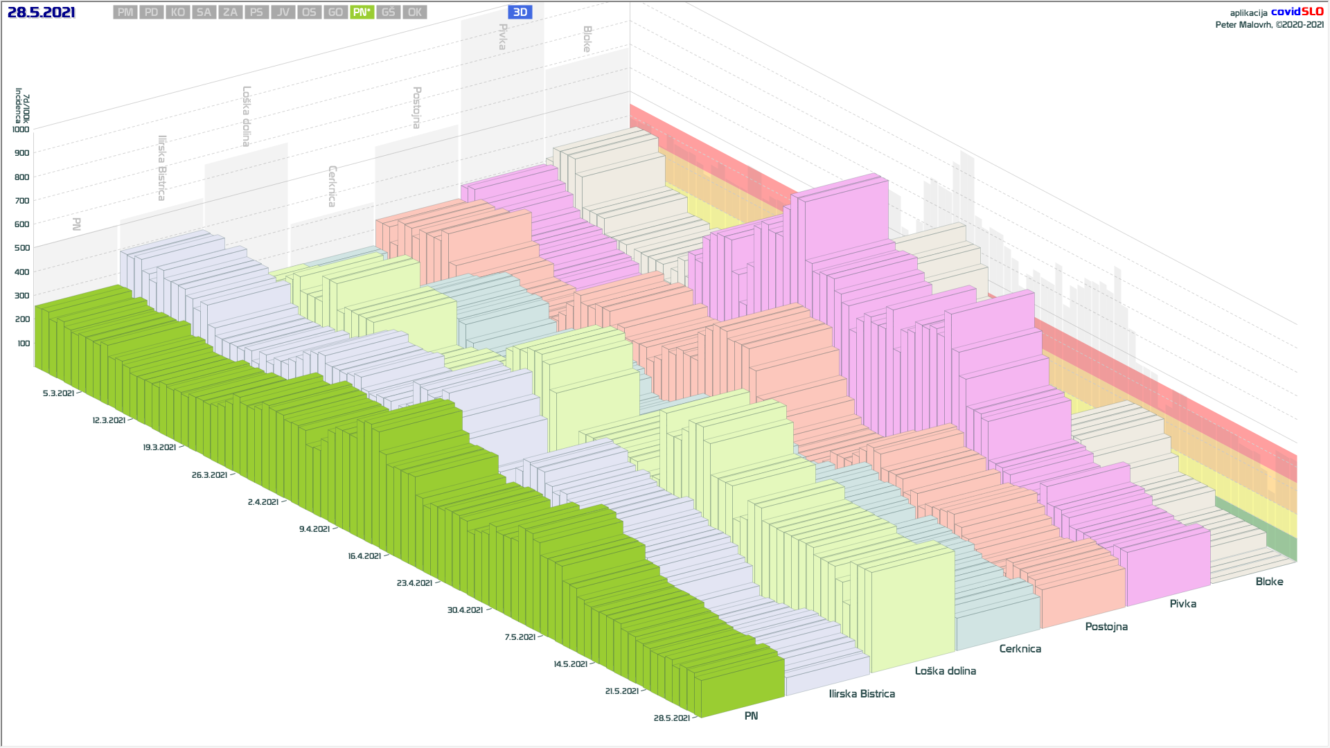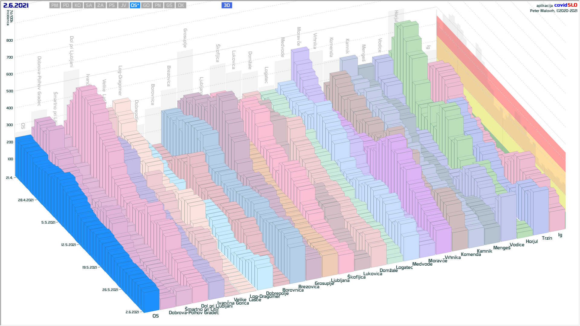 10 zelenih regij (KO, SA, PM, PS, GŠ, PD, GO, OK, JV, od danes ZA), 2 rumeni regiji (OS, PN)