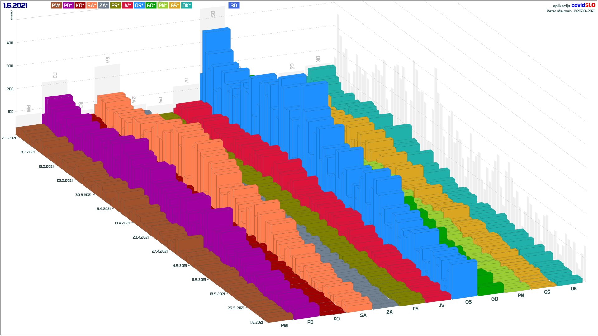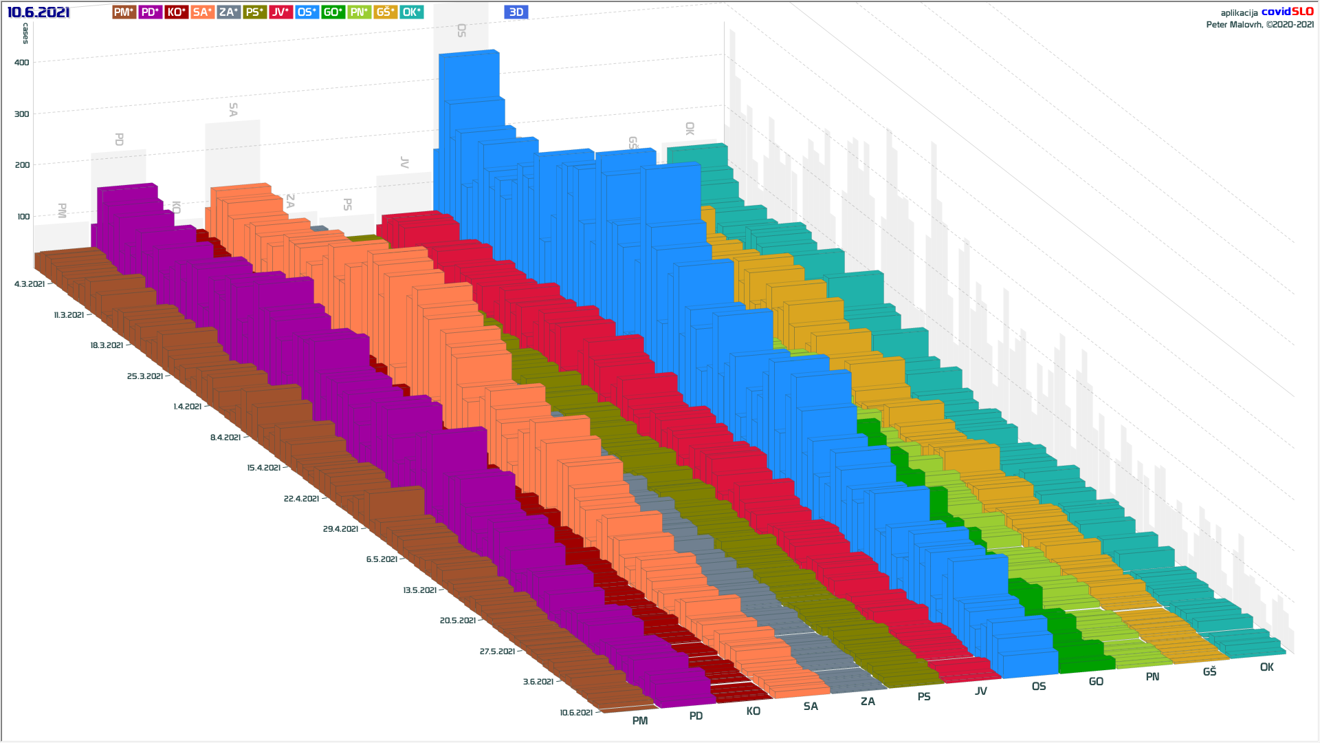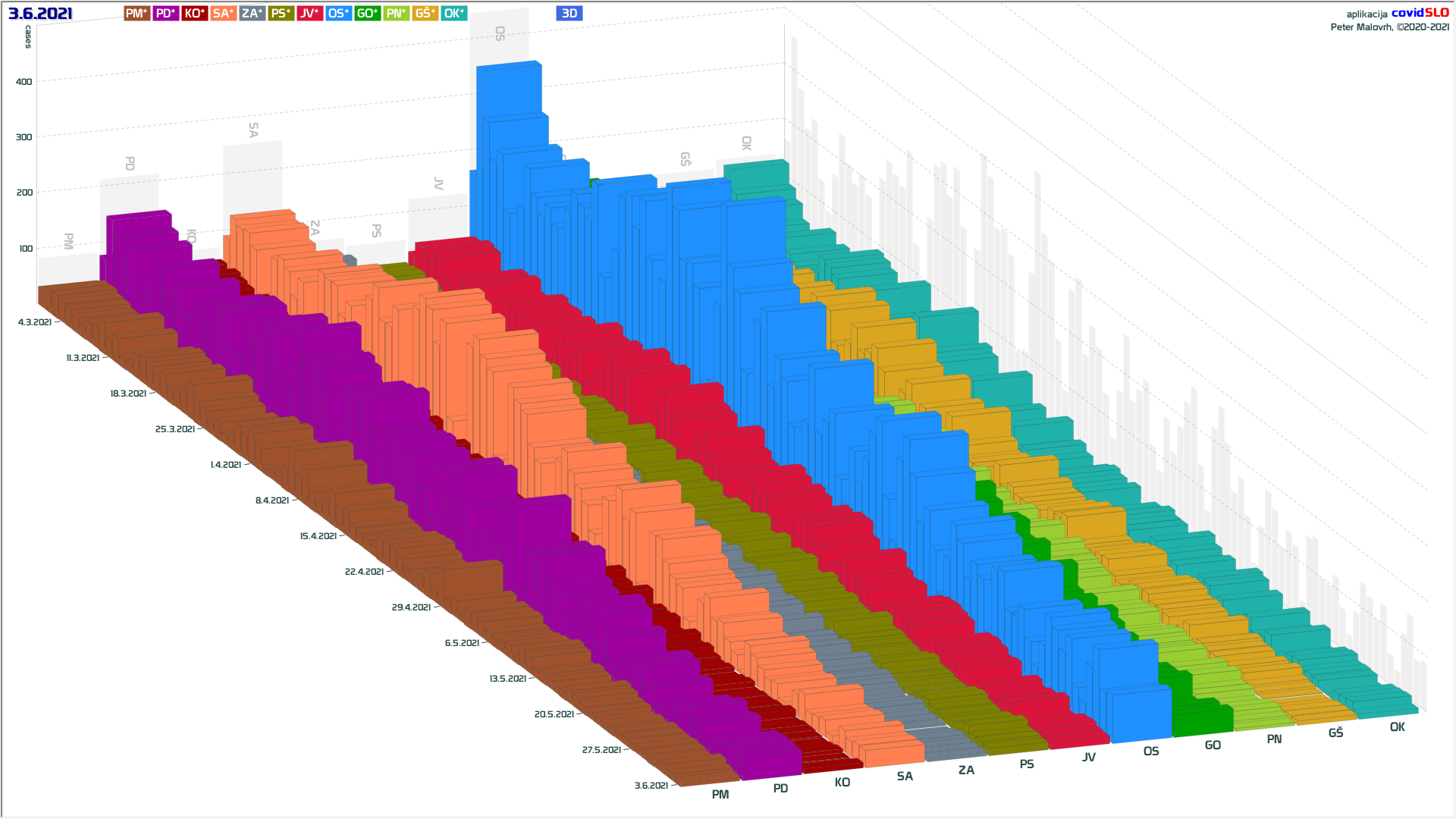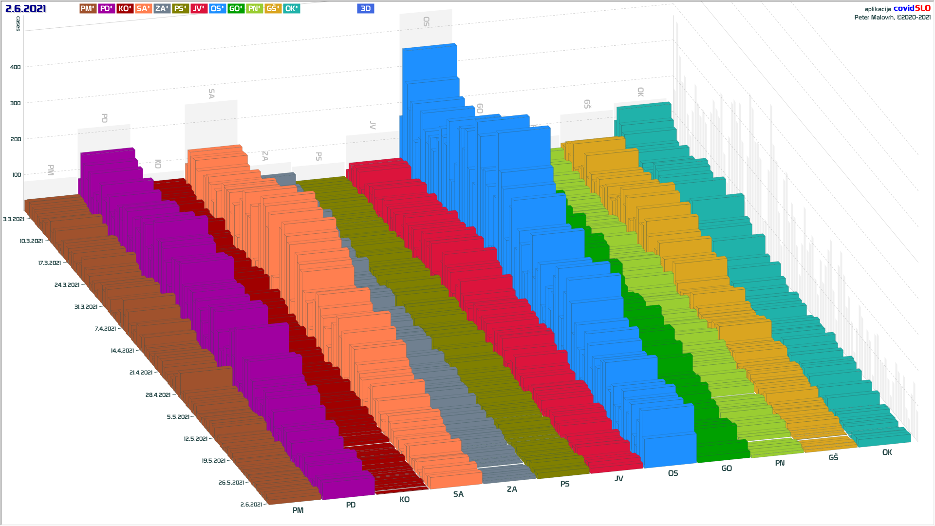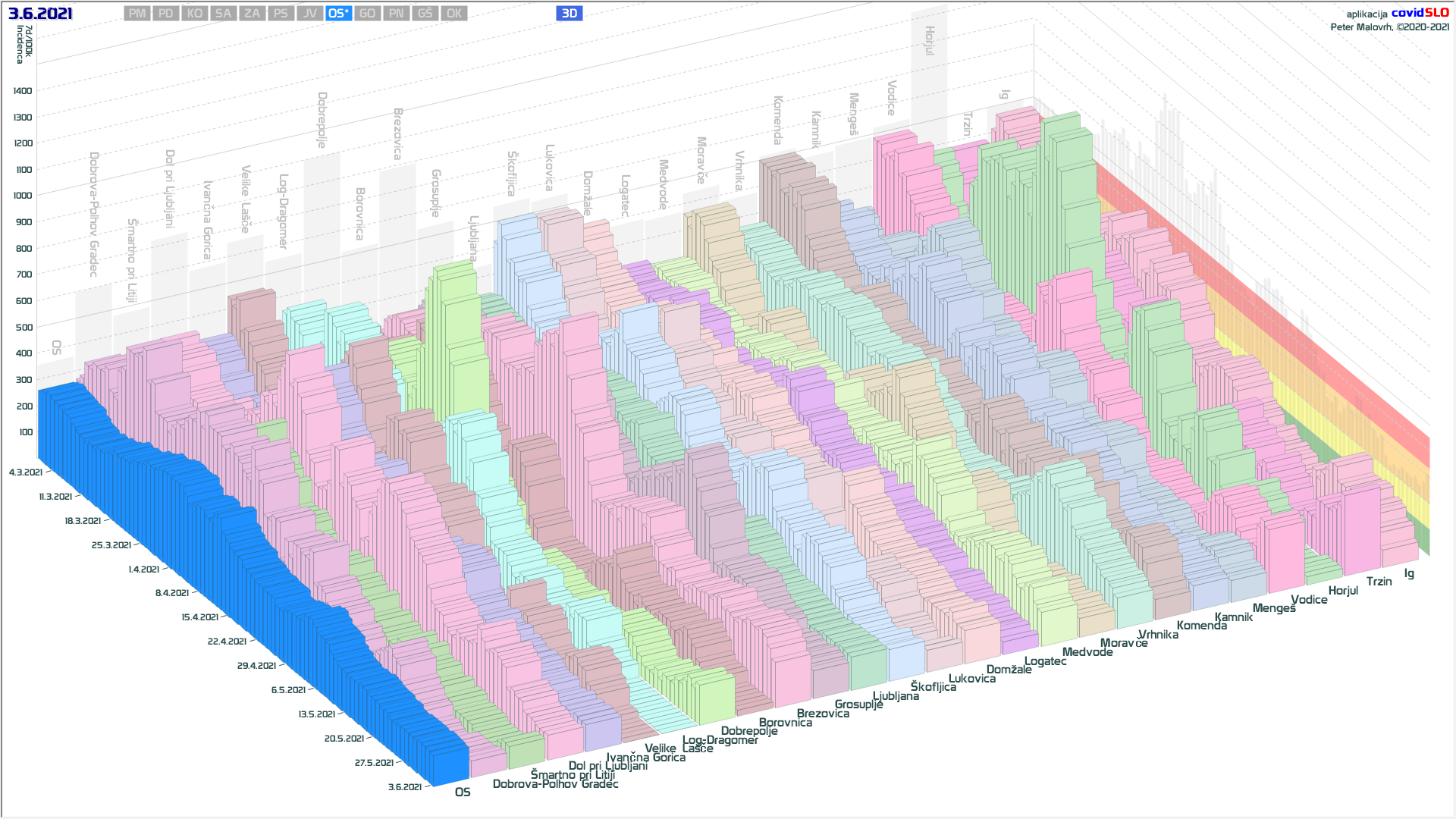 10 zelenih regij (KO, SA, PM, PS, GŠ, PD, GO, OK, JV, od danes ZA), 2 rumeni regiji (OS, PN)