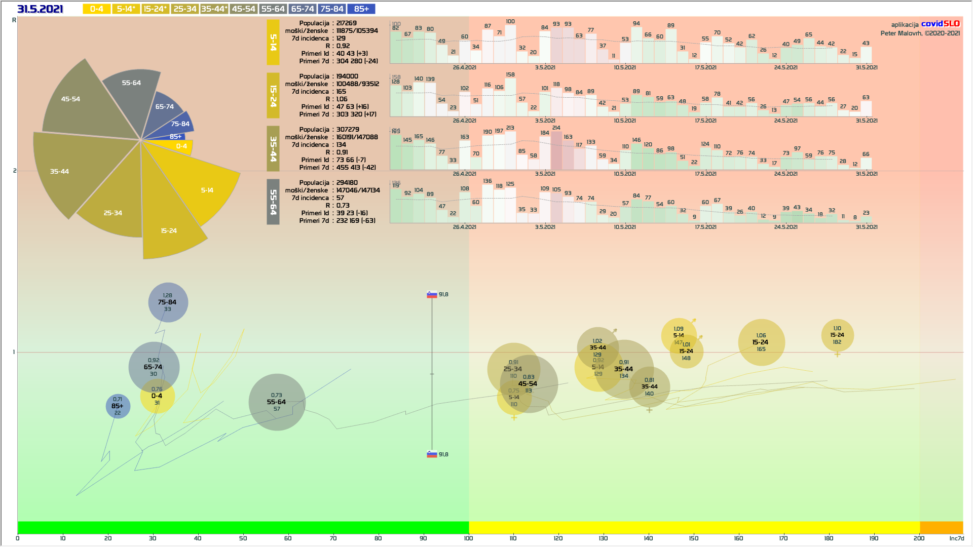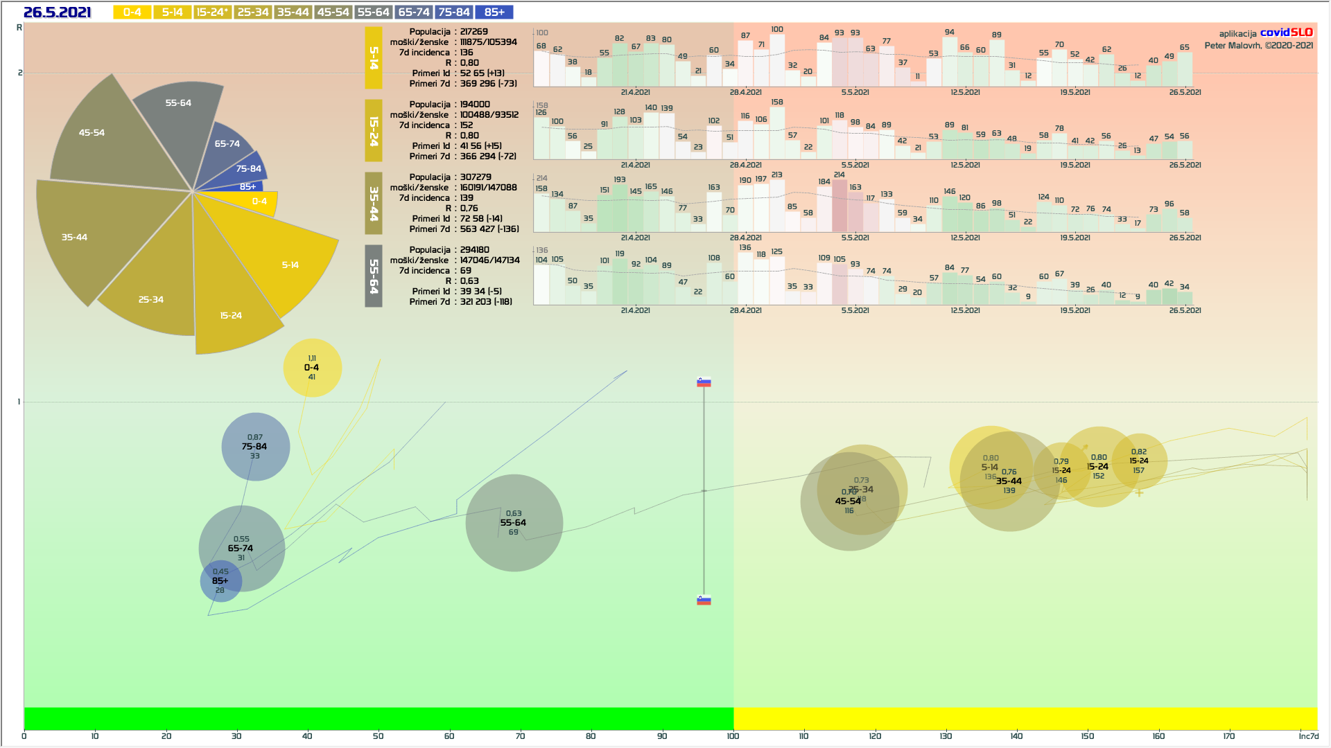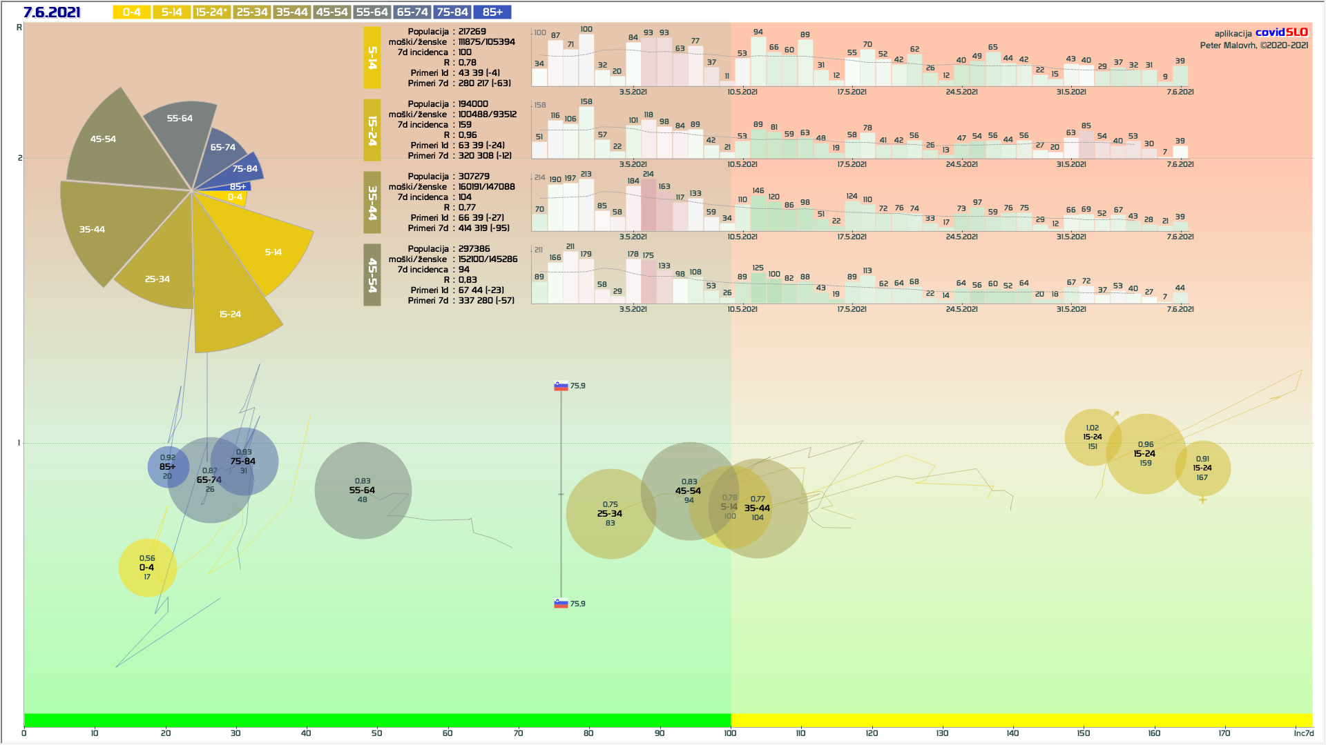 R (izračunan za en teden nazaj) je 0.75 (80% teže na R iz števila primerov, 20% iz deleža pozitivnih).