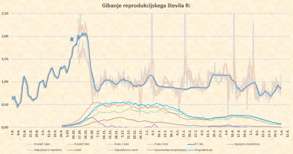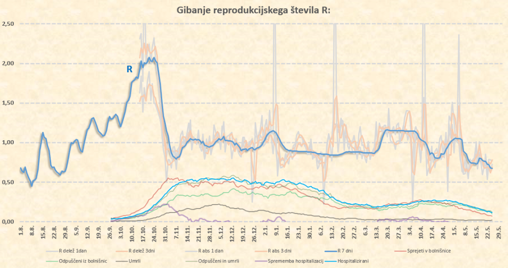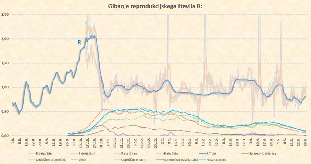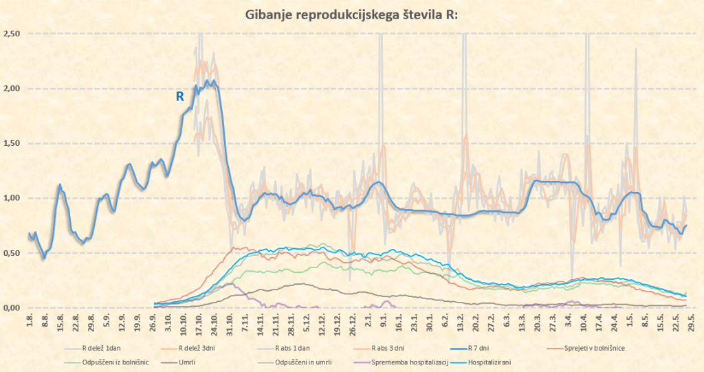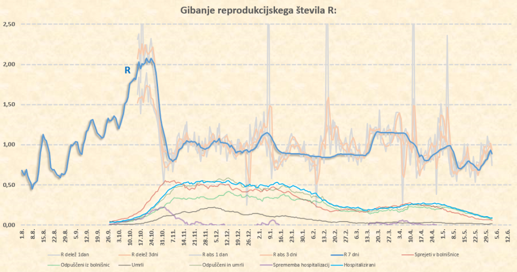 Zdaj sta na vrsti 2 dneva, ki nista masivna, in ne bosta kaj dosti novega povedala. Kaj več bomo lahko povedali v sredo 2.6., ko dobimo podatke za torek. Treba je povedati, da imamo veliko sproščanj, tekme z veliko gledalci, množične proteste in še kaj, kar deluje v smeri povečevanja našega R. Tudi zapoznel efekt konca prvomajskih počitnic.