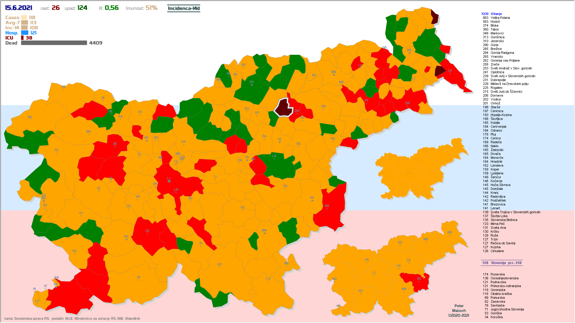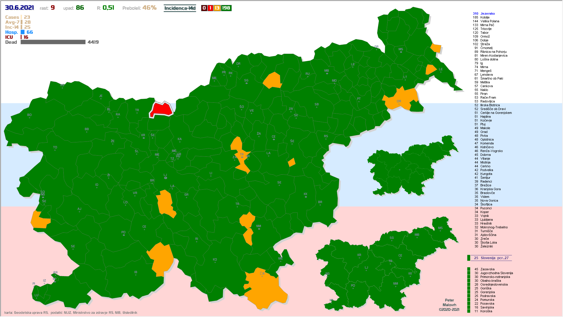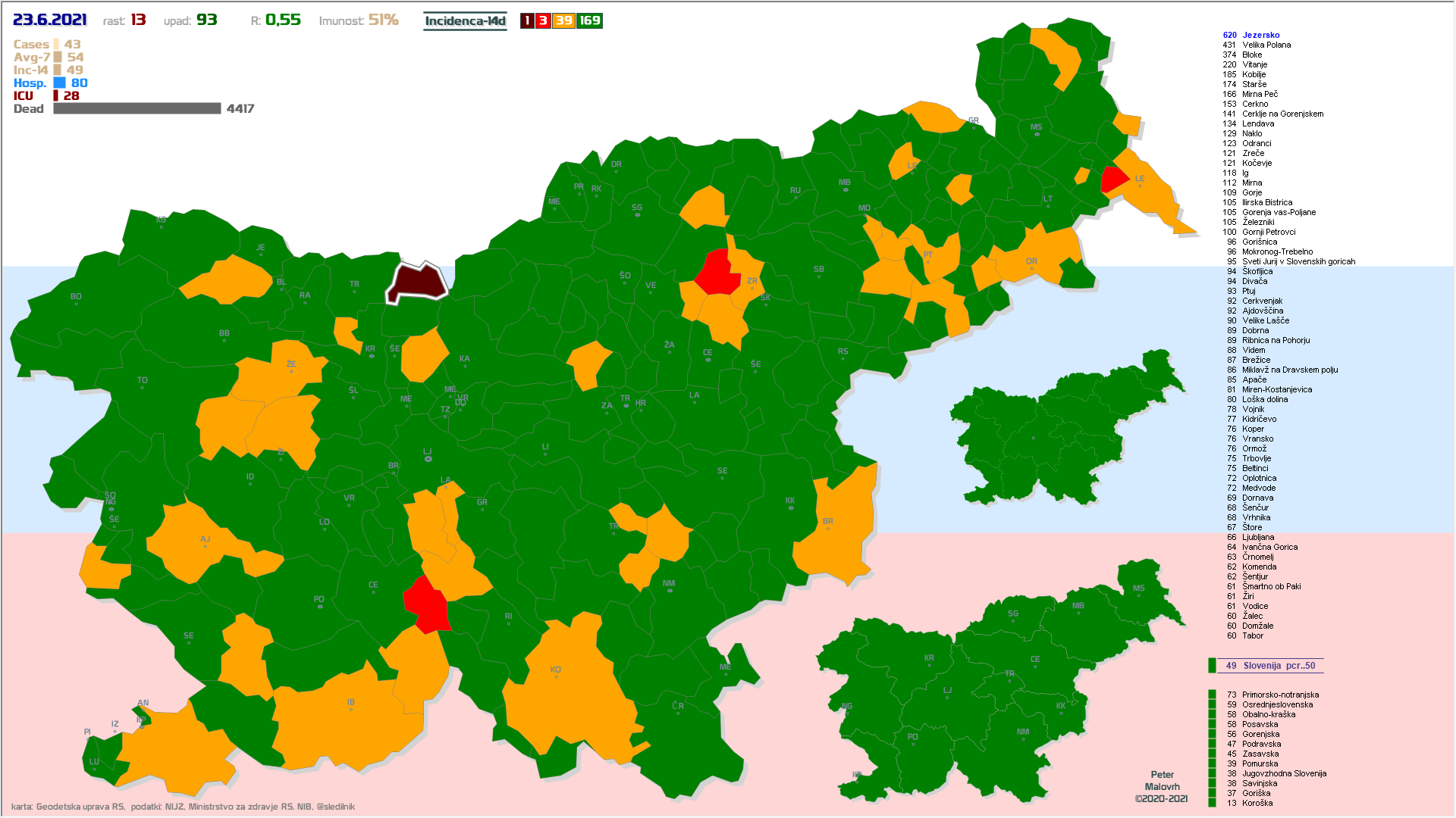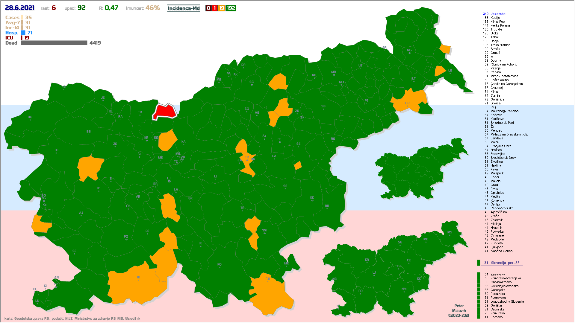 EU-zelena: vseh 12 regij in 198 občin, EU-oranžna: 13 občin, EU-rdeča: 1 občina (Jezersko) (podatki od včeraj)