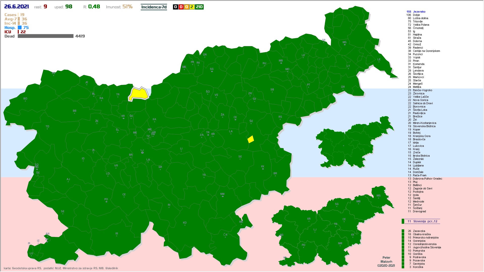 SLO-zelena: vseh 12 regij in 211 občin, SLO-rumena: 1 občina (Dobje) (podatki od včeraj)