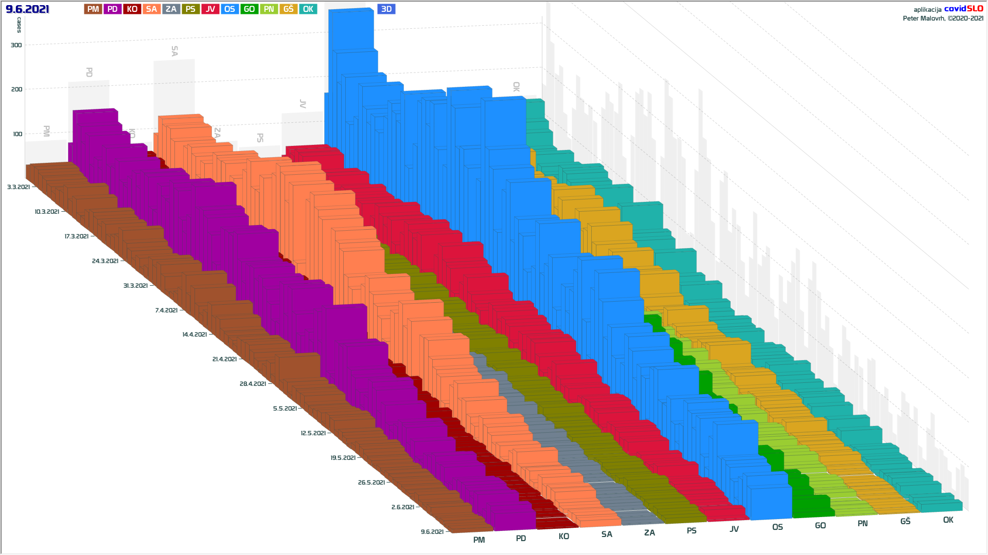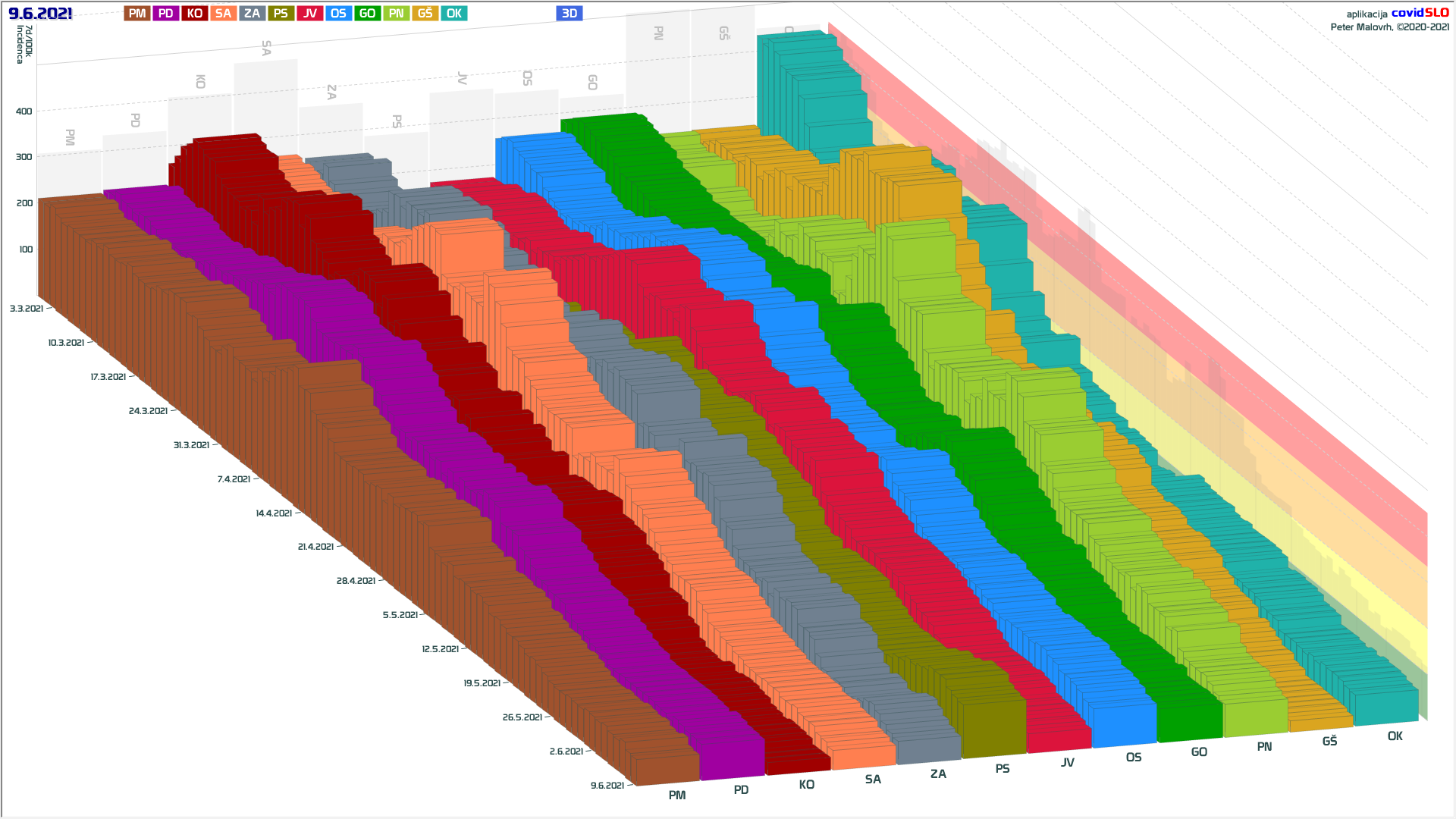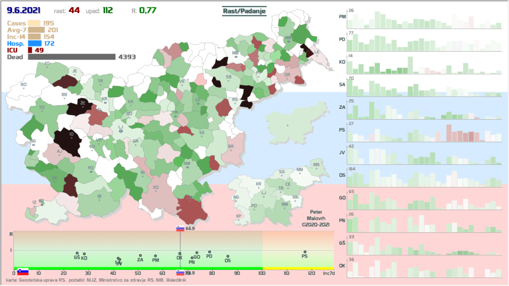 9 zelenih regij (KO, SA, PM, PS, GŠ, PD, GO, od danes OK in JV), 3 rumene regije (OS, ZA, PN)