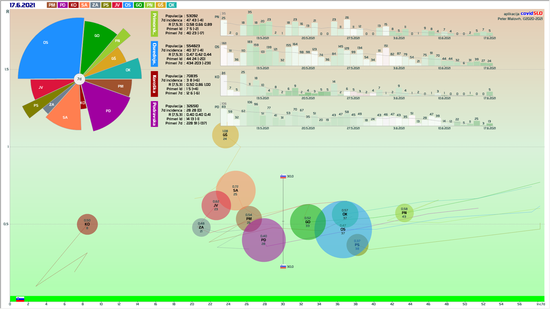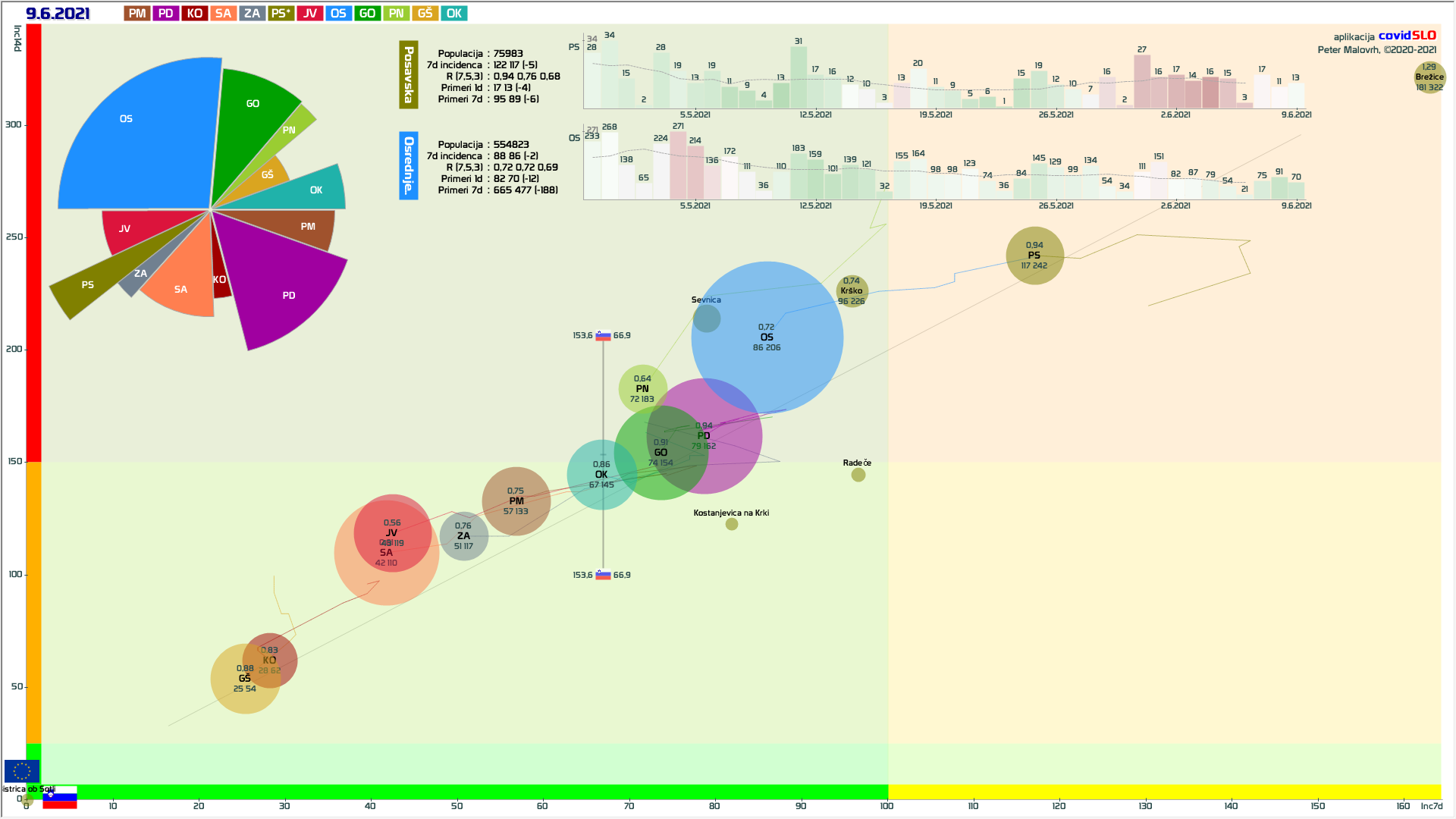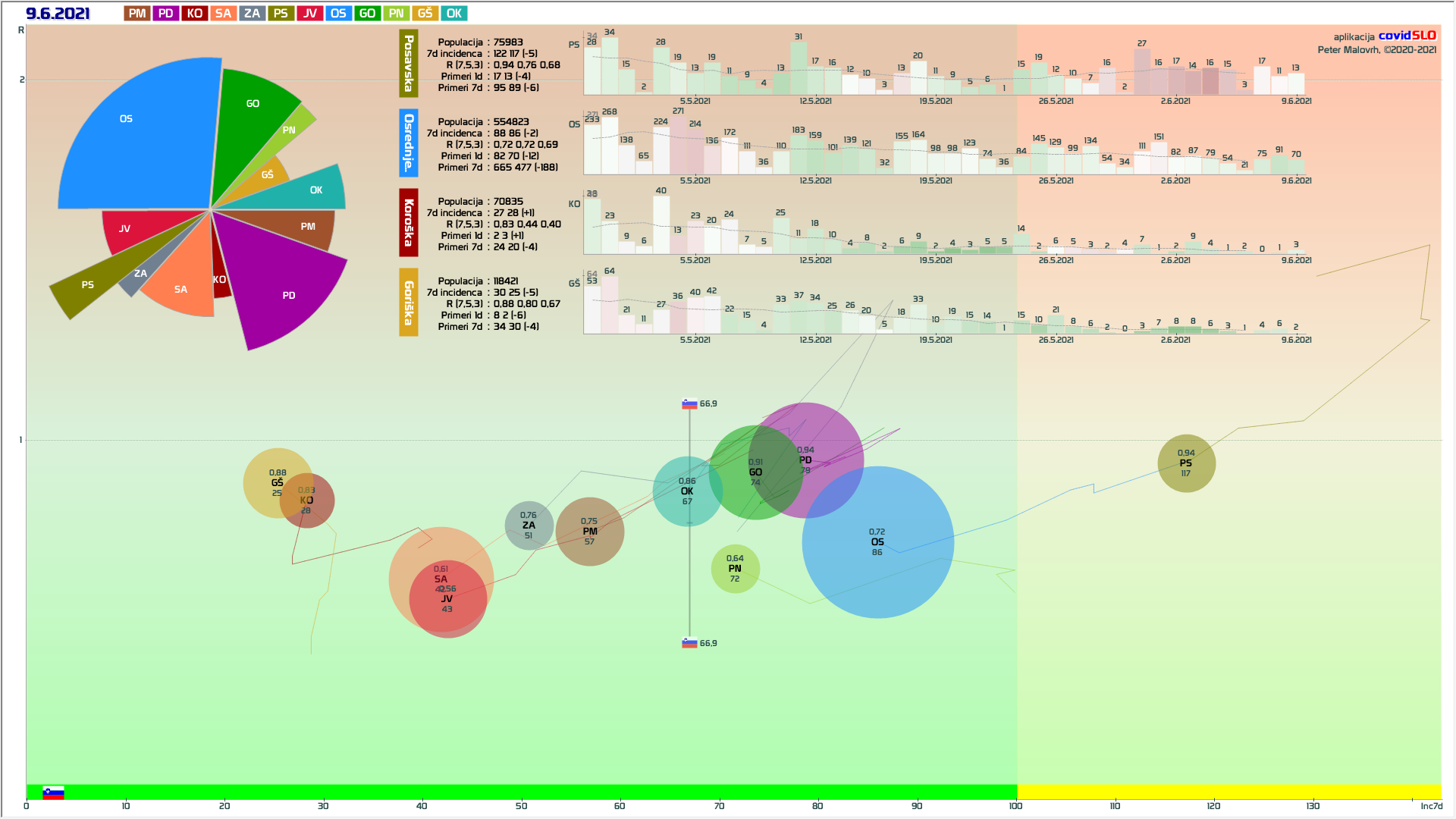 9 zelenih regij (KO, SA, PM, GŠ, PD, GO, OK, JV, ZA), 3 rumene regije (OS, PN, od danes PS)