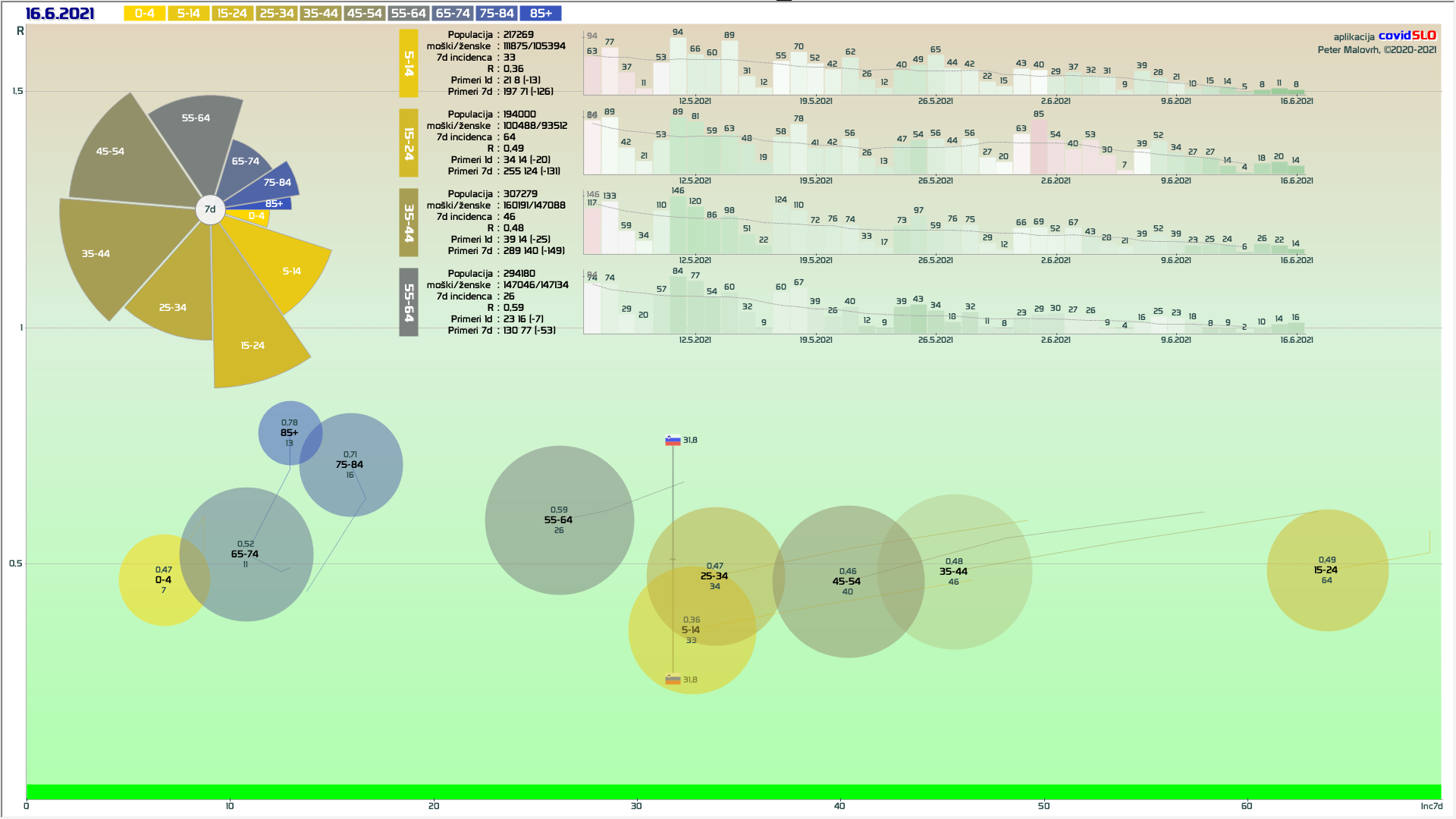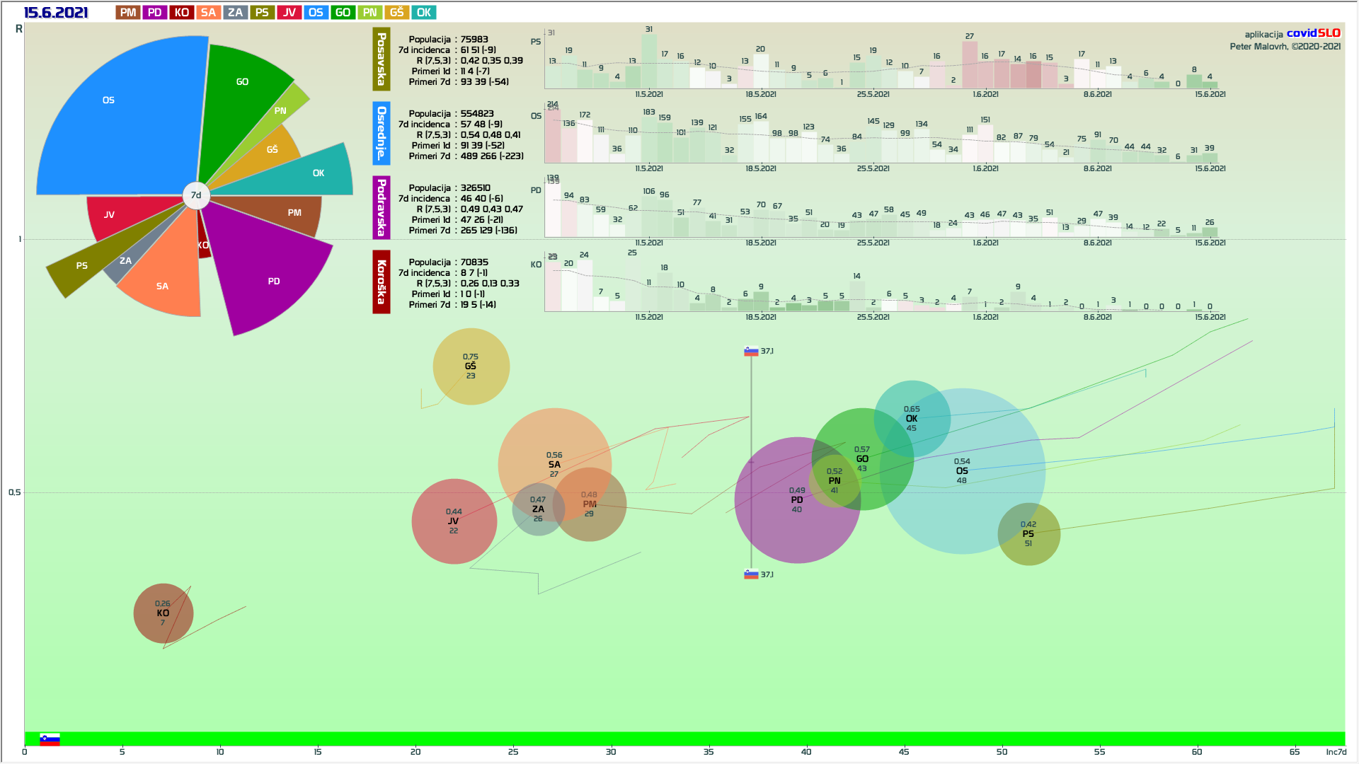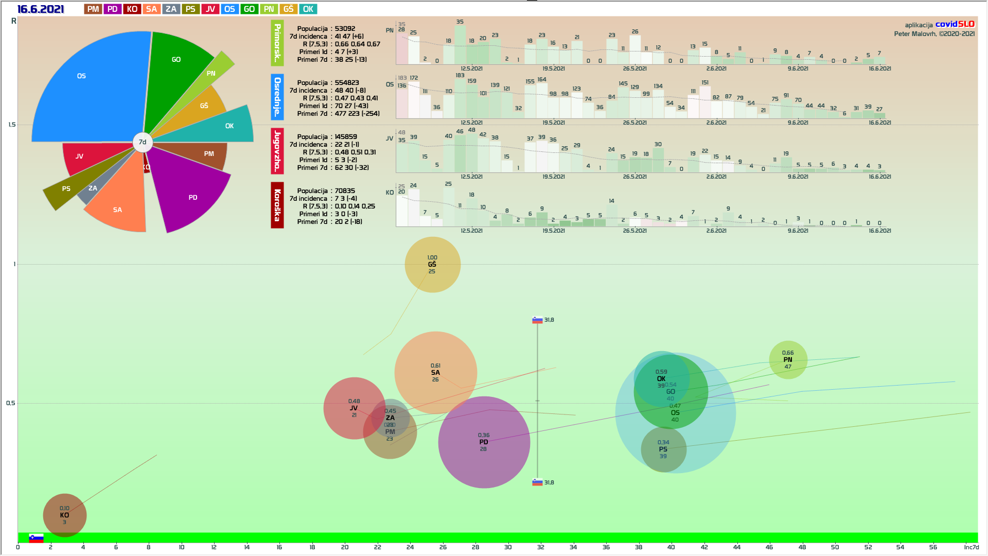 R (izračunan za en teden nazaj) je 0.45 (90% teže na R iz števila primerov, 10% iz deleža pozitivnih). (pozor: praznik 25.6.)