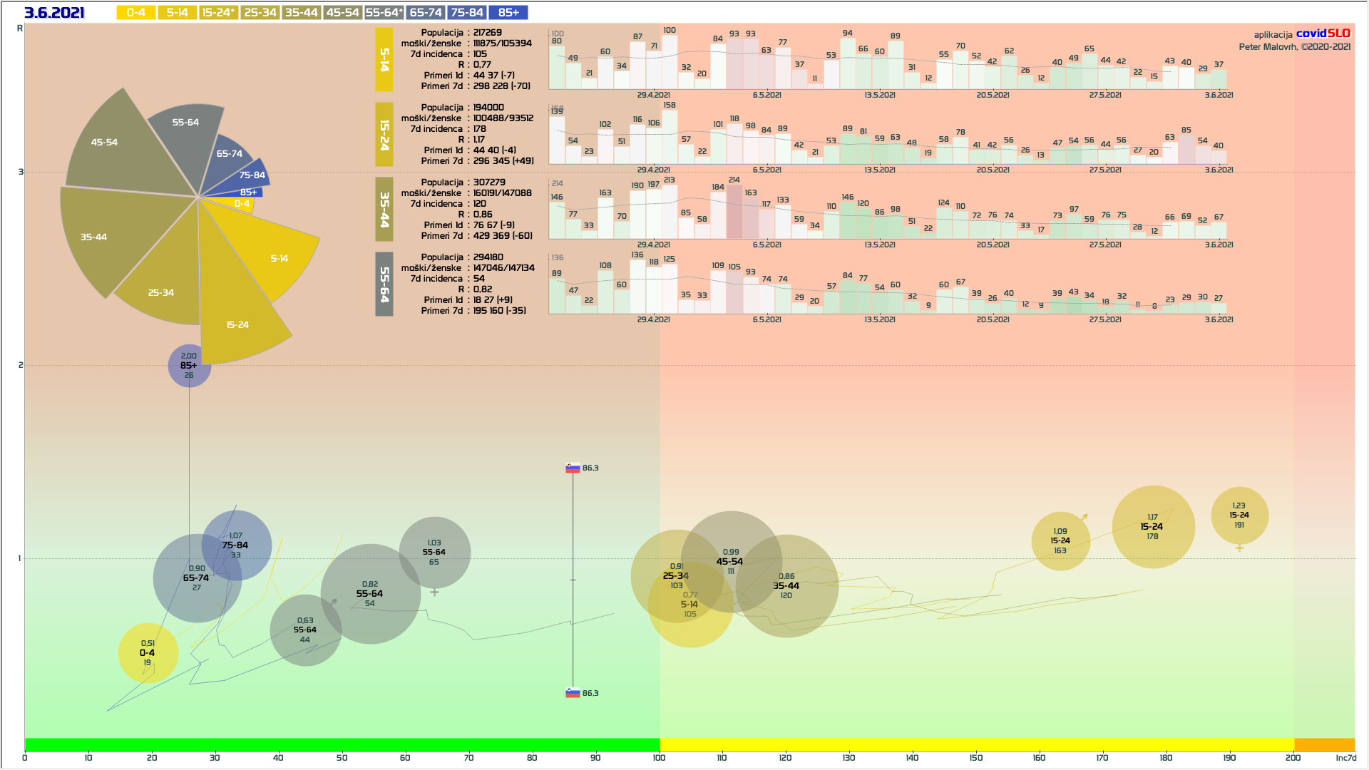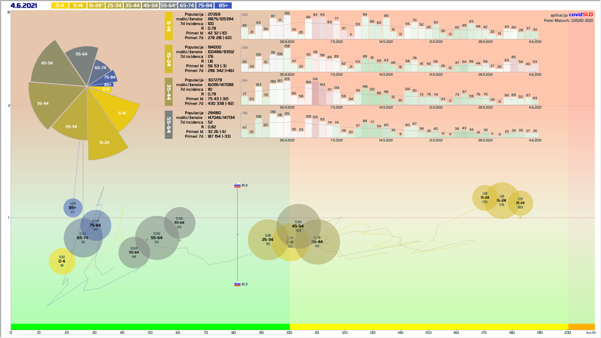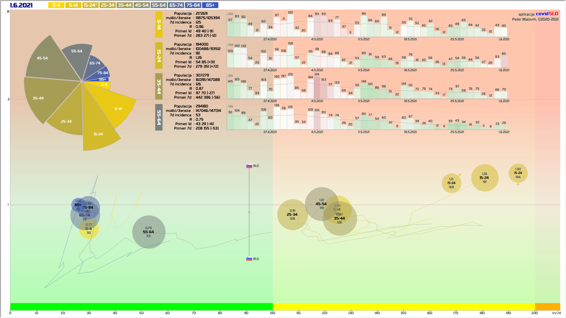 R (izračunan za en teden nazaj) je 0.45 (90% teže na R iz števila primerov, 10% iz deleža pozitivnih). (pozor: praznik 25.6.)