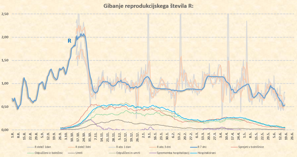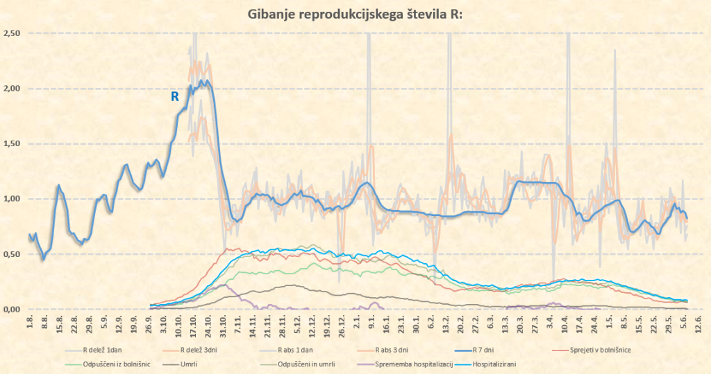 R se je po pričakovanju ustalil malce nad nivojem 0.50. Zaradi nizkega števila primerov in povečevanja deleža importiranih primerov ter primerov neznanega izvora pa R sedaj počasi postaja neregularen. Ocena stopnje lokalnega širjenja bo sedaj vse bolj nezanesljiva. Število primerov se bo ustalilo na neki “poletni” ravni, ki bo samo še malo nižja od trenutne. Vrednost našega klasičnega R iz medtedenskih primerjav števila primerov bo tako pričela v kratkem neregularno naraščati.