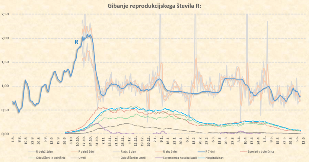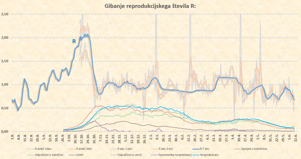 Ni perfektno znanstveno, ampak na osnovi marčevskega poročanja in dogajanja okoli alfe sklepam, da smo že okoli 10.6.2021 imeli 2% delte pri novih okužbah. Delež te se hitro podvaja, kot se je že pri alfi glede na našo prejšnjo različico B.1.258.17. Glede na stanje v Italiji in Avstriji sklepam, da imamo trenutno pri nas že 10-20% delež delta različice pri trenutnih novih okužbah. Okoli 15.7.2021 tako pričakujem prve znake delovanja delte na naš R, ki bo takrat pričel naraščati. Sklepam, da bo iz sedanjih okoli 0.50 do konca julija narastel na 0.70-0.80, kar nam ne bo povzročilo nobenih težav. Lahko pa skok R preko 1 pričakujemo že na prehodu iz avgusta v september. Število primerov bo takrat kar opazno pričelo naraščati, se pa zaradi visoke takratne okoli 70-75’% imunosti prebivalstva (prekuženost+precepljenost) bolnišnice ne bi smele kaj dosti polniti.