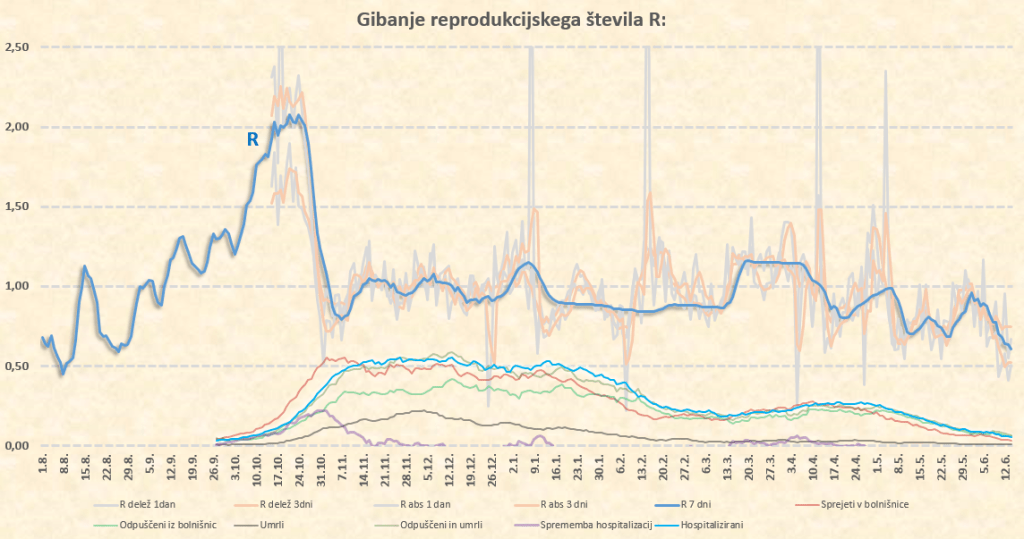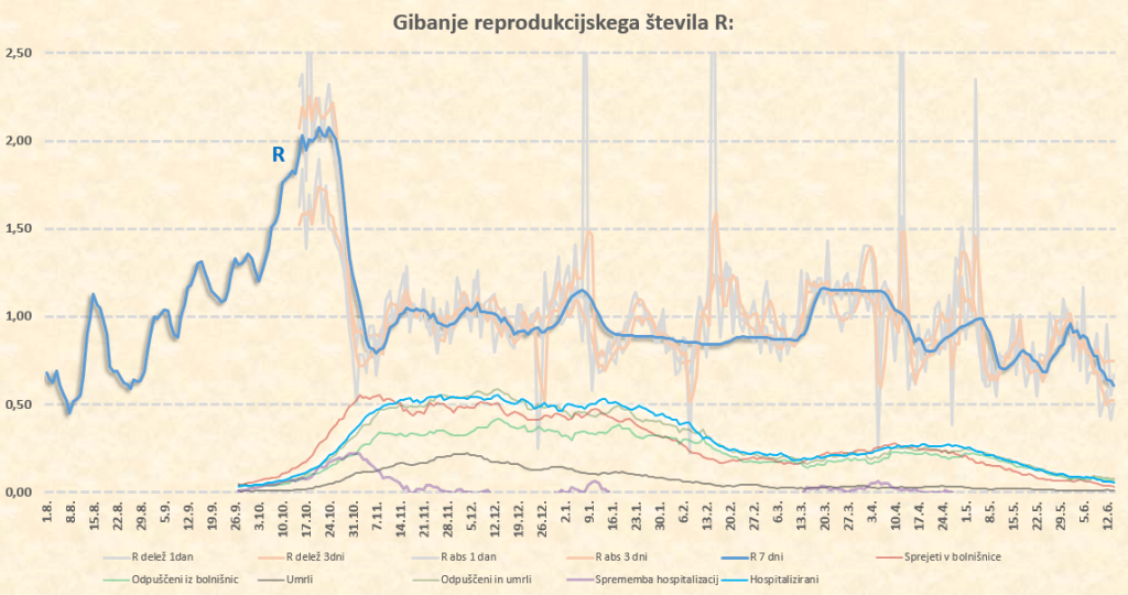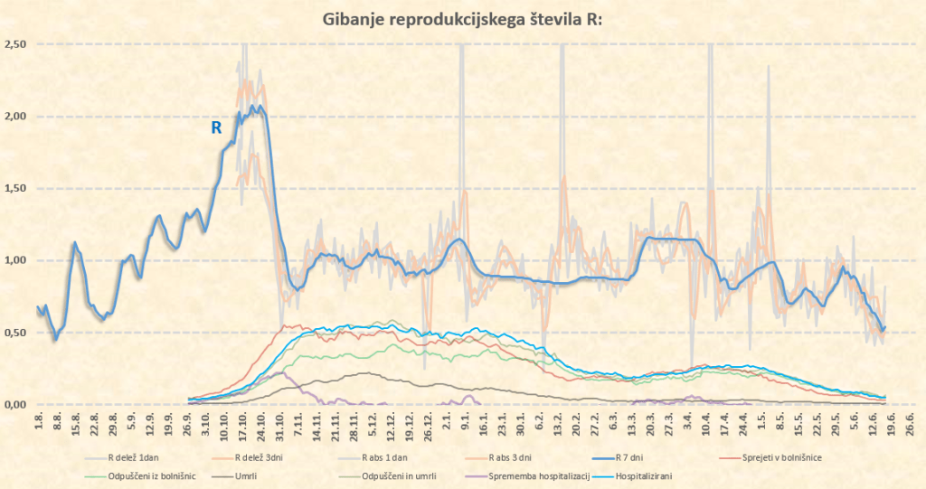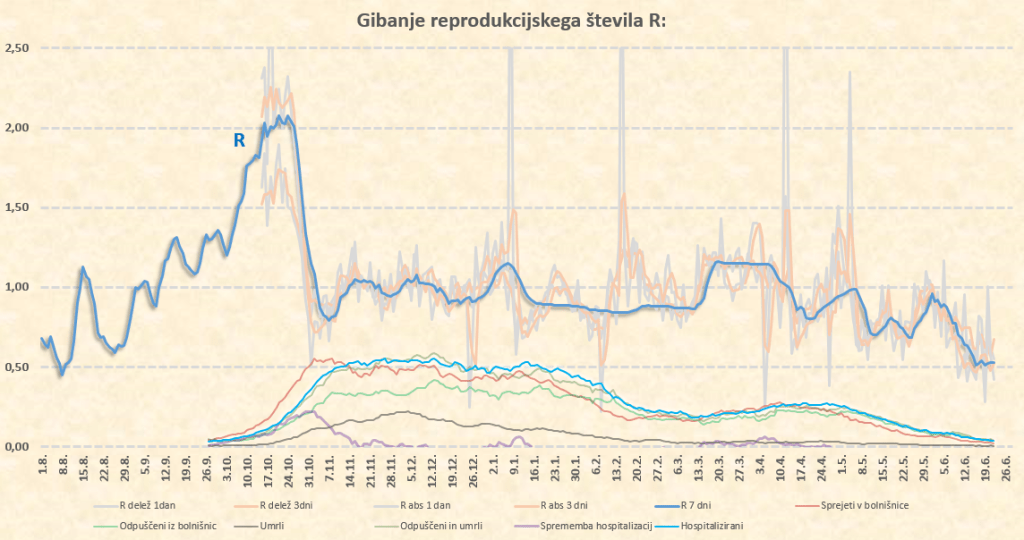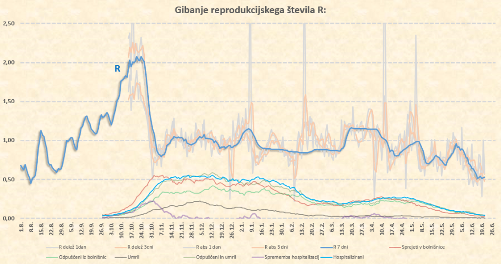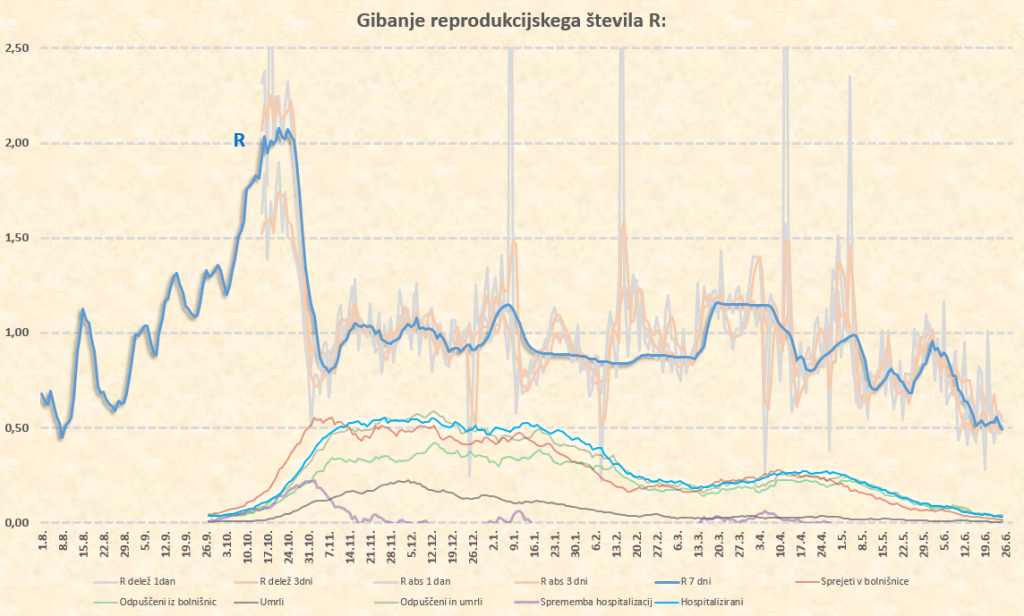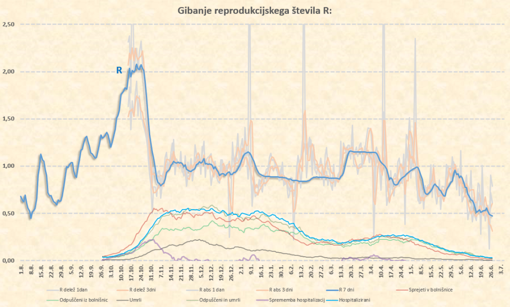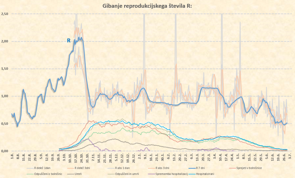 Okoli 10.7.2021 tako pričakujem prve znake delovanja delte na naš R, ki bo takrat pričel naraščati. Sklepam, da bo iz sedanjih okoli 0.50 do konca julija narastel na 0.70-0.80, kar nam ne bo povzročilo nobenih težav. Lahko pa skok R preko 1 pričakujemo že na prehodu iz avgusta v september. Število primerov bo takrat kar opazno pričelo naraščati, se pa zaradi visoke takratne okoli 70-75’% imunosti prebivalstva (prekuženost+precepljenost) bolnišnice ne bi smele kaj dosti polniti.